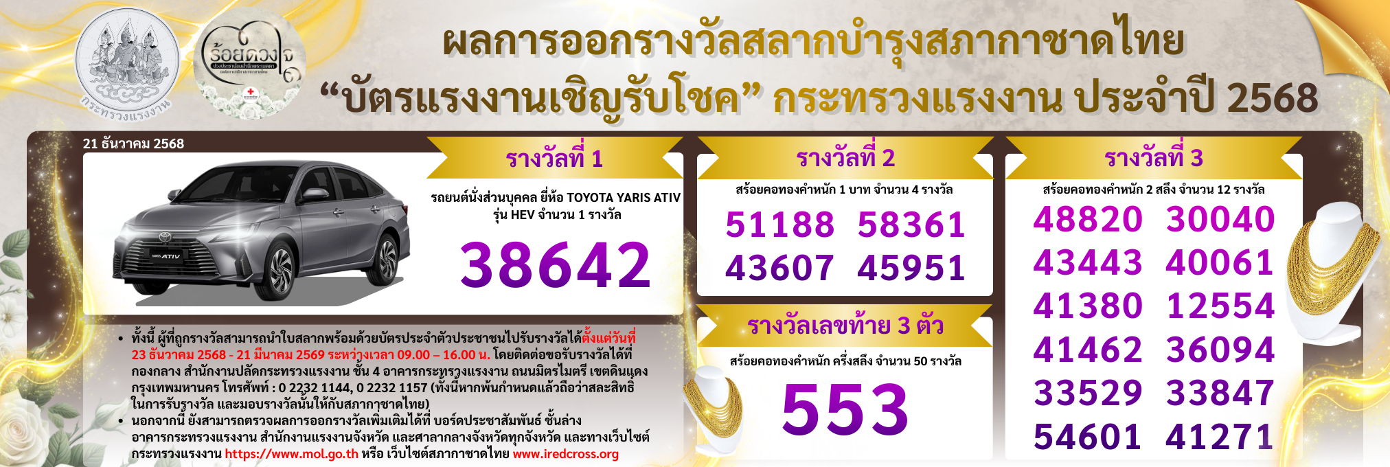 ผลการออกรางวัลสลากบำรุงกาชาดไทย กระทรวงแรงงาน ประจำปี 2568