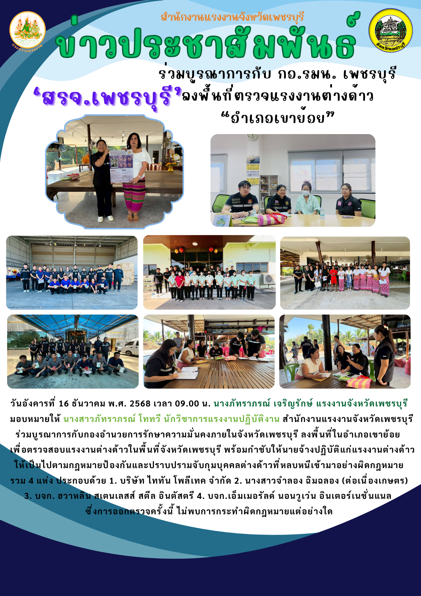 วันอังคารที่ 16 ธันวาคม พ.ศ. 2568 เวลา 09.00 น. นางภัทราภรณ์ เจริญรักษ์ แรงงานจังหวัดเพชรบุรี มอบหมายให้ นางสาวภัทราภรณ์ โททวี นักวิชาการแรงงานปฏิบัติงาน สำนักงานแรงงานจังหวัดเพชรบุรี ร่วมบูรณาการกับกองอำนวยการรักษาความมั่นคงภายในจังหวัดเพชรบุรี ตรวจคนเข้าเมือง ลงพื้นที่ในอำเภอเขาย้อย เพื่อตรวจสอบแรงงานต่างด้าว ในพื้นที่จังหวัดเพชรบุรี พร้อมกำชับให้นายจ้างปฏิบัติแก่แรงงานต่างด้าวให้เป็นไปตามกฎหมายป้องกันและปราบปรามจับกุมบุคคลต่างด้าวที่หลบหนีเข้ามาอย่างผิดกฎหมาย รวม 4 แห่ง ประกอบด้วย 1. บริษัท ไททัน โพลีเทค จำกัด 2. นางสาวจำลอง ฉิมฉลอง (ต่อเนื่องเกษตร) 3. บจก. ฮวาหลิน สเตนเลสส์ สตีล อินตัสตรี 4. บจก.เอ็มเมอรัลด์ นอนวูเว่น อินเตอร์เนชั่นแนล ซึ่งการออกตรวจครั้งนี้ ไม่พบการกระทำผิดกฎหมายแต่อย่างใด
