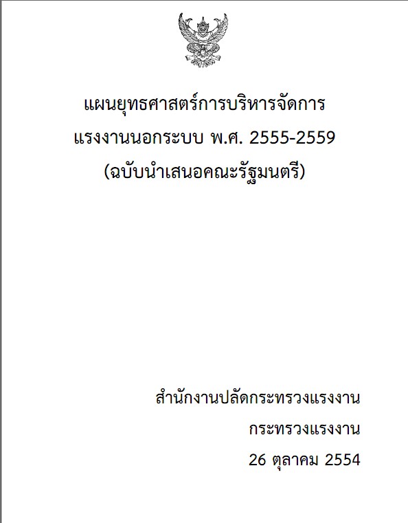 แผนยุทธศาสตร์การบริหารจัดการแรงงานนอกระบบ พ.ศ.2555-2559 (ฉบับคณะรัฐมนตรีให้ความเห็นชอบ เมื่อวันที่ 29 พฤศจิกายน 2554) |