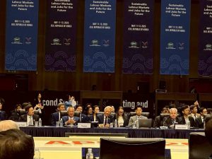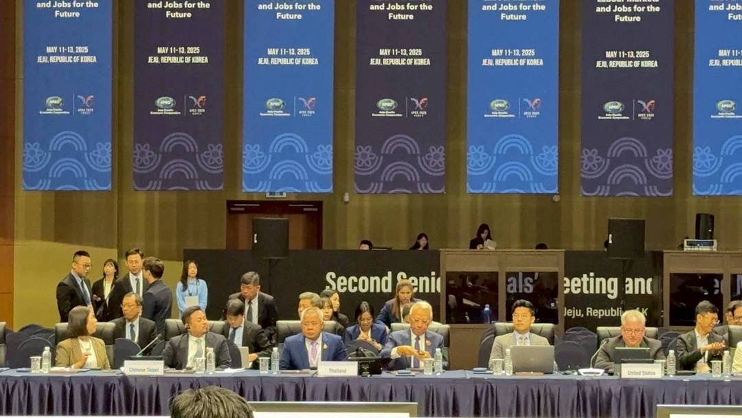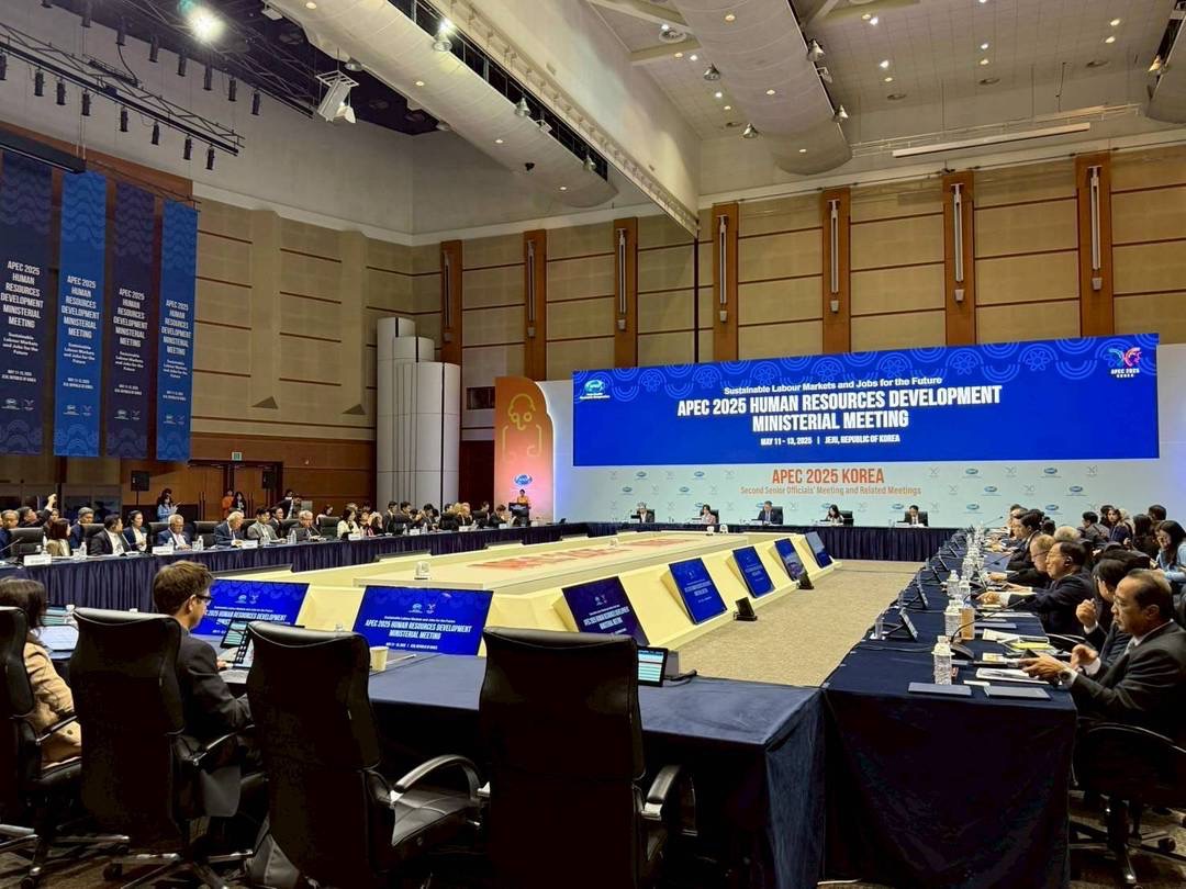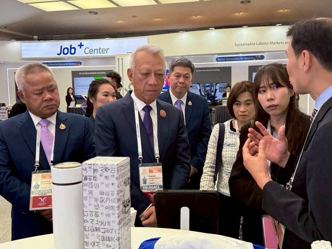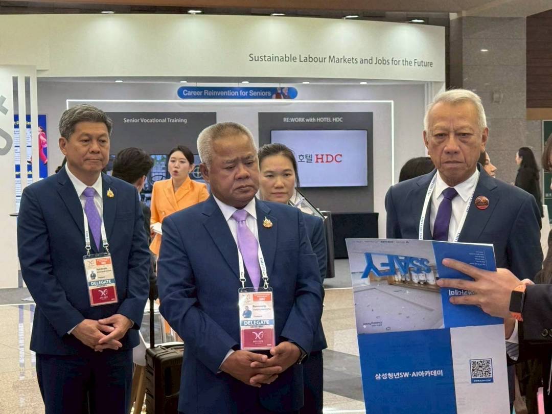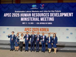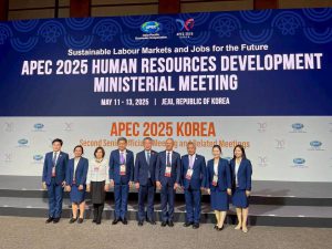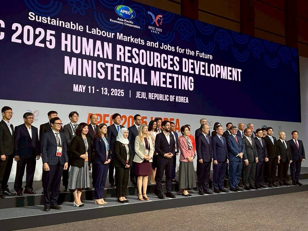 May 12, 2025 – Mr. Phiphat Ratchakitprakarn, Minister of Labour, represented Thailand at the APEC Human Resources Development Ministerial Meeting (APEC HRDMM 2025) in Jeju, South Korea. He was joined by Mr. Boonsong Thapchaiyut, Permanent Secretary of Labour, Mr. Sakdinart Sonthisakyotin, Assistant to the Permanent Secretary of Labour, Mrs. Sirirat Srichart, Labour Minister-Counsellor at the Royal Thai Embassy in Seoul, and the delegation. The Labour Minister presented proactive approaches to preparing the workforce for the future, under the themes “Flexible and Dynamic Labor Markets” and “Active Labor Market Policies (ALMPs) for the Future of Work”.