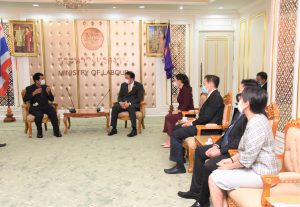 The President of the Thai Airways International Labour Union and committee led a team to meet with Labour Minister Mr. Suchart Chomklin, to give a basket and to thank the government and the Ministry of Labour for helping to protect the rights under the labour law due to the change of employment conditions by Thai Airways. The issues have been resolved under the labour protection law framework to satisfy Thai Airways employees and unions.