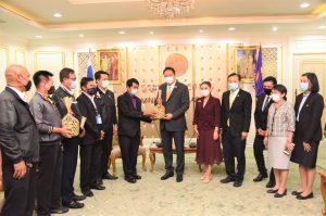 On March 17, 2021, at the Chatumongkol Room, 6th floor, Ministry of Labour, Labour Minister Mr. Suchart Chomklin welcomed President of the Thai Airways International Labour Union, Mr. Siripong Sukrakarnchanachoke, and a committee of 9 people. The visiting delegation met the Labour Minister to give a basket of flowers to thank the government and the Ministry of Labour for protecting the rights under the labour law due to the change of employment conditions by Thai Airways International. Advisor to the Labour Minister, Mrs. Thiwalrat Angkinan, Permanent Secretary of Labour Mr. Suthi Sukosol, and the Ministry of Labour’s executives joined the occasion. Several issues and conflicts about changing the new employment conditions following Thai Airways International’s relaunch project, conflicts in the amendment of the provident fund regulations, and other problems according to the company’s business rehabilitation plan were cared for and resolved quickly through negotiations. Labour Minister Mr. Suchart Chomklin, Advisory Board Member to the Labour Minister Mrs. Thienrat Navamawat, the Department of Labour Protection and Welfare’s Director-General Mr. Apinya Sucharitanan, the Deputy Director-General of the Department of Labour Protection and Welfare Mr. Wannarat Srisuksai, Director of Labour Relations Ms. Radklao Chaowalit, senior executives from the Department of Labour Protection and Welfare, as well as relevant officials, were part of the process.