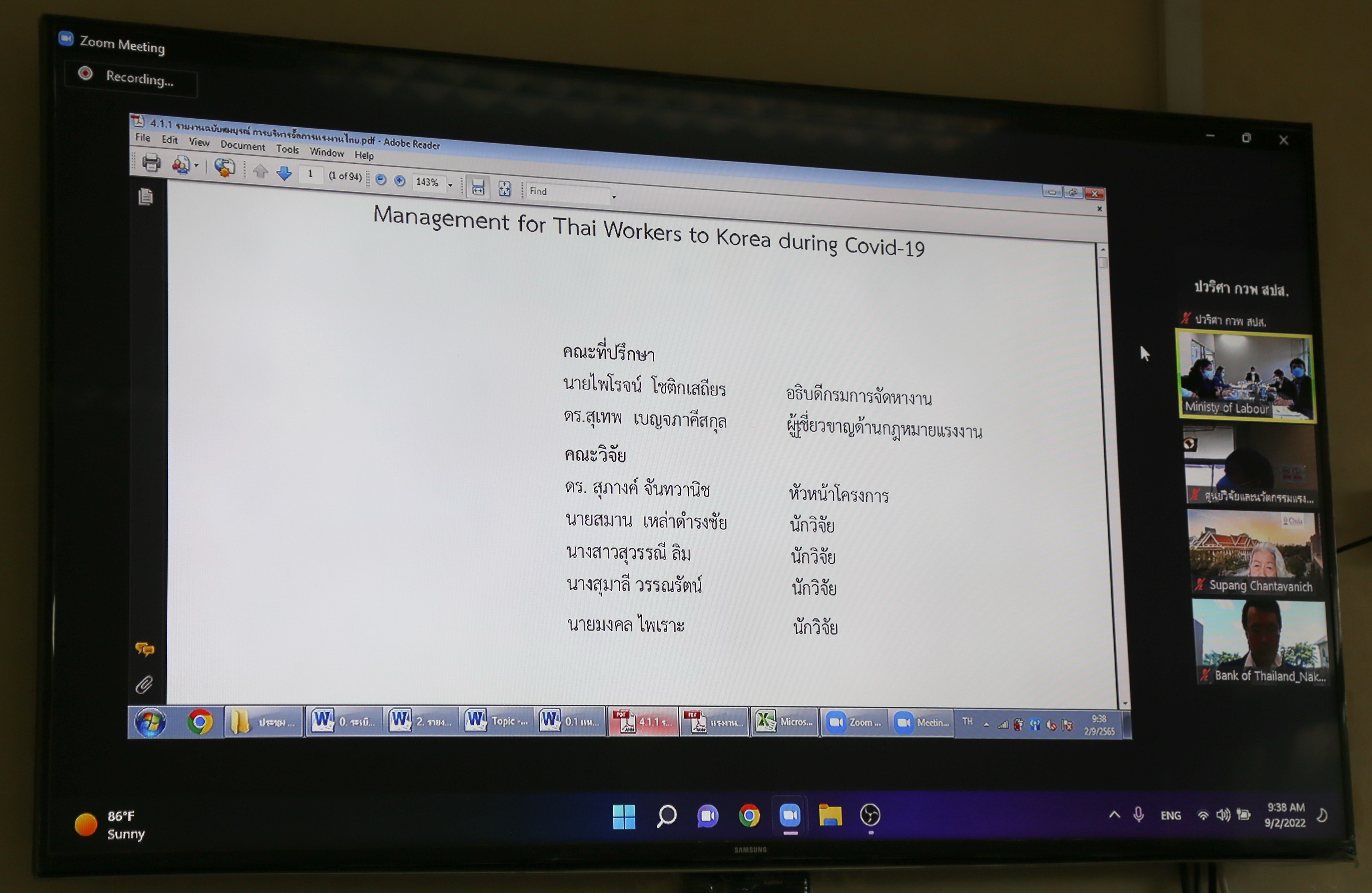 On September 2, 2022, at 09.30 hours, Assistant to the Permanent Secretary of Labour, Mr. Samat Pattamasukon, chaired the Research Advisory and Review for Academic Work to be Published in the National Labour Research Center Committee Meeting No. 3/2022. The meeting took place at the Network Support and Regional Coordination Group meeting room, 2nd floor, Ministry of Labour.