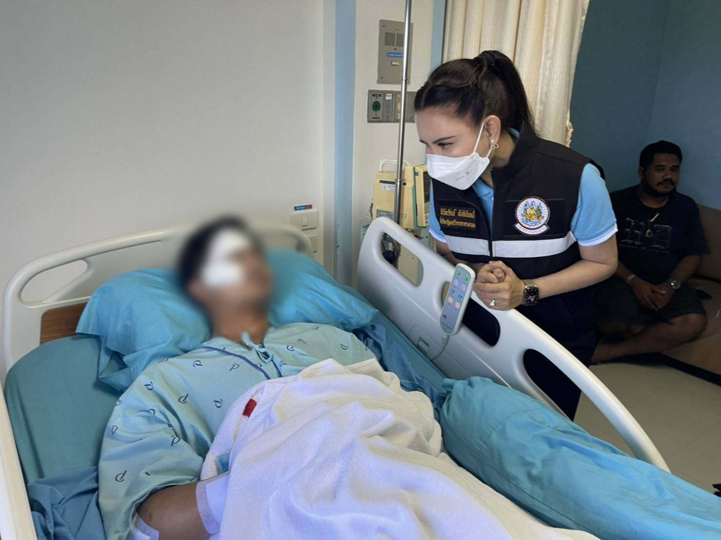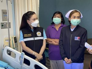 The Labour Minister’s Advisor, Mrs. Thiwalrat Angkinan, revealed that the Labour Minister, Mr. Suchart Chomklin, is concerned about the insured persons who were involved in the incident. He assigned people to visit the area to give gifts to raise the morale of the insured persons who were injured in the car accident, where a Fortuner collided with an electric pole on Thursday, August 18, causing one death and two injuries. The accident took place in Khao Yoi District, Phetchaburi Province. According to the investigation, the accident consisted of Mr. Karan Supakitvilakarn, the Director of the Pidthong Institute for Promotion and Development, following the Royal Initiative, and former Chumphon Governor. He died (not an insured person). Mr. Damrongsak Luangkrai, the driver (an insured person), was injured in his abdomen and neck area. He is receiving treatment at Petcharat Hospital. The third person was Mr. Chamroen Yuttitham (a pensioner), working with the establishment of Pidthong Lang Phra Foundation following the Royal Initiative, under the responsibility of the Bangkok Social Security Office Area 1. From initial coordination, it was known that all were on their way to perform their duties, which is considered an injury because of working, which falls under entitlement of the Compensation Fund. For the injured person, Mr. Damrongsak Luangkrai, insured under Section 33, the Phetchaburi Provincial Social Security Office has coordinated with the employer to submit a report of injury and a letter referring the employee to medical treatment. They also explained the Compensation Fund’s benefits, including medical expenses and compensation for loss of income. They coordinated with the Bangkok Social Security Office Area 1 to complete the relevant actions. She also paid a visit to the injured insured at Petcharat Hospital. Dr. Thanong Soonthornpakornkit, Director of Mahachai Petchararat Hospital, and medical personnel gave a welcome.