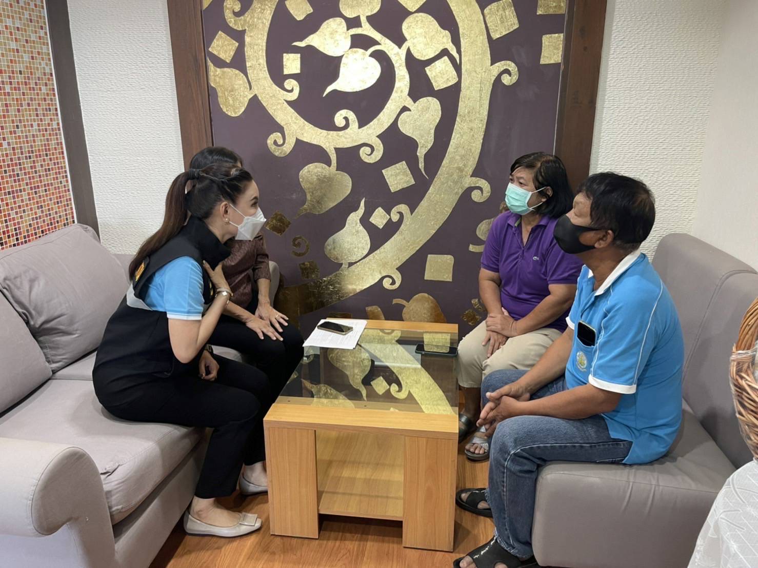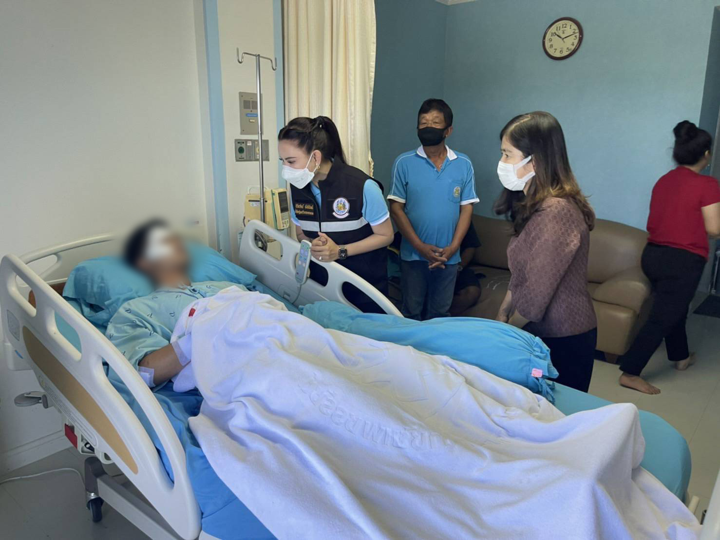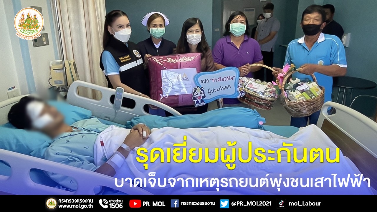 On August 19, 2022, at 10.00 hours, the Labour Minister, Mr. Suchart Chomklin, assigned the Labour Minister’s Advisor, Mrs. Thiwalrat Angkinan, and Phetchaburi Social Security Officer Mrs. Rassamee Sujato, to visit insured persons who were injured in a car accident, where a Fortuner lost control and collided with an electric pole, causing one fatality and two injured persons.