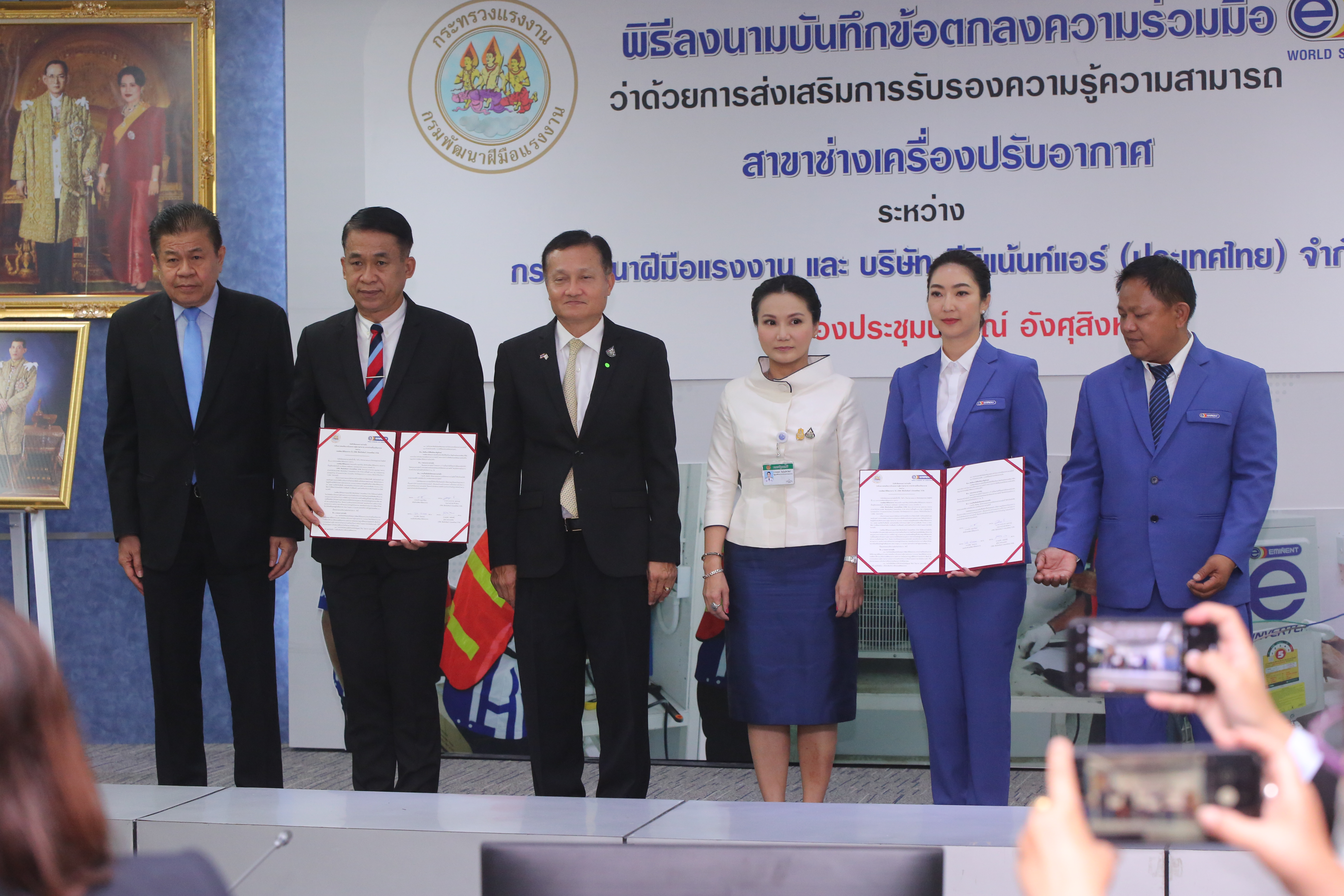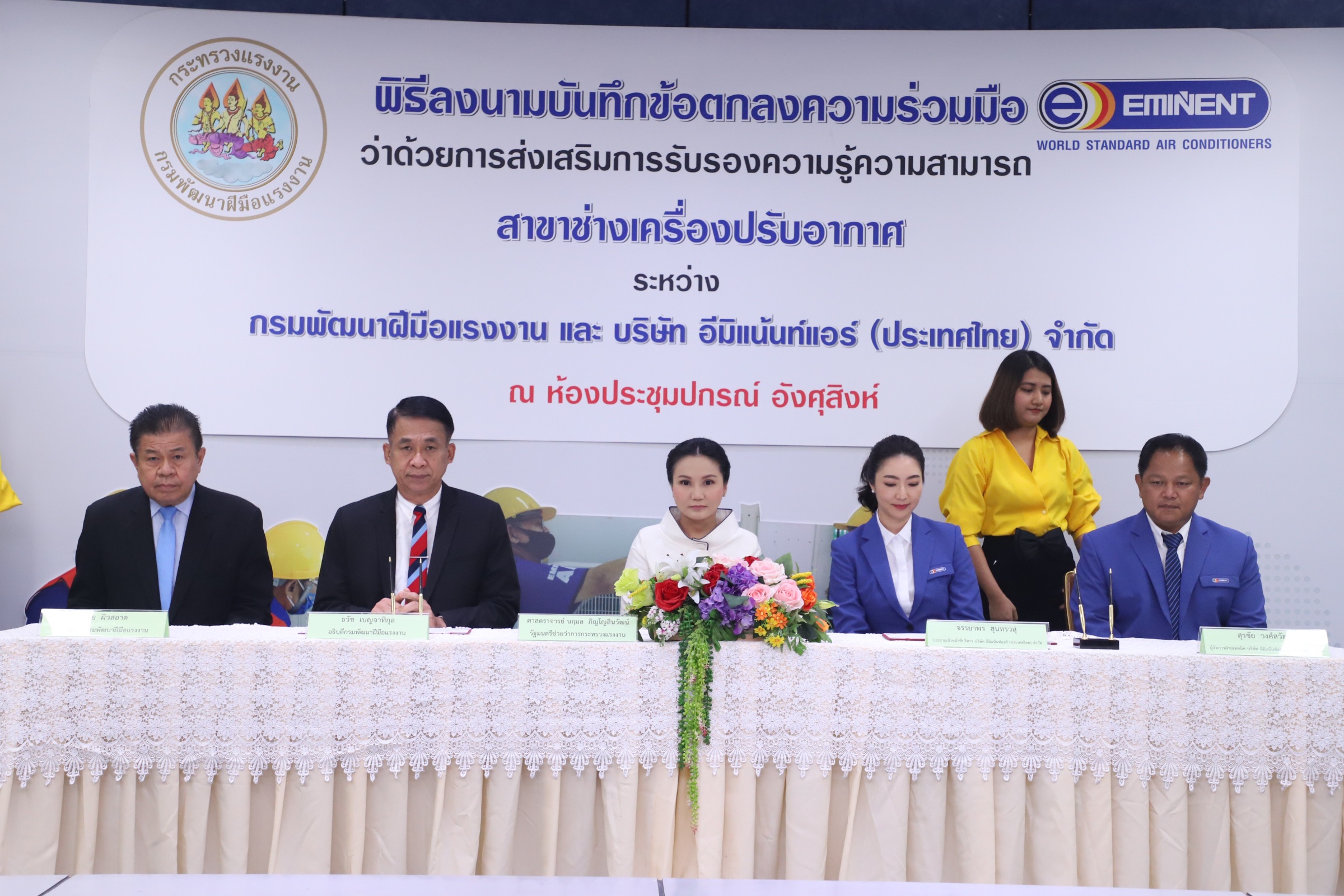 On September 9, 2020, at the Pakorn Angsusing Meeting Room, 10th floor, Department of Skill Development. Deputy Labour Minister Prof. Narumon Pinyosinwat presided over the signing of the Memorandum of Understanding on the Promotion of Certification of Knowledge and Capabilities in the air conditioning technician branch between the Department of Skill Development’s Director-General Mr. Tawat Benchatikul and Chief Executive Officer Eminent Air (Thailand) Co., Ltd Ms. Chanyaporn Sunthornwasu. The Department of Skill Development’s Director-General Mr. Vichai Piwsaard, and Technical Manager Mr. Surachai Wongsawat also witnessed the signing.