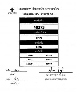 Winners can take the tickets, together with their ID card, to receive the prize from December 28, 2021, to March 26, 2022, from 09.00 to 16.00 hours. Winners can contact the Ministry of Labour’s Office of the Permanent Secretary, 4th floor, Ministry of Labour, Mitmaitri Road, Din Daeng, Bangkok, call 02232 1144, 02232 1157 (prizes not claimed within this time are considered a waiver of the right to receive the award. The award will be given to the Thai Red Cross). In addition, results of additional awards can be checked at the board on the ground floor of the Ministry of Labour, Provincial Labour Offices, the city hall in every province, and on the Ministry of Labour’s website: https://www.mol.go.th.