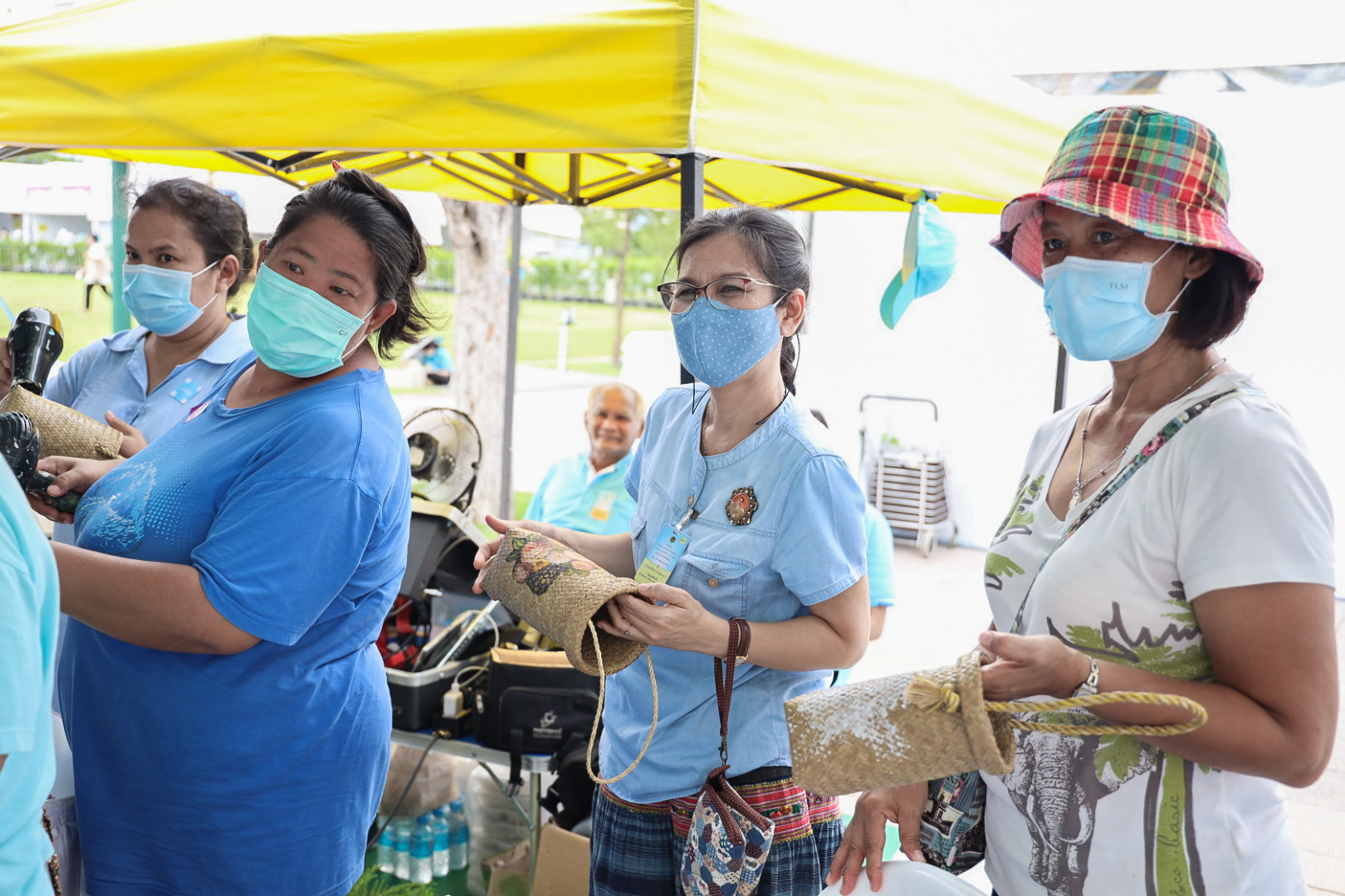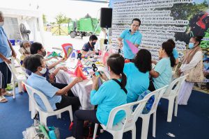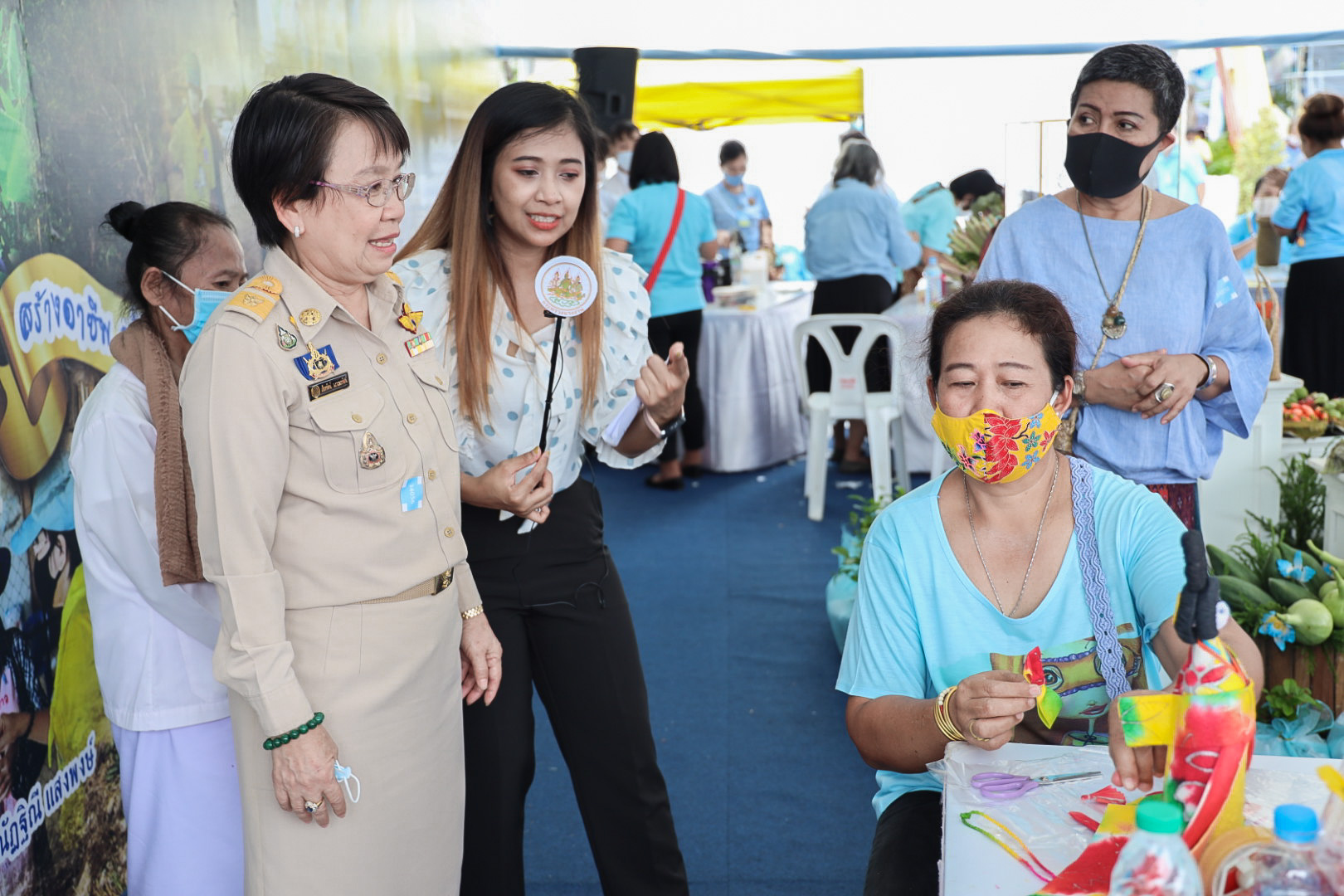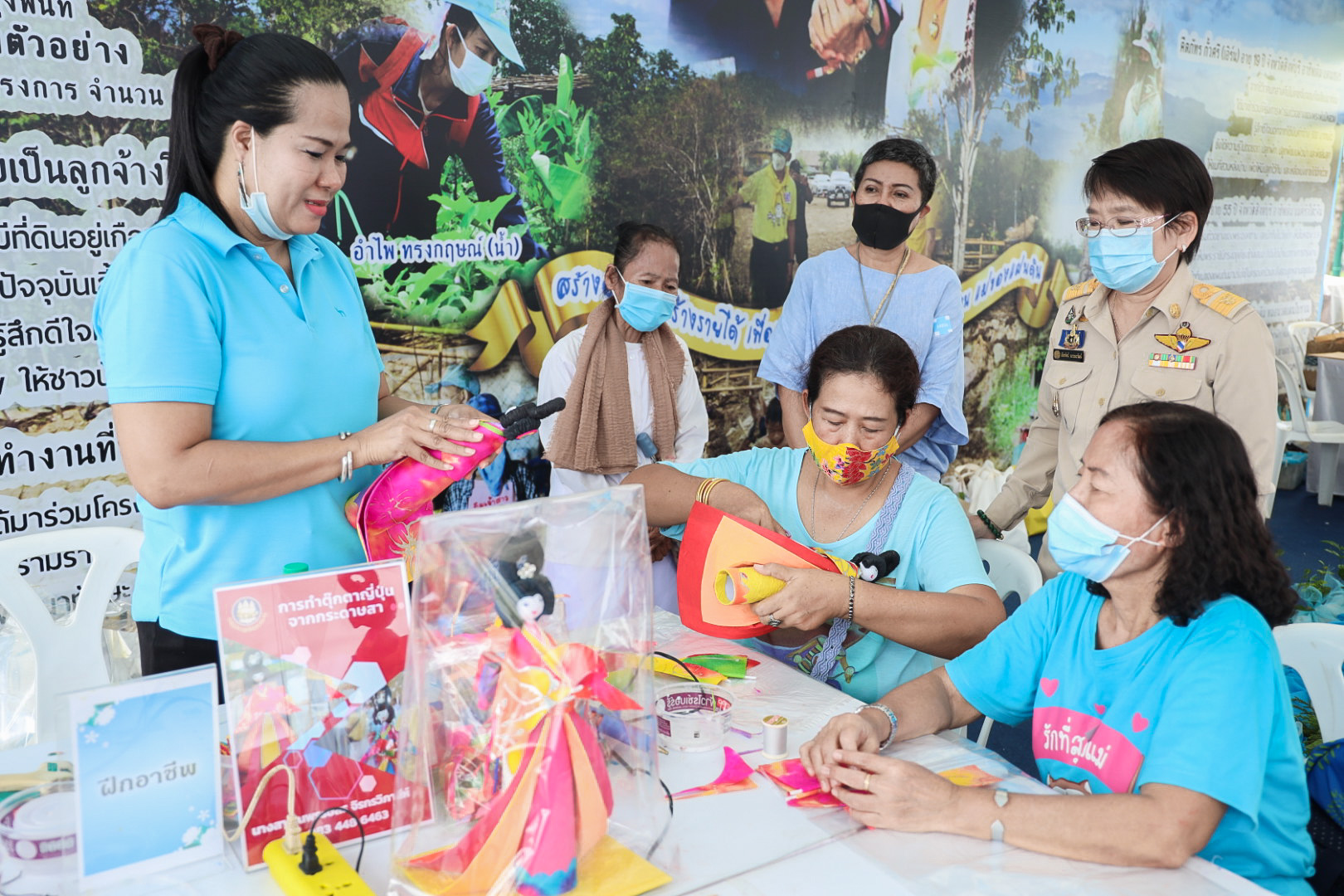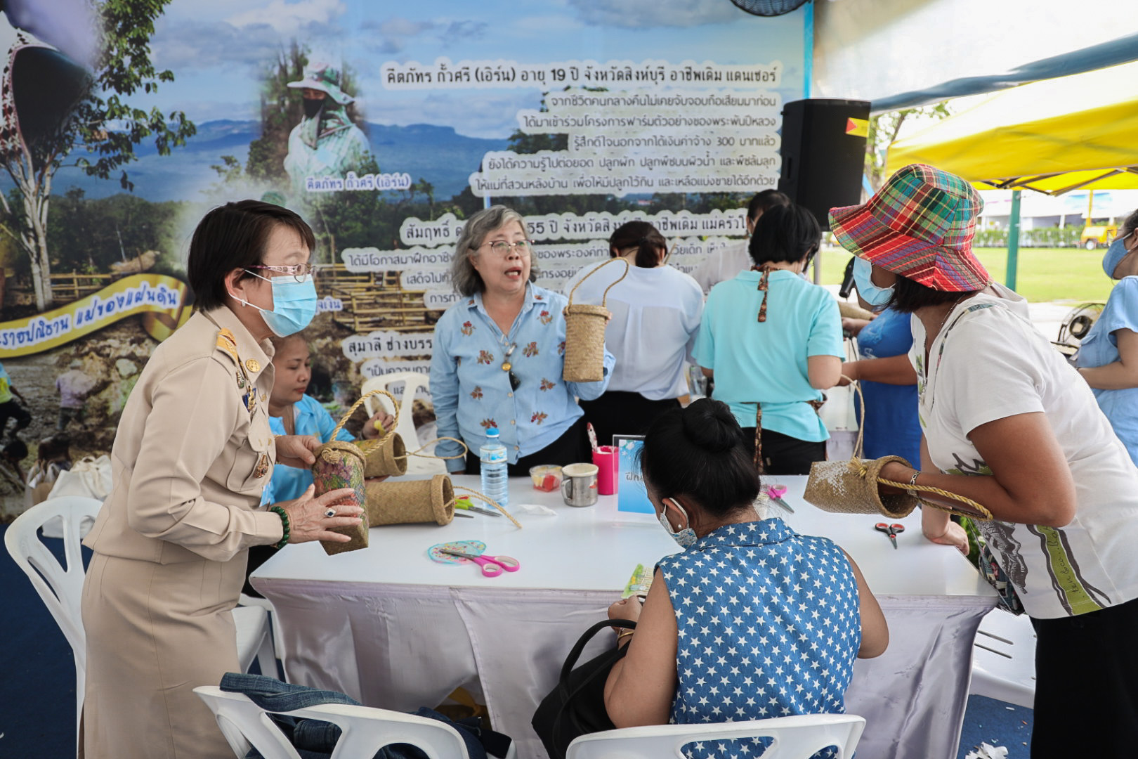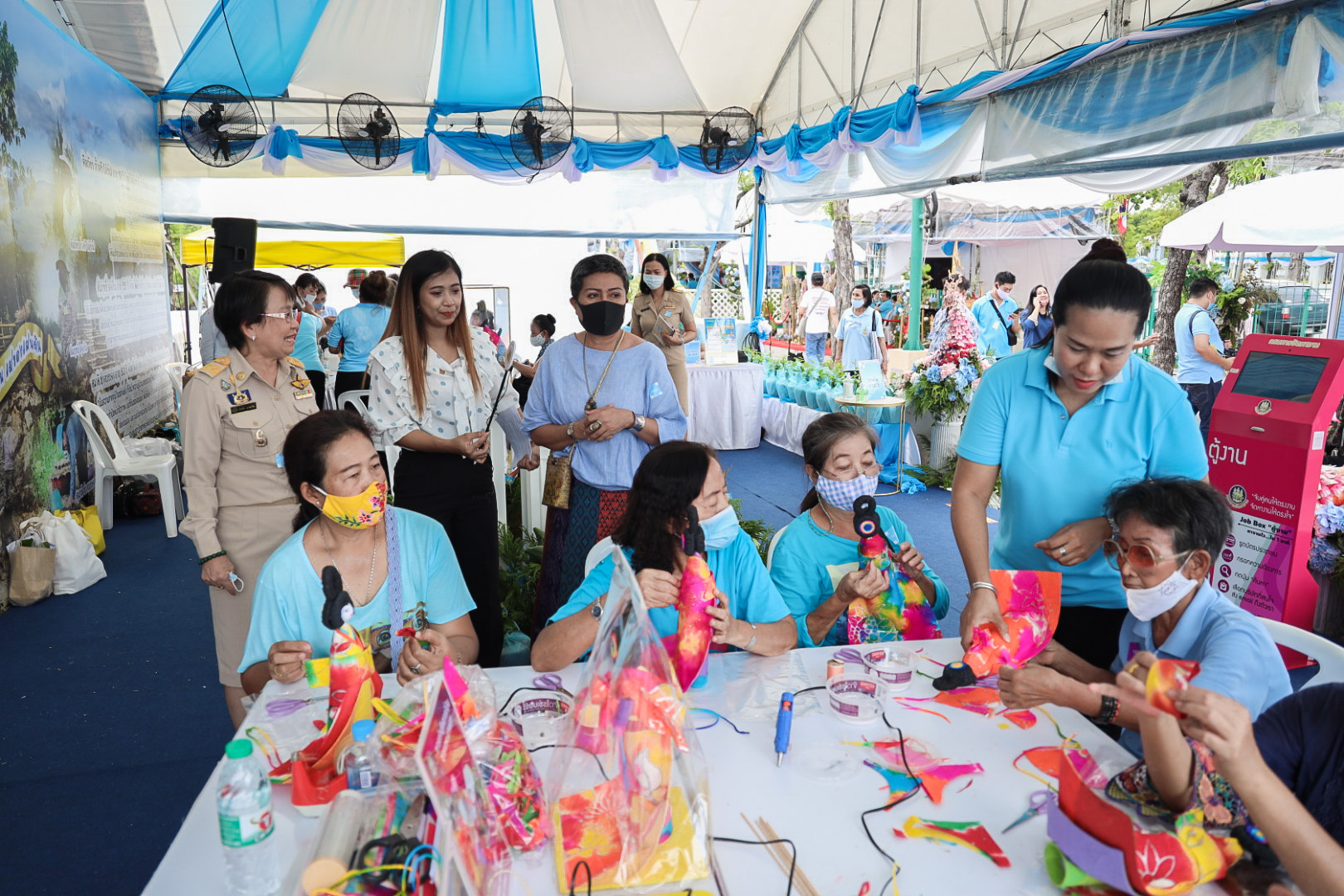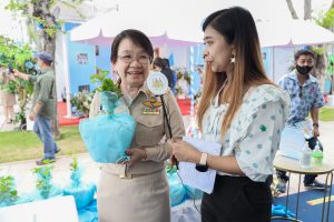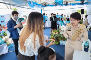 This activity is one in honor of HM Queen Sirikit, in which. Office of the Permanent Secretary, Office of the Prime Minister scheduled to be held between August 12 – 14, 2020, at Sanam Luang. Inside the booth of the Ministry of Labour included the Covid-19 Resistant Model Farm Project Phase 1, recruitment services through Job Box, demonstrations and vocational training such as making jasmine baskets, garland stringing with jasmine, making a bag of Krajood decorated with ribbons, making glass holders, colorful ribbons, painting, making decoupage and Japanese dolls from mulberry paper for example. There was also a labour counseling provided by “labour lawyers” and applications for insured persons under Section 40 as well.