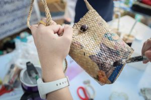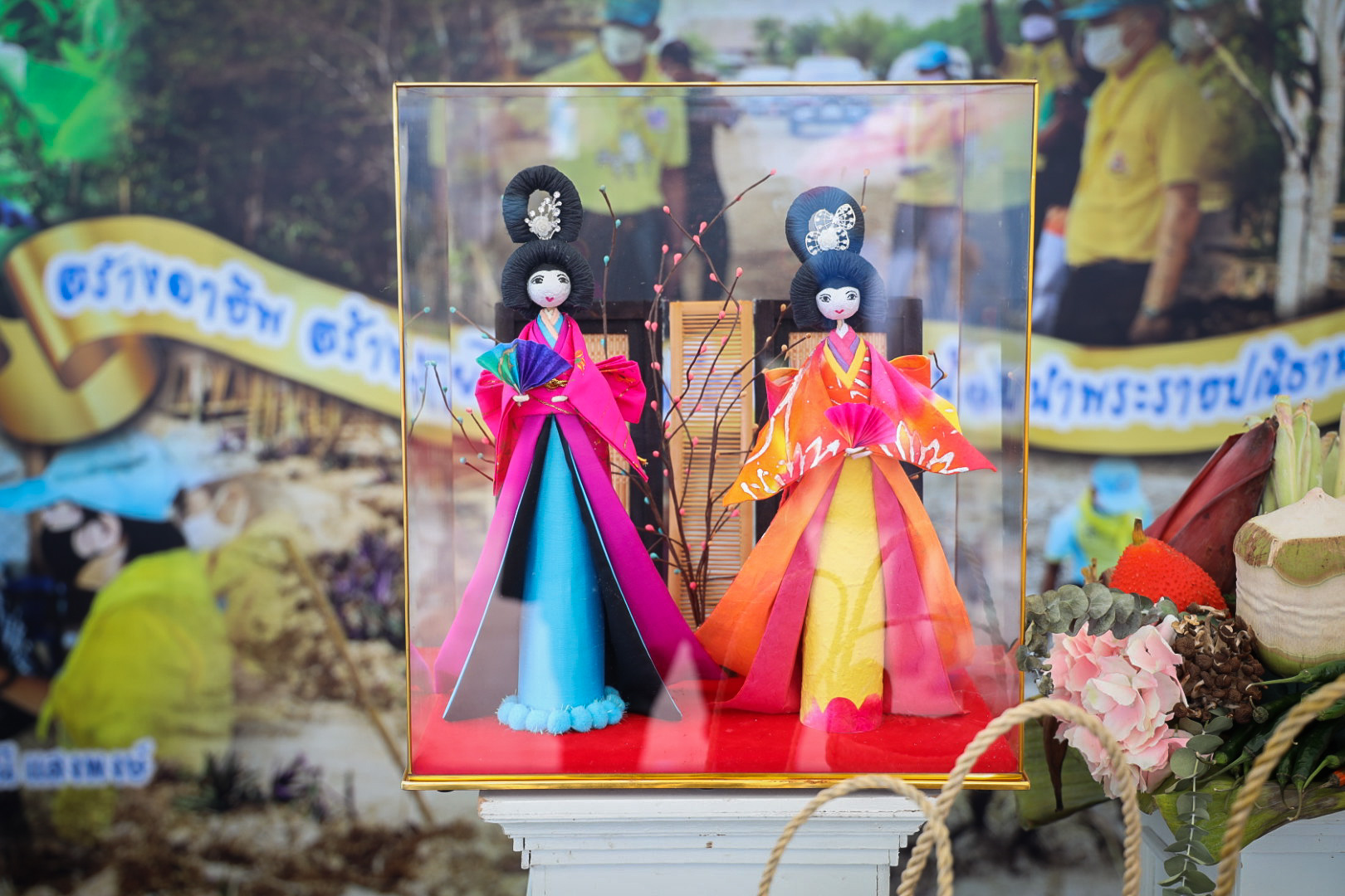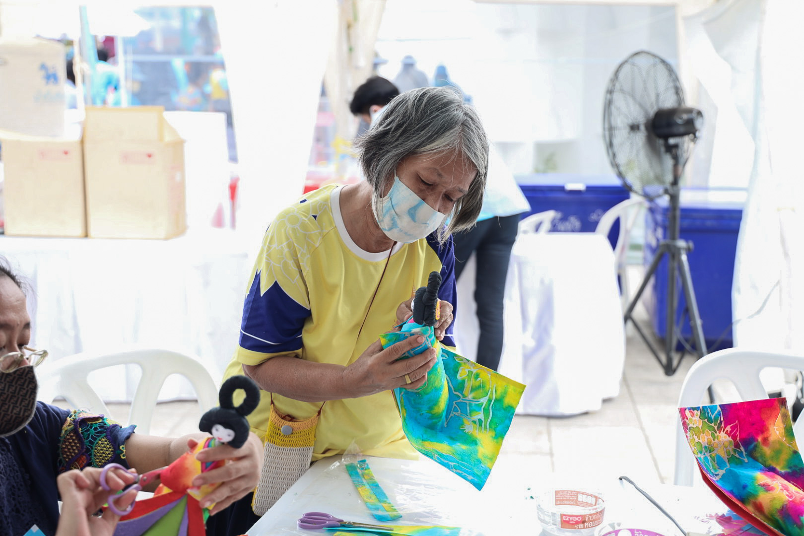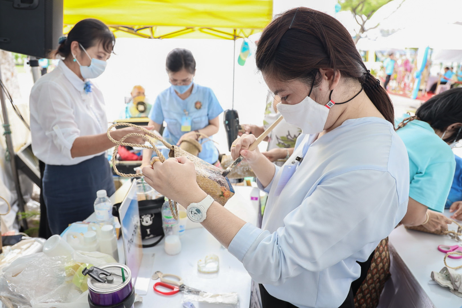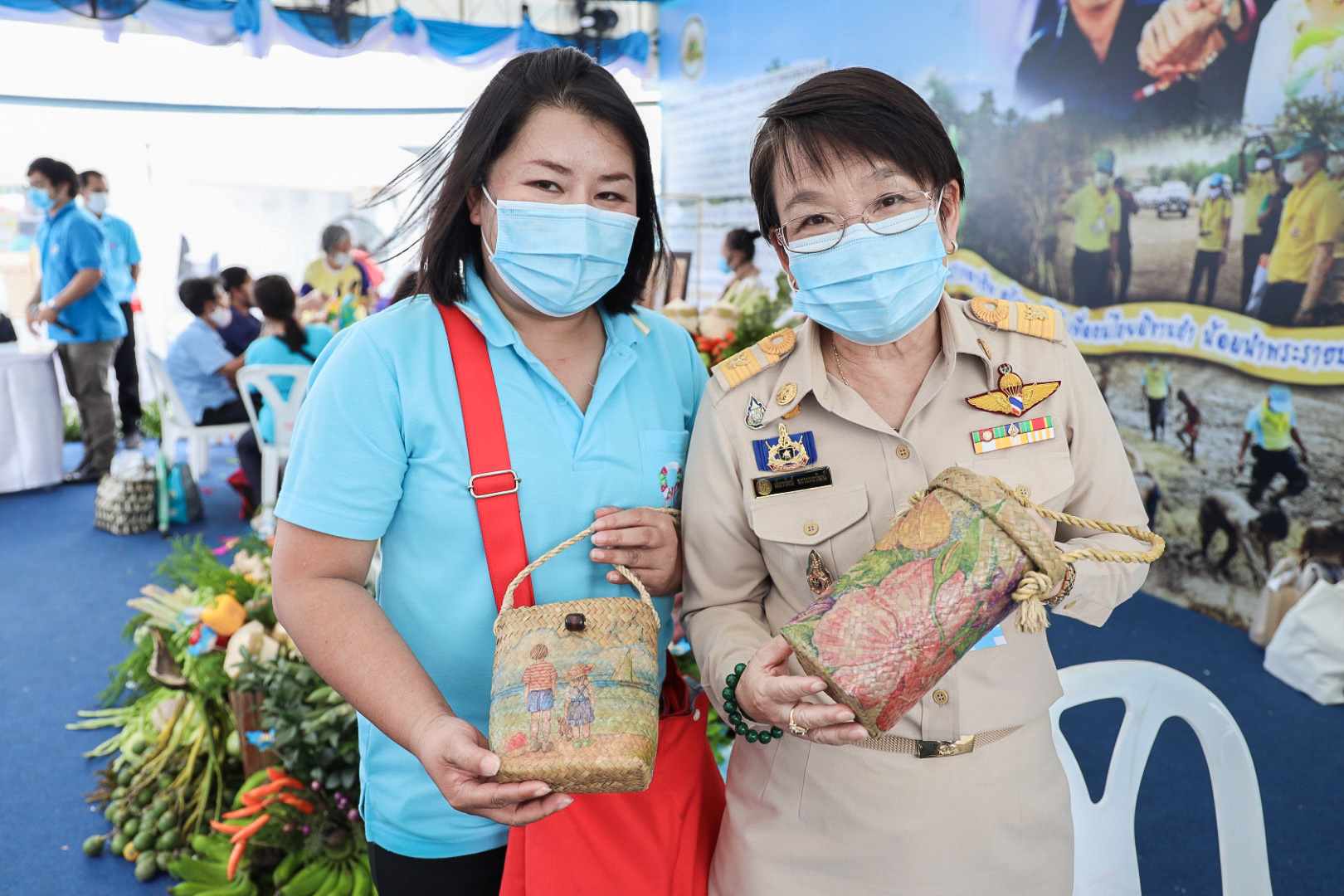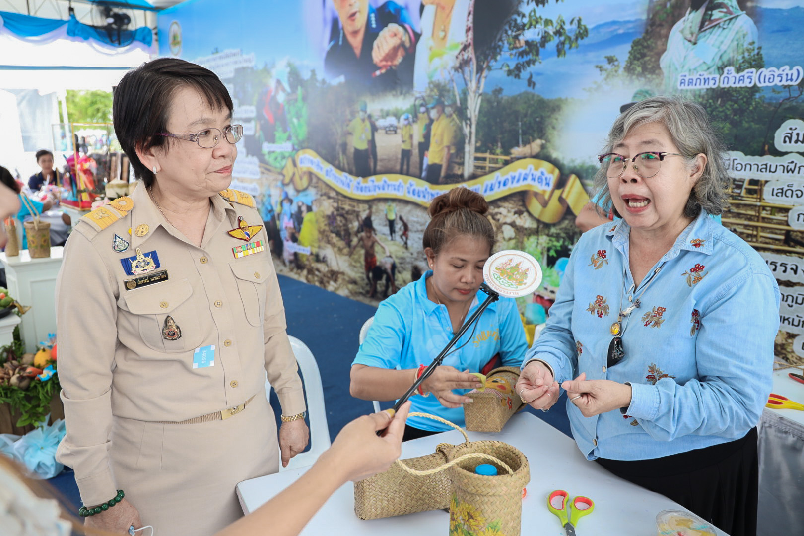 This activity is one in honor of HM Queen Sirikit, in which. Office of the Permanent Secretary, Office of the Prime Minister scheduled to be held between August 12 – 14, 2020, at Sanam Luang. Inside the booth of the Ministry of Labour included the Covid-19 Resistant Model Farm Project Phase 1, recruitment services through Job Box, demonstrations and vocational training such as making jasmine baskets, garland stringing with jasmine, making a bag of Krajood decorated with ribbons, making glass holders, colorful ribbons, painting, making decoupage and Japanese dolls from mulberry paper for example. There was also a labour counseling provided by “labour lawyers” and applications for insured persons under Section 40 as well.