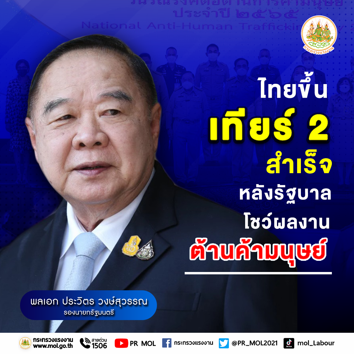 The Labour Minister, Mr. Suchart Chomklin, revealed that the U.S. Department of State had released its Trafficking In Person (TIP) Report 2022, which compiles data on trafficking in persons from 188 countries and territories annually. This year, Thailand has been upgraded to “Tier 2” from the original “Tier 2 Watch List” or “Tier 2 to Watch Out For” or must be monitored in 2021. The upgrade reflects the efforts of all sectors in solving such issues and is in line with the government’s policies under the leadership of Prime Minister and Minister of Defense General Prayuth Chan-ocha and Deputy Prime Minister General Prawit Wongsuwan who oversees the Ministry of Labour, that has given importance to resolving human trafficking that the government has set as a national agenda.