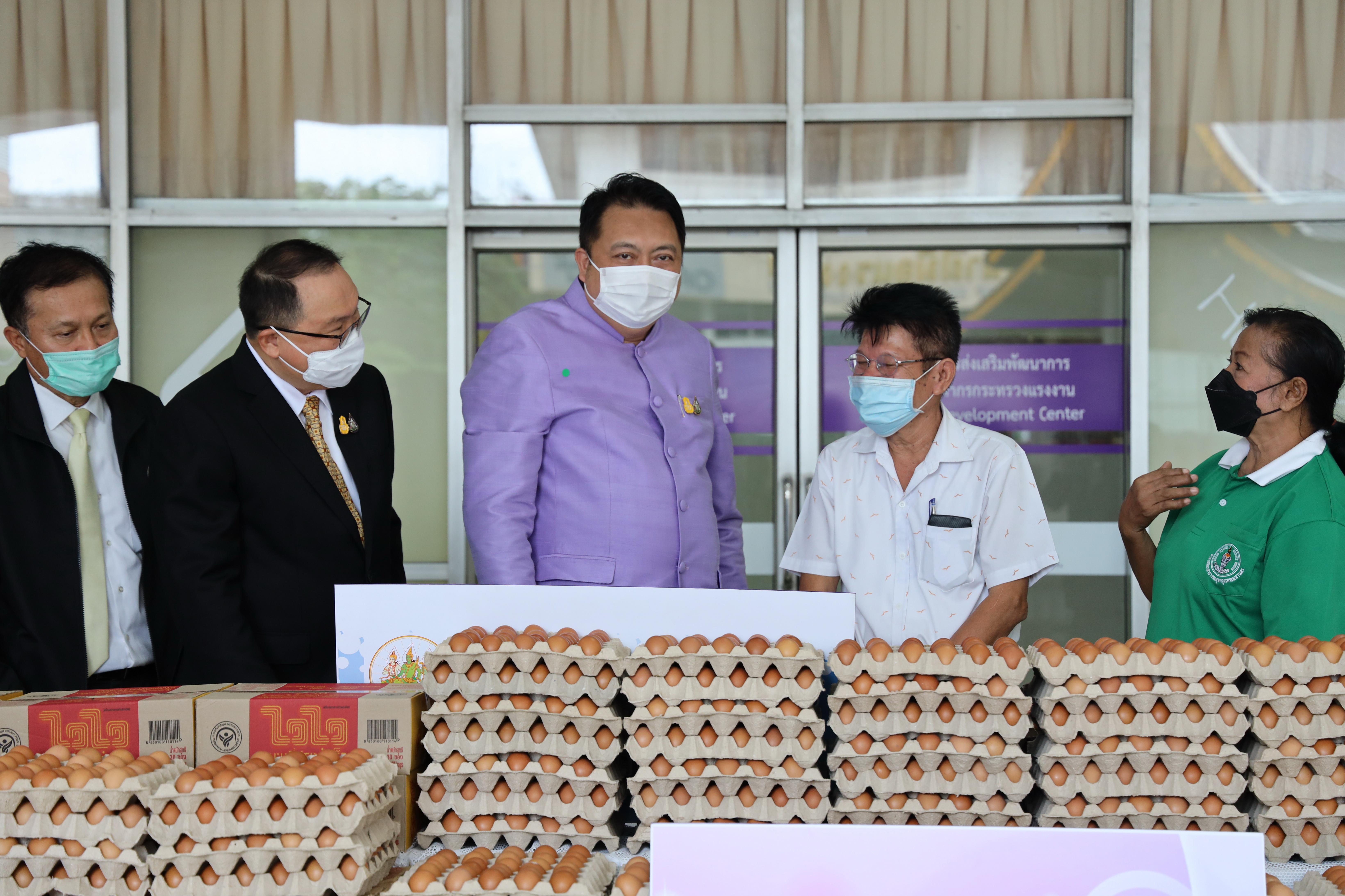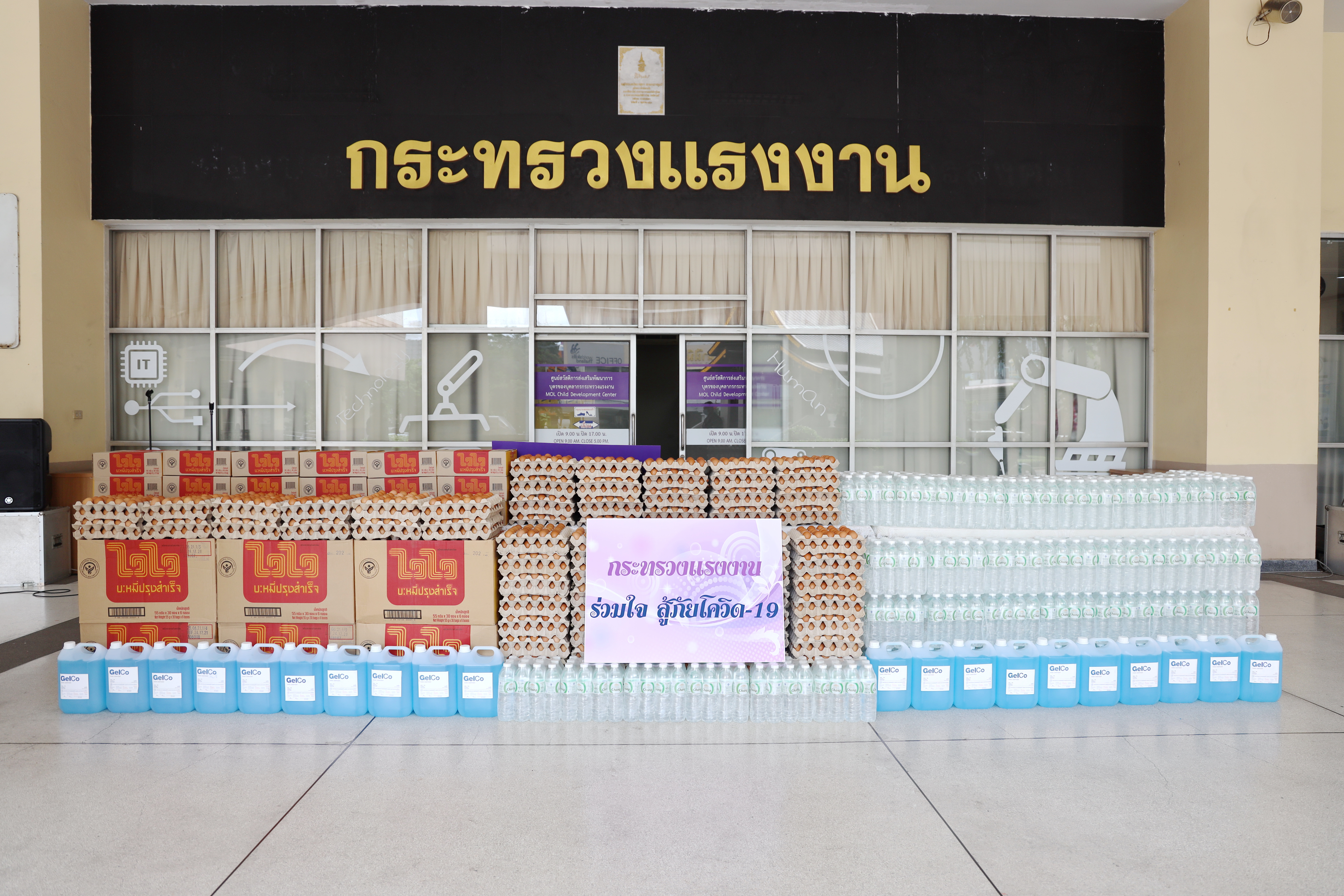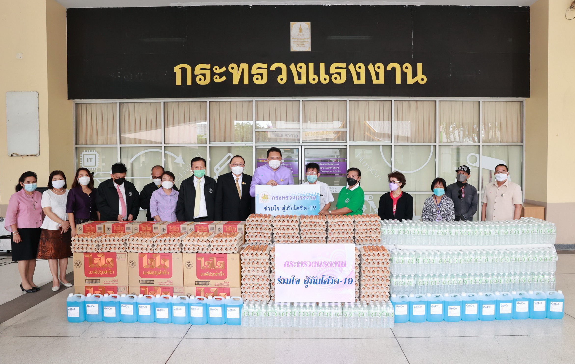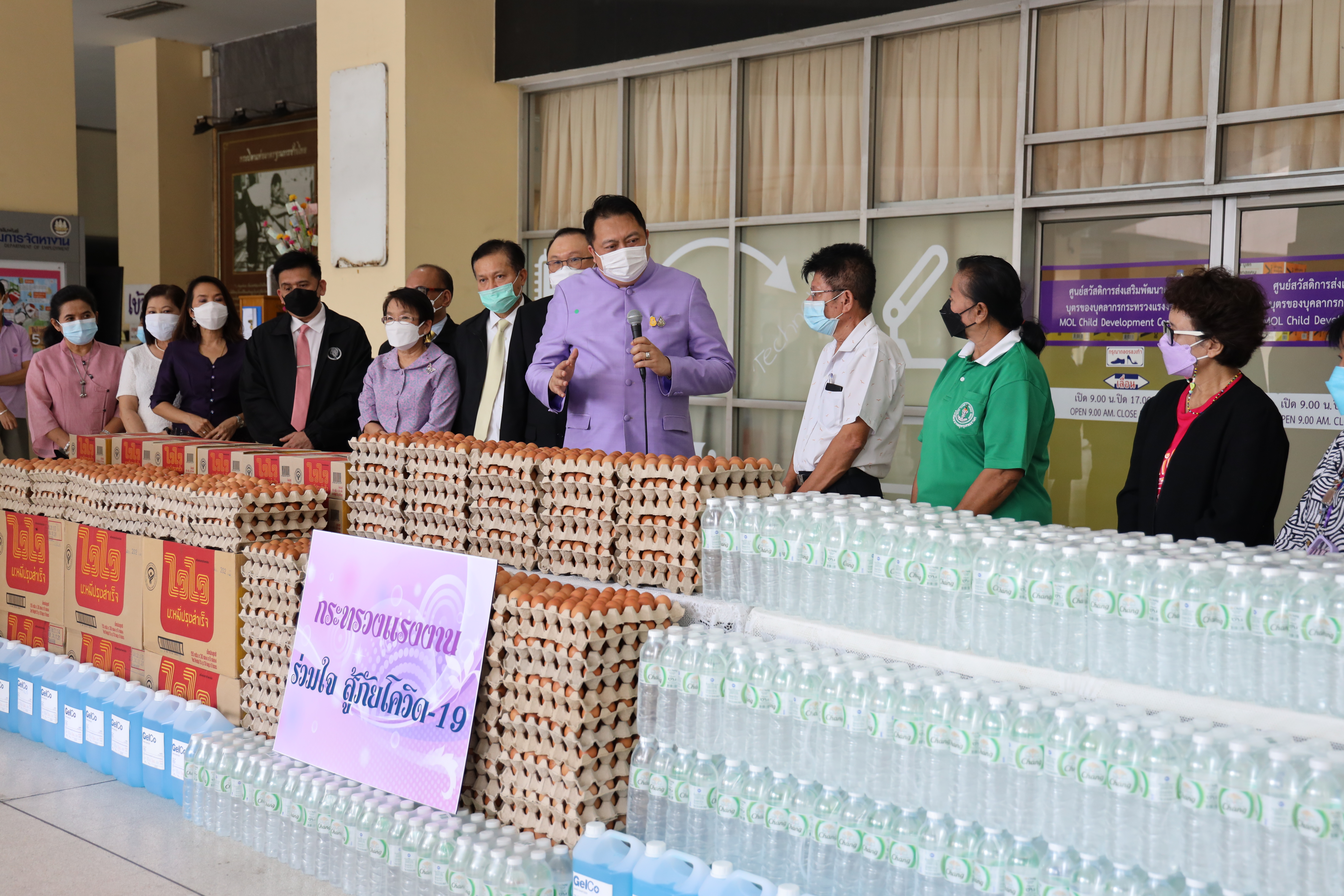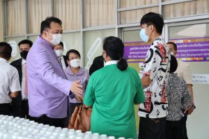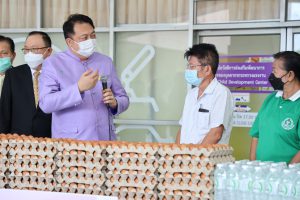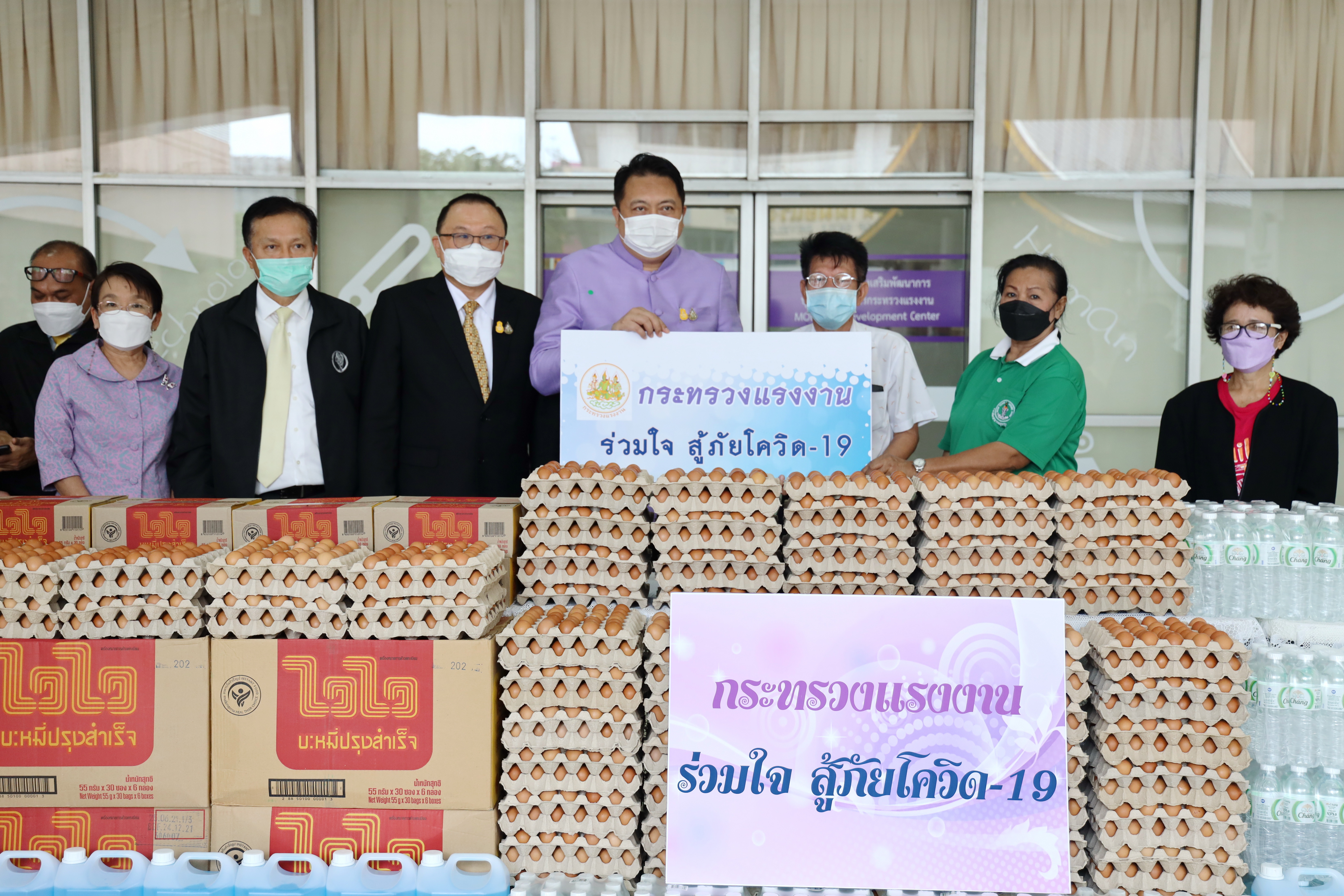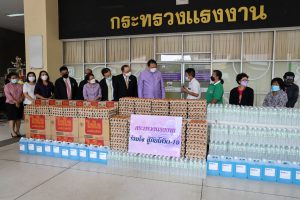 On September 7, 2021, Labour Minister Mr. Suchart Chomklin delivered consumer goods that the private sector donated to the Ministry of Labour to support people who have suffered from the impacts of COVID-19. The delivery was made to residents of the Din Daeng 1 Community Housing, which included 10,000 sachets of instant noodles, 40,000 eggs, 1,000 packs of drinking water, and 20 gallons of alcohol gel. Ms. Siriphen Sapon, Chairman of the Din Daeng 1 Community Housing, flats 1-20, and Mr. Wittaya Chindalak, Chairman of the Din Daeng 1 Community Housing, flats 22-32, received the donations which will be distributed to families in the Din Daeng community who have suffered from the impact of COVID-19. Assistant to the Labour Minister Mr. Surachai Chaitrakulthong, the Ministry of Labour’s Spokesperson (on politics) Mrs. Theanrat Nawamawat, Permanent Secretary of Labour Mr. Suthi Sukosol and the Ministry of Labour’s executives also joined the occasion at the foyer on the ground floor, Ministry of Labour. Mr. Suchart said that Prime Minister and Minister of Defense General Prayuth Chan-ocha and Ministry of Labour under the supervision of Deputy Prime Minister General Prawit Wongsuwan is concerned about the people who are affected and suffering from the COVID-19 situation. Today, he was assigned to bring consumer goods that the Ministry of Labour received from the private sector, pass on to the Din Daeng community, and help families affected by COVID-19 to help each other in times of trouble. The effort is another way to alleviate suffering and food expenses.