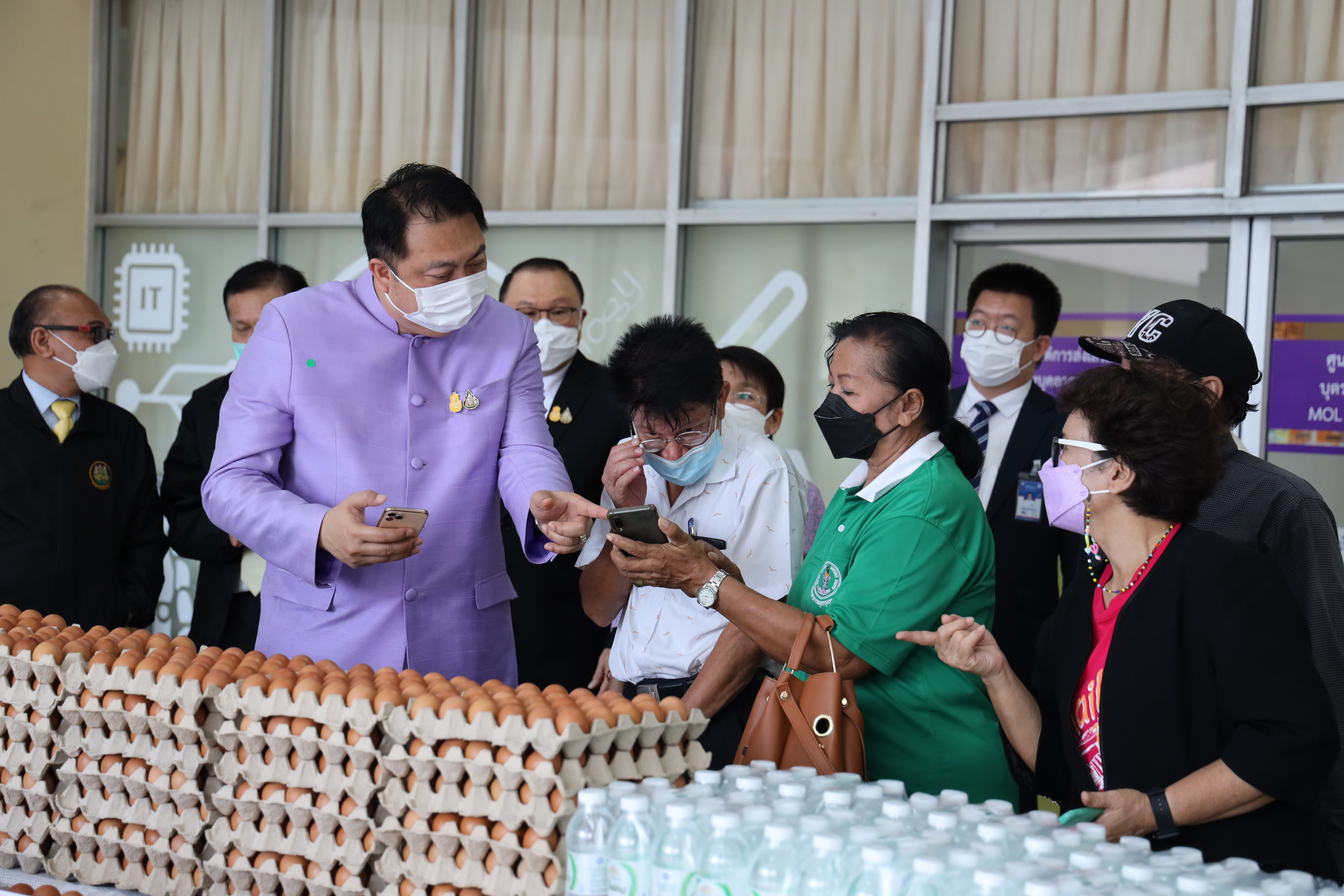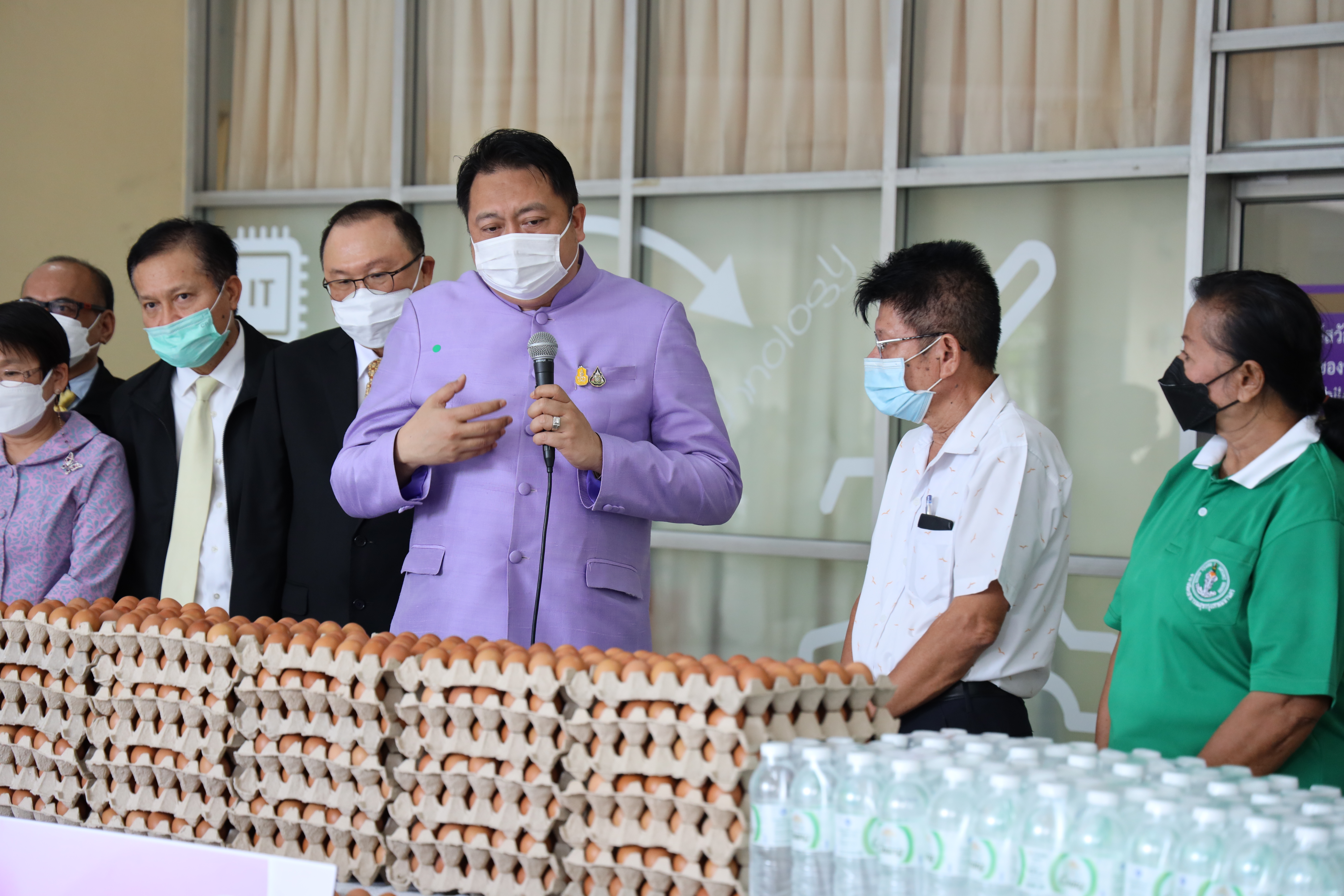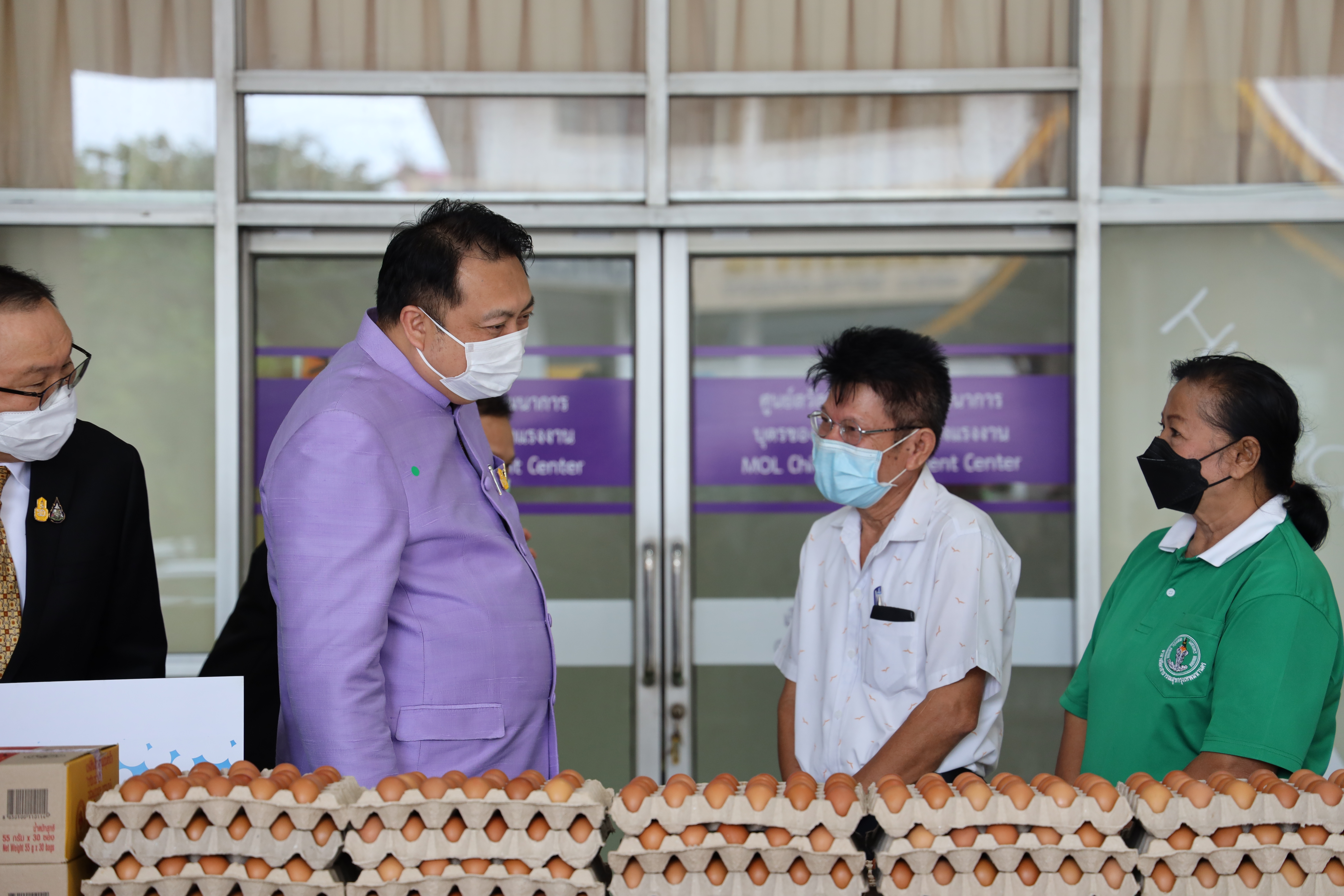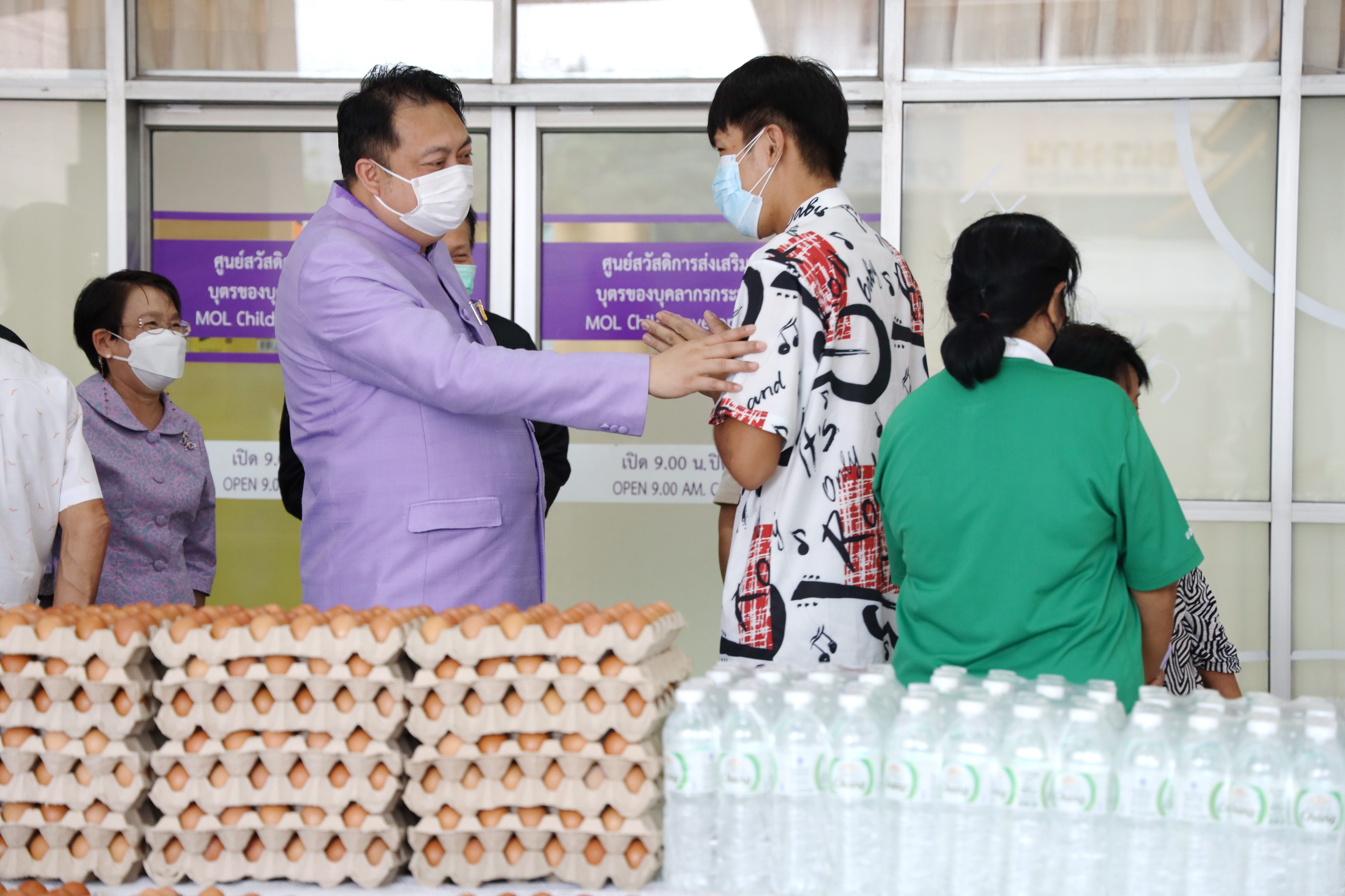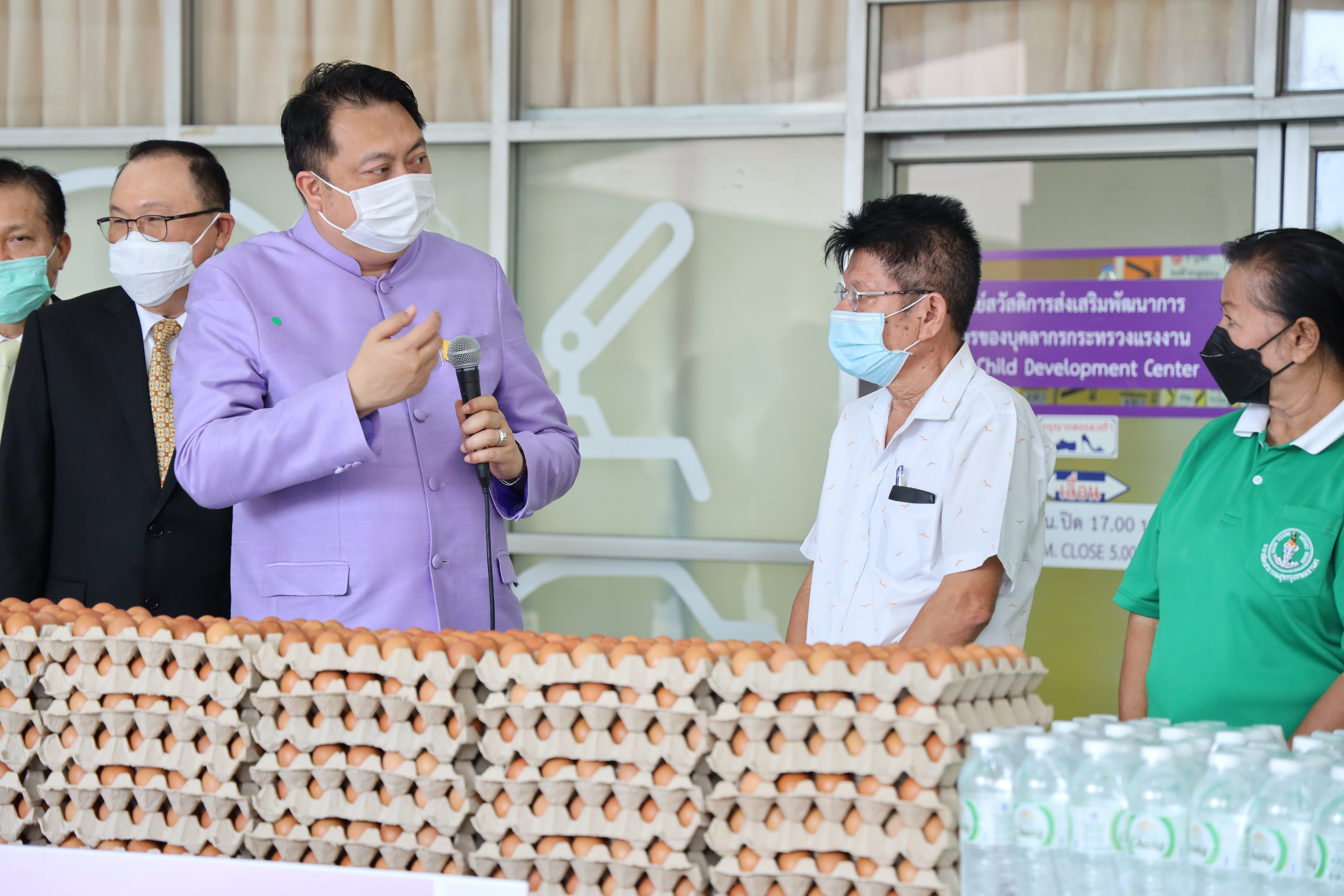 On September 7, 2021, Labour Minister Mr. Suchart Chomklin delivered consumer goods that the private sector donated to the Ministry of Labour to support people who have suffered from the impacts of COVID-19. The delivery was made to residents of the Din Daeng 1 Community Housing, which included 10,000 sachets of instant noodles, 40,000 eggs, 1,000 packs of drinking water, and 20 gallons of alcohol gel. Ms. Siriphen Sapon, Chairman of the Din Daeng 1 Community Housing, flats 1-20, and Mr. Wittaya Chindalak, Chairman of the Din Daeng 1 Community Housing, flats 22-32, received the donations which will be distributed to families in the Din Daeng community who have suffered from the impact of COVID-19. Assistant to the Labour Minister Mr. Surachai Chaitrakulthong, the Ministry of Labour’s Spokesperson (on politics) Mrs. Theanrat Nawamawat, Permanent Secretary of Labour Mr. Suthi Sukosol and the Ministry of Labour’s executives also joined the occasion at the foyer on the ground floor, Ministry of Labour. Mr. Suchart said that Prime Minister and Minister of Defense General Prayuth Chan-ocha and Ministry of Labour under the supervision of Deputy Prime Minister General Prawit Wongsuwan is concerned about the people who are affected and suffering from the COVID-19 situation. Today, he was assigned to bring consumer goods that the Ministry of Labour received from the private sector, pass on to the Din Daeng community, and help families affected by COVID-19 to help each other in times of trouble. The effort is another way to alleviate suffering and food expenses.