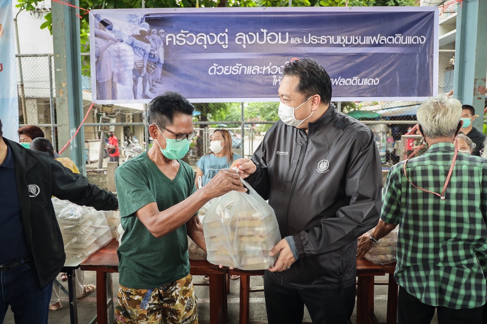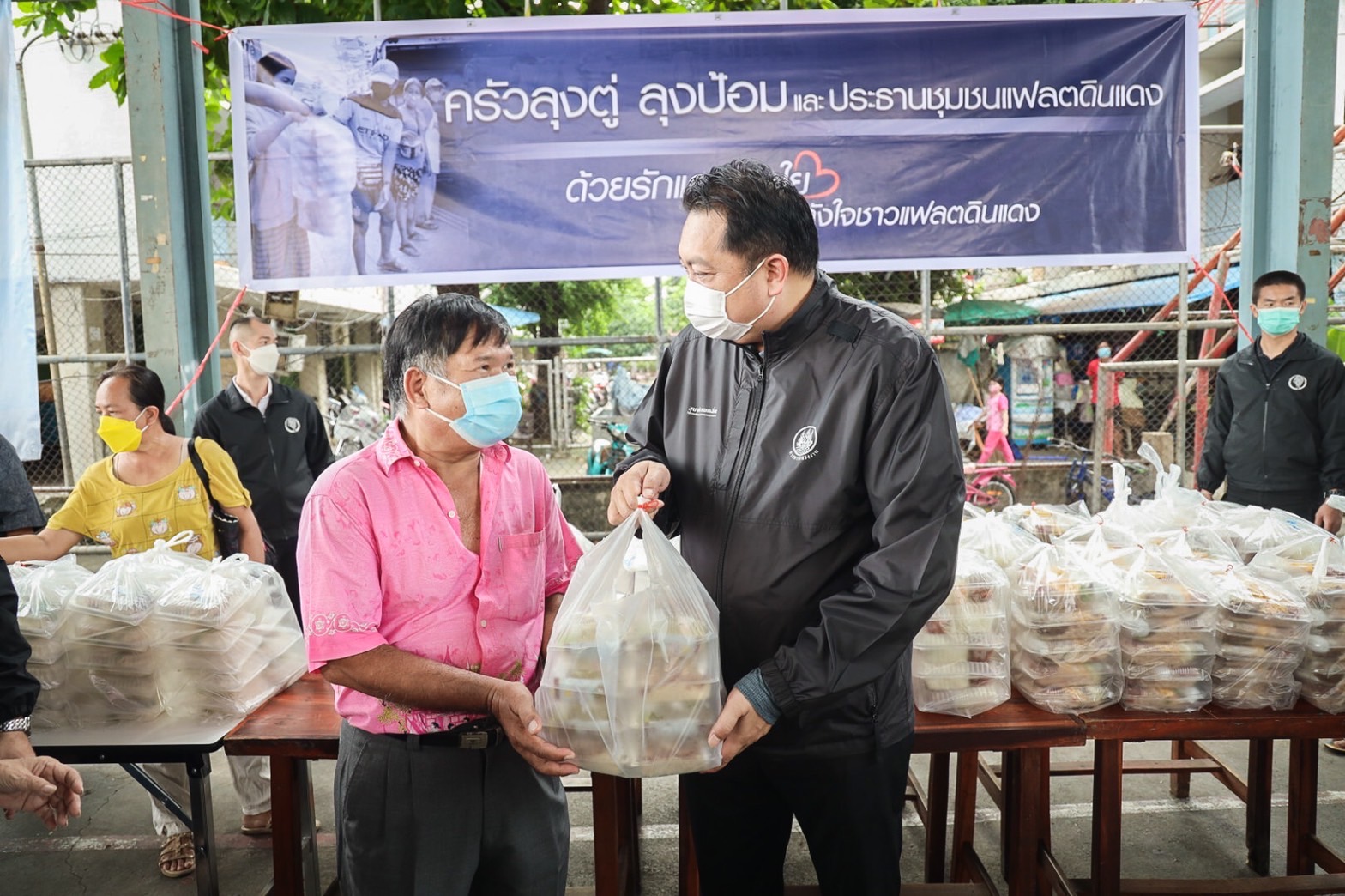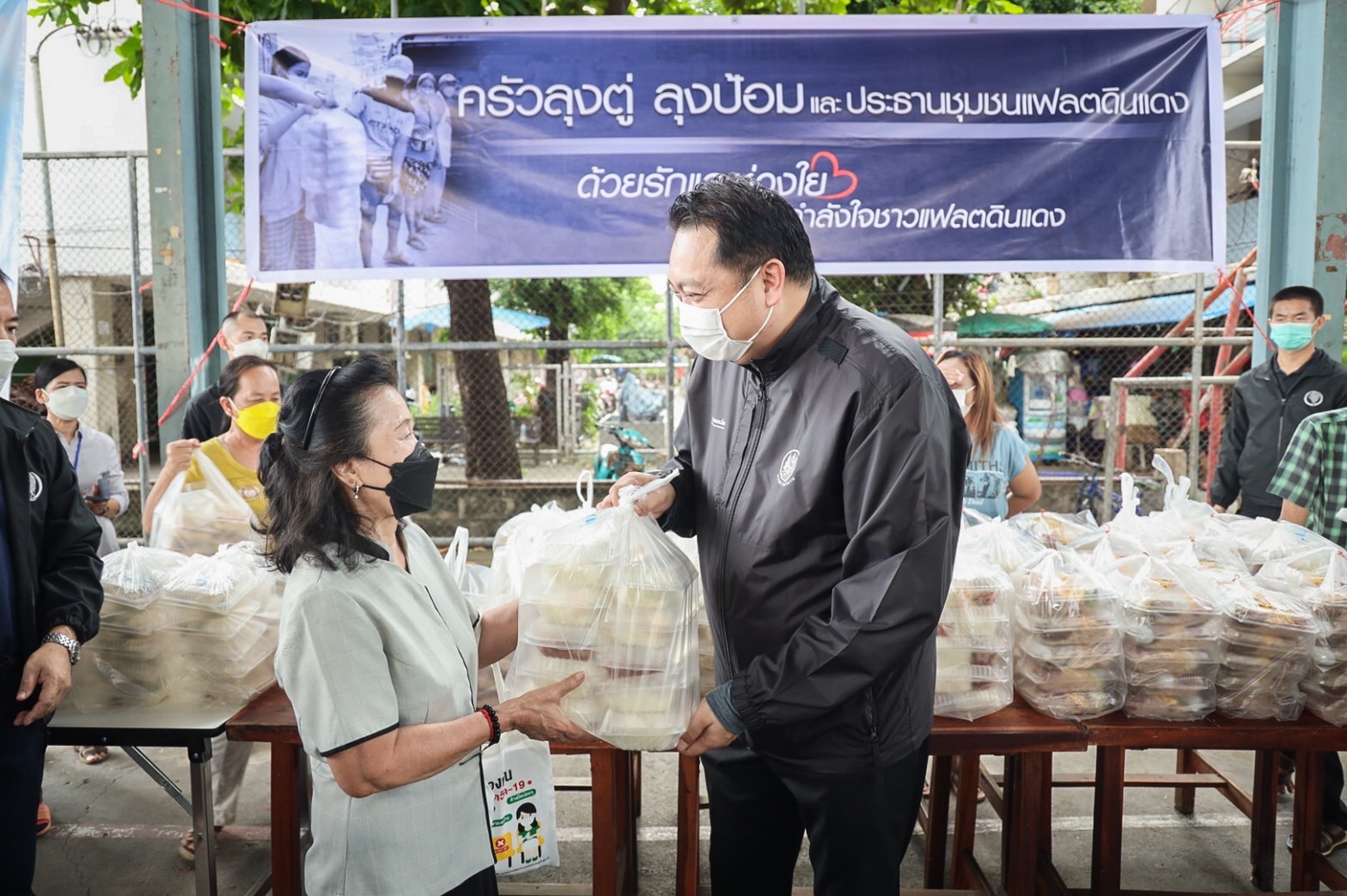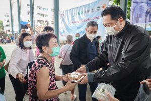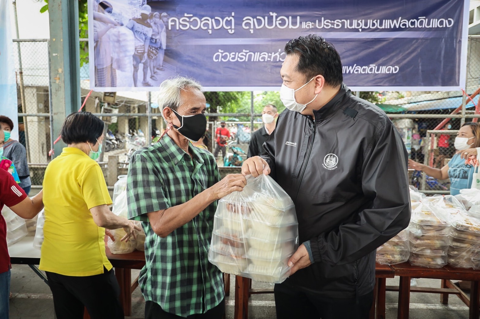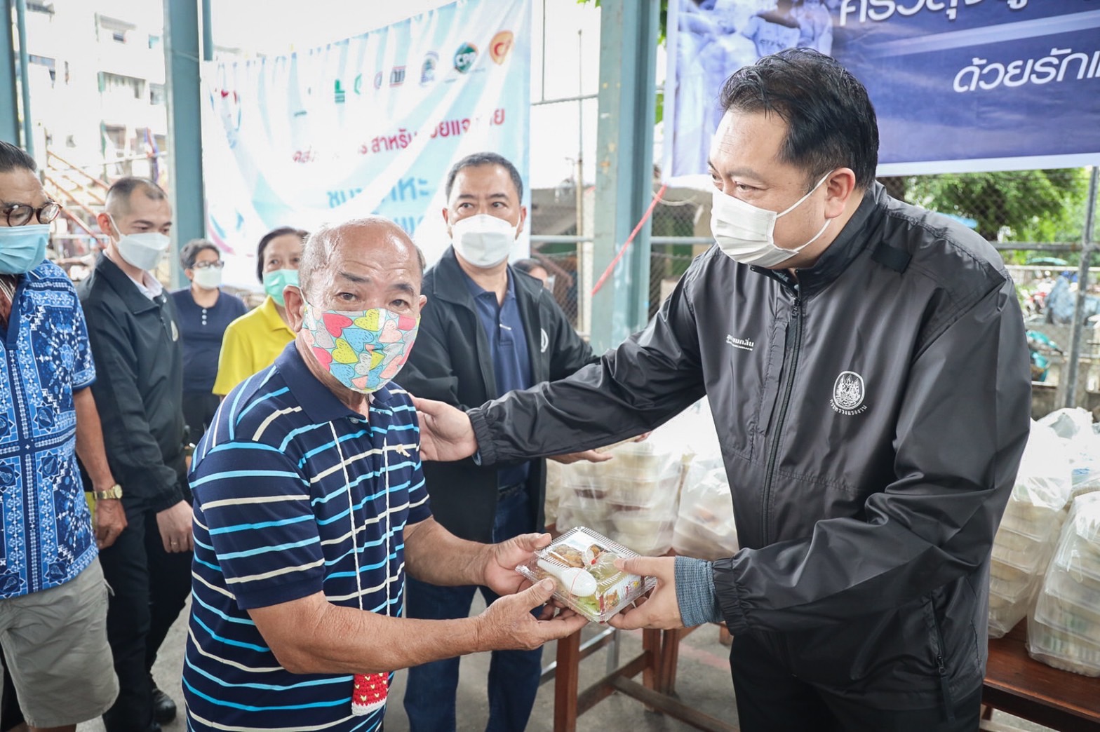 On September 18, 2021, Labour Minister Mr. Suchart Chomklin visited the area to deliver “Uncle Tu and Uncle Pom’s Kitchen” food boxes, which allowed local vendors to cook food boxes for dinner, to have a career, and earn an income. There were 1,500 food boxes to distribute to members in the three Din Daeng communities affected by COVID-19, equivalent to 500 boxes for each community. The food boxes consisted of shrimp paste fried rice, fried chicken with ginger and rice, boiled eggs with boiled chicken rice, fried chicken rice, and Panang pork and rice. The first point was the Din Daeng City Rehabilitation Phase 1 (Din Daeng Plan G) project behind the Muhayireen Mosque. The second point was at the field of the 8-story building, Pracha Songkhro Intersection, opposite Phibun Prachasan School. The third point was at the sports ground area 51, Soi Pracha Songkhro 11, near the Din Daeng 2 Community Housing Market. Mr. Wichan Kheewkaew, chairman of the Din Daeng 2 Community Housing Committee, and the residents of the Din Daeng flats received the food boxes. Mr. Suchart said that Prime Minister General Prayuth Chan-ocha and Deputy Prime Minister General Prawit Wongsuwan, who oversees the Ministry of Labour, is concerned about workers and the general public who have been affected by the COVID-19 situation, especially the elderly, young children, bedridden patients, and the residents of the Din Daeng flats. They have no income due to the impact of the virus. Therefore, the Labour Minister has been assigned to visit the area to deliver food boxes which allows the vendors in the community to make food boxes to have a career and income. The project produces 1,500 boxes per day and will be distributed to members in the Din Daeng community affected by the COVID-19 situation for dinner. A total of 500 boxes will be distributed at the three locations, starting from September 16 to October 12, 2021, for 27 days to alleviate the suffering and the burden of family expenses.