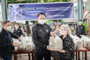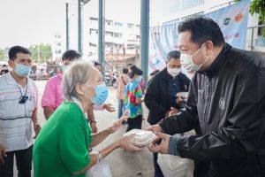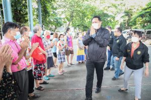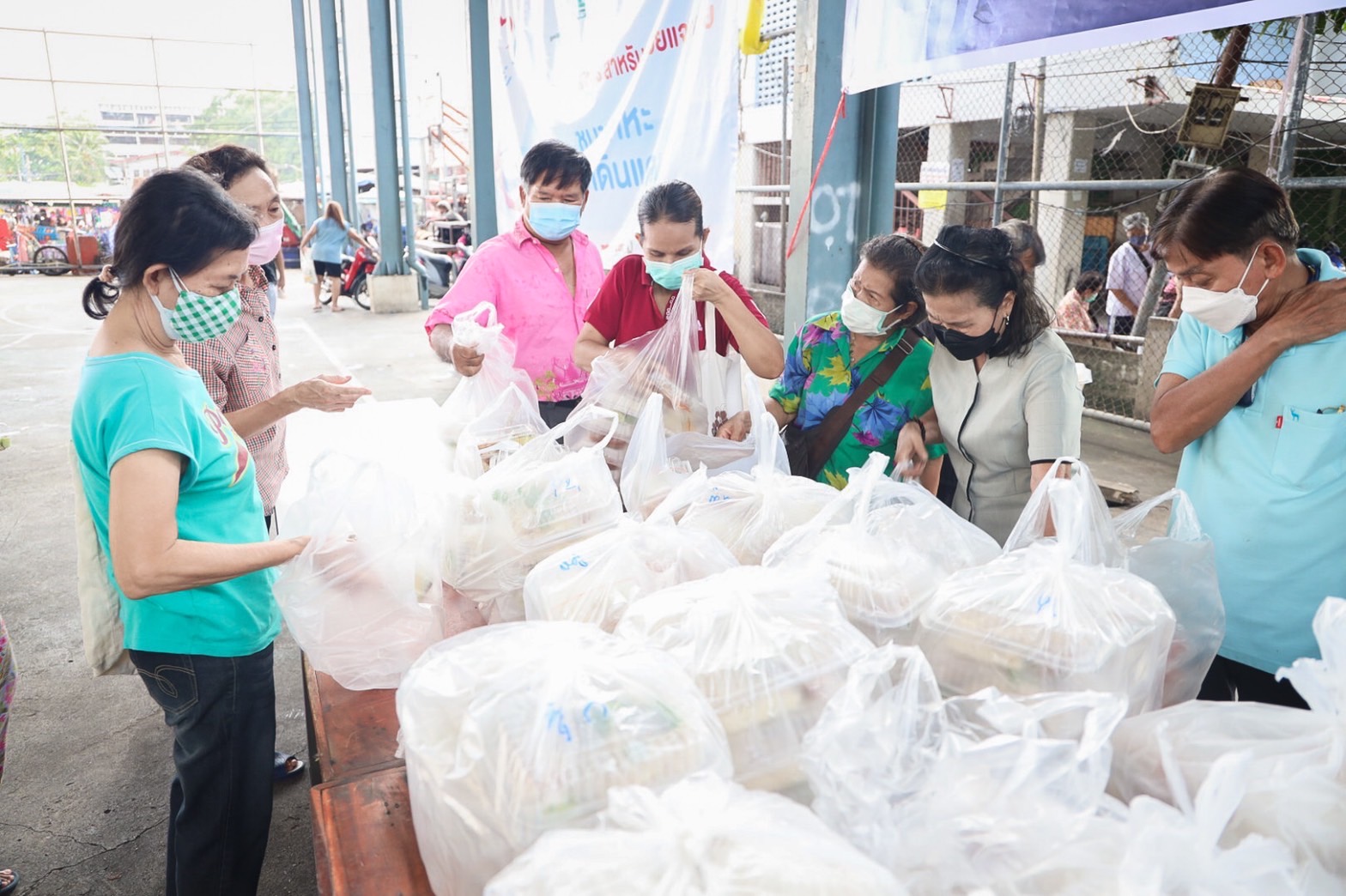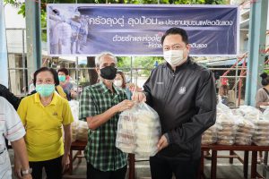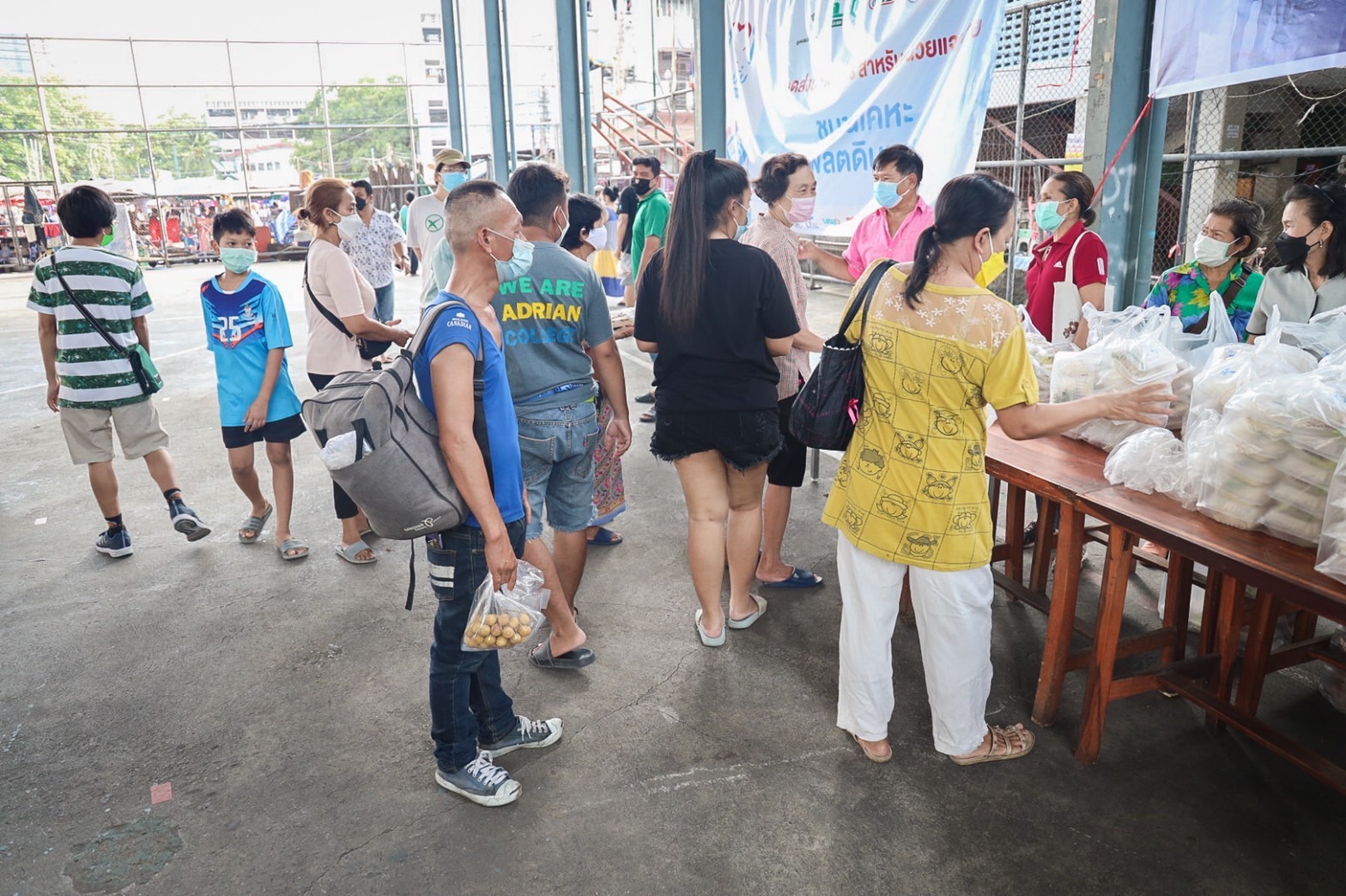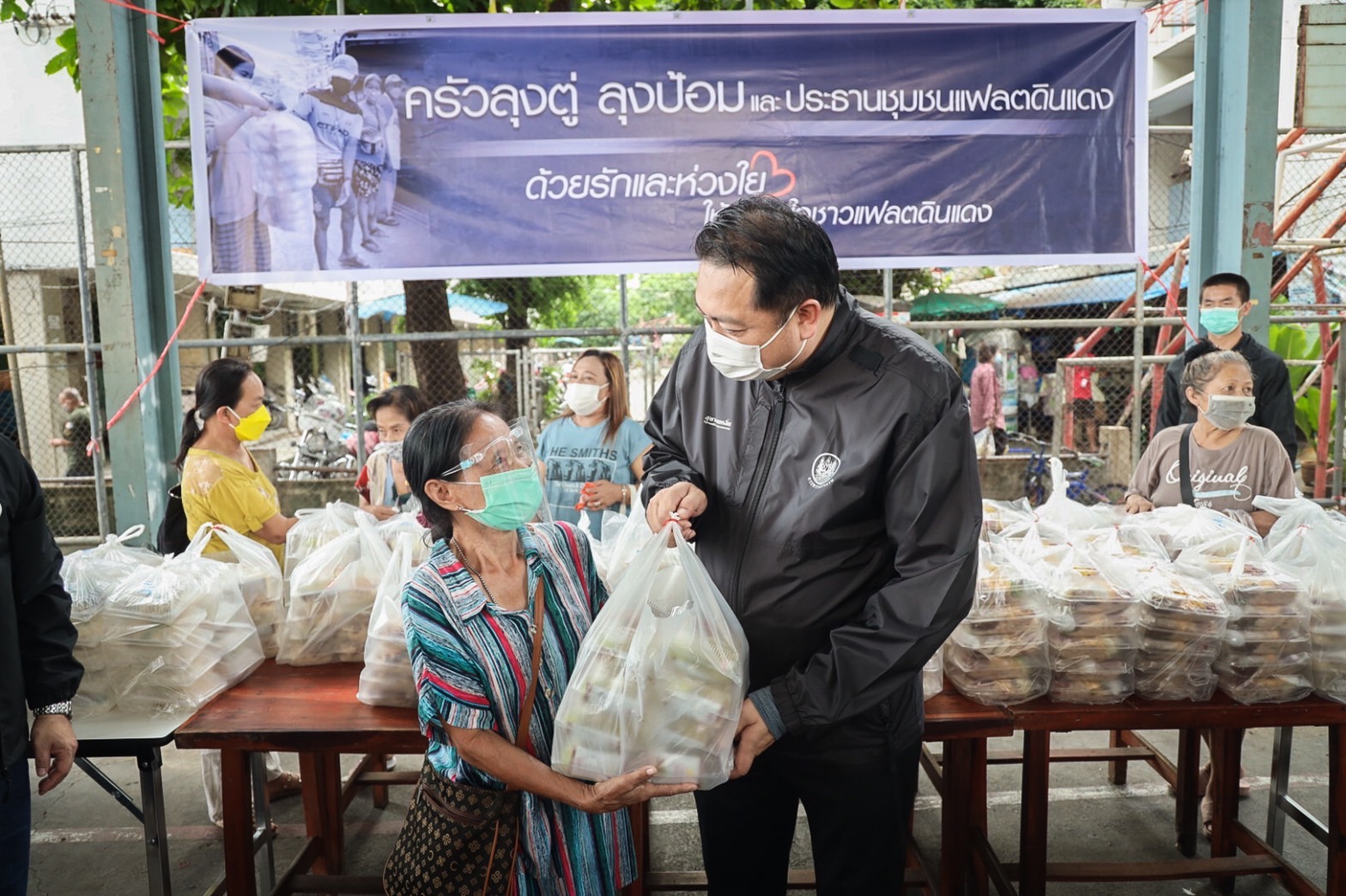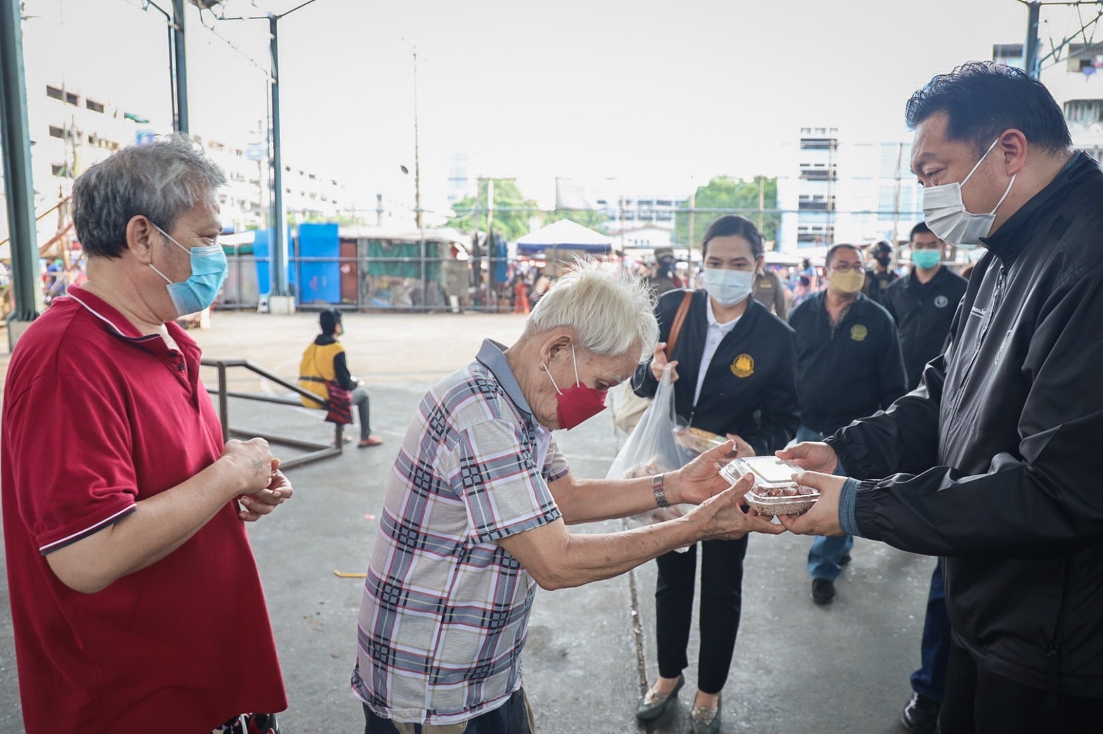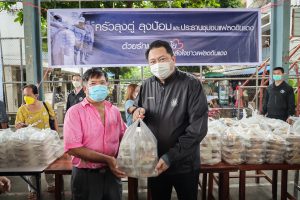 On September 18, 2021, Labour Minister Mr. Suchart Chomklin visited the area to deliver “Uncle Tu and Uncle Pom’s Kitchen” food boxes, which allowed local vendors to cook food boxes for dinner, to have a career, and earn an income. There were 1,500 food boxes to distribute to members in the three Din Daeng communities affected by COVID-19, equivalent to 500 boxes for each community. The food boxes consisted of shrimp paste fried rice, fried chicken with ginger and rice, boiled eggs with boiled chicken rice, fried chicken rice, and Panang pork and rice. The first point was the Din Daeng City Rehabilitation Phase 1 (Din Daeng Plan G) project behind the Muhayireen Mosque. The second point was at the field of the 8-story building, Pracha Songkhro Intersection, opposite Phibun Prachasan School. The third point was at the sports ground area 51, Soi Pracha Songkhro 11, near the Din Daeng 2 Community Housing Market. Mr. Wichan Kheewkaew, chairman of the Din Daeng 2 Community Housing Committee, and the residents of the Din Daeng flats received the food boxes. Mr. Suchart said that Prime Minister General Prayuth Chan-ocha and Deputy Prime Minister General Prawit Wongsuwan, who oversees the Ministry of Labour, is concerned about workers and the general public who have been affected by the COVID-19 situation, especially the elderly, young children, bedridden patients, and the residents of the Din Daeng flats. They have no income due to the impact of the virus. Therefore, the Labour Minister has been assigned to visit the area to deliver food boxes which allows the vendors in the community to make food boxes to have a career and income. The project produces 1,500 boxes per day and will be distributed to members in the Din Daeng community affected by the COVID-19 situation for dinner. A total of 500 boxes will be distributed at the three locations, starting from September 16 to October 12, 2021, for 27 days to alleviate the suffering and the burden of family expenses.