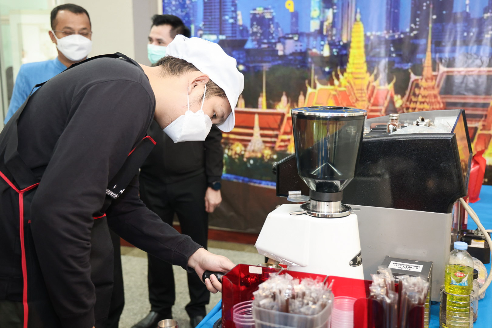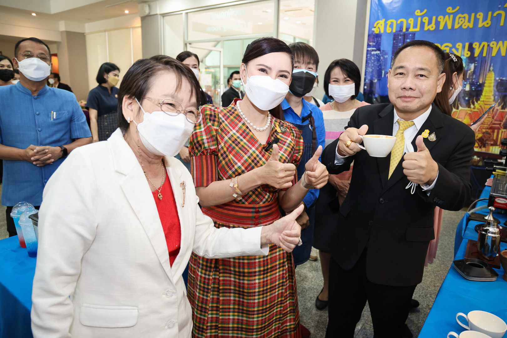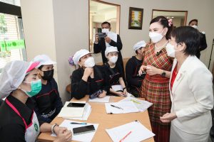 The Labour Minister’s Advisor, Mrs. Thiwalrat Angkinan, revealed that the Labour Minister, Mr. Suchart Chomklin, cares about the workforce. Therefore, she was assigned to visit the area to encourage the trainees to continue fighting for life. She sincerely hoped the training would allow participants will bring their knowledge from the barista course about different types of coffee, developing coffee packaging, how to properly store coffee beans, how to use and maintain a coffee machine, how to brew espresso correctly, the methods for calculating costs and determining the appropriate selling price, and the do’s and don’ts in coffee brewing, including marketing methods, sales channels, and services, to allow them to continue this in business.
