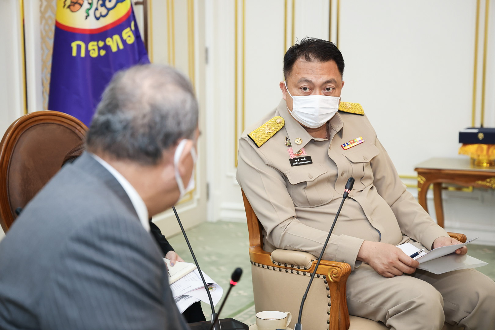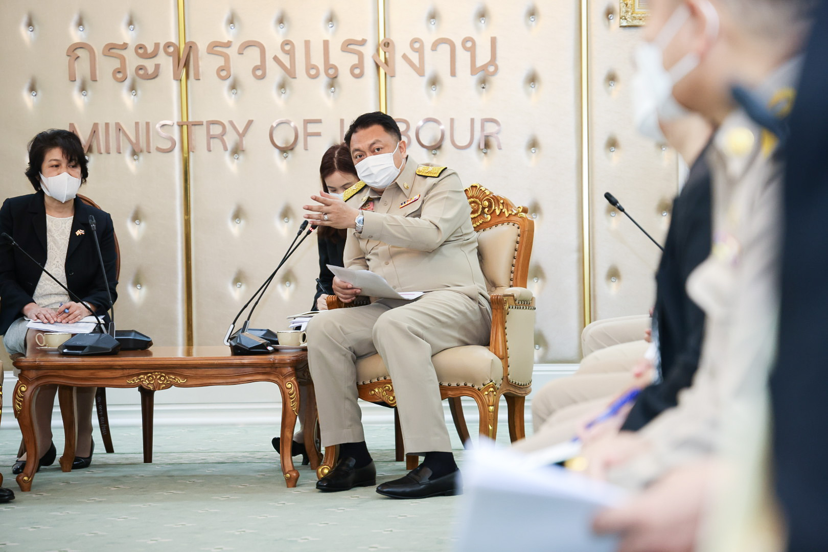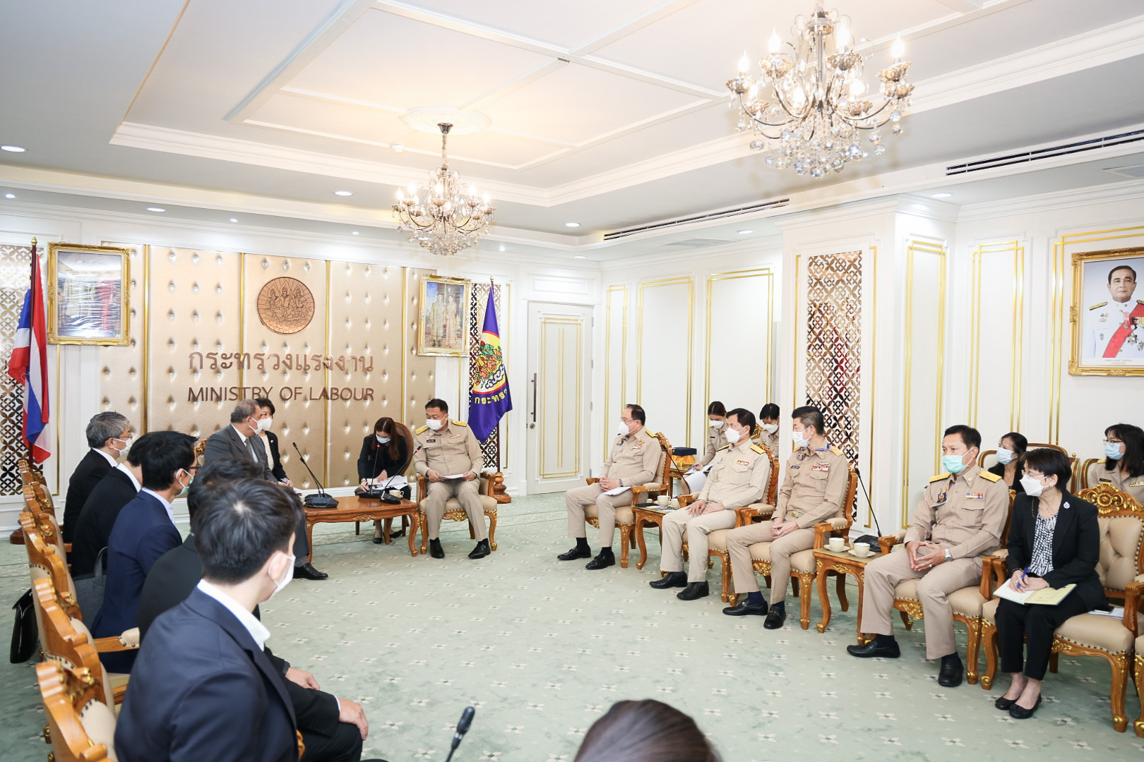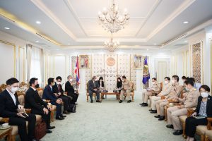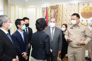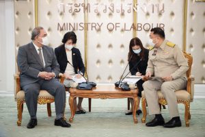 On May 23, 2022, Labour Minister Mr. Suchart Chomklin welcomed Mr. Hitoshi Kanamori, President of the International Manpower Development Organization, Japan (IM Japan) and delegation, on a courtesy call to the Labour Minister. The meeting took place on the occasion of Mr. Hitoshi Kanamori taking the President of IM Japan position in March 2020. They also discussed the government’s requirements for expanding the recruitment of Thai technical interns, including ways to expand cooperation to a new agreement on the recruitment of specialized skilled workers. Assistant to the Labour Minister Mr. Surachai Chaitrakulthong, Secretariat to the Labour Minister, Mr. Suthep Chitvong, Assistant Minister from the Prime Minister’s Office performing duties for the Ministry of Labour, Mr. Suthi Sukosol, the Ministry of Labour’s Spokesperson (on politics), and Mrs. Thienrat Navamawat, Permanent Secretary of Labour, Mr. Boonchob Suttamanaswong and the Ministry of LAbour’s executives also joined the occasion at the Chatumongkol Meeting Room, 6th floor, Ministry of Labour.