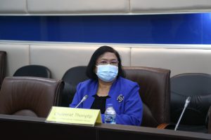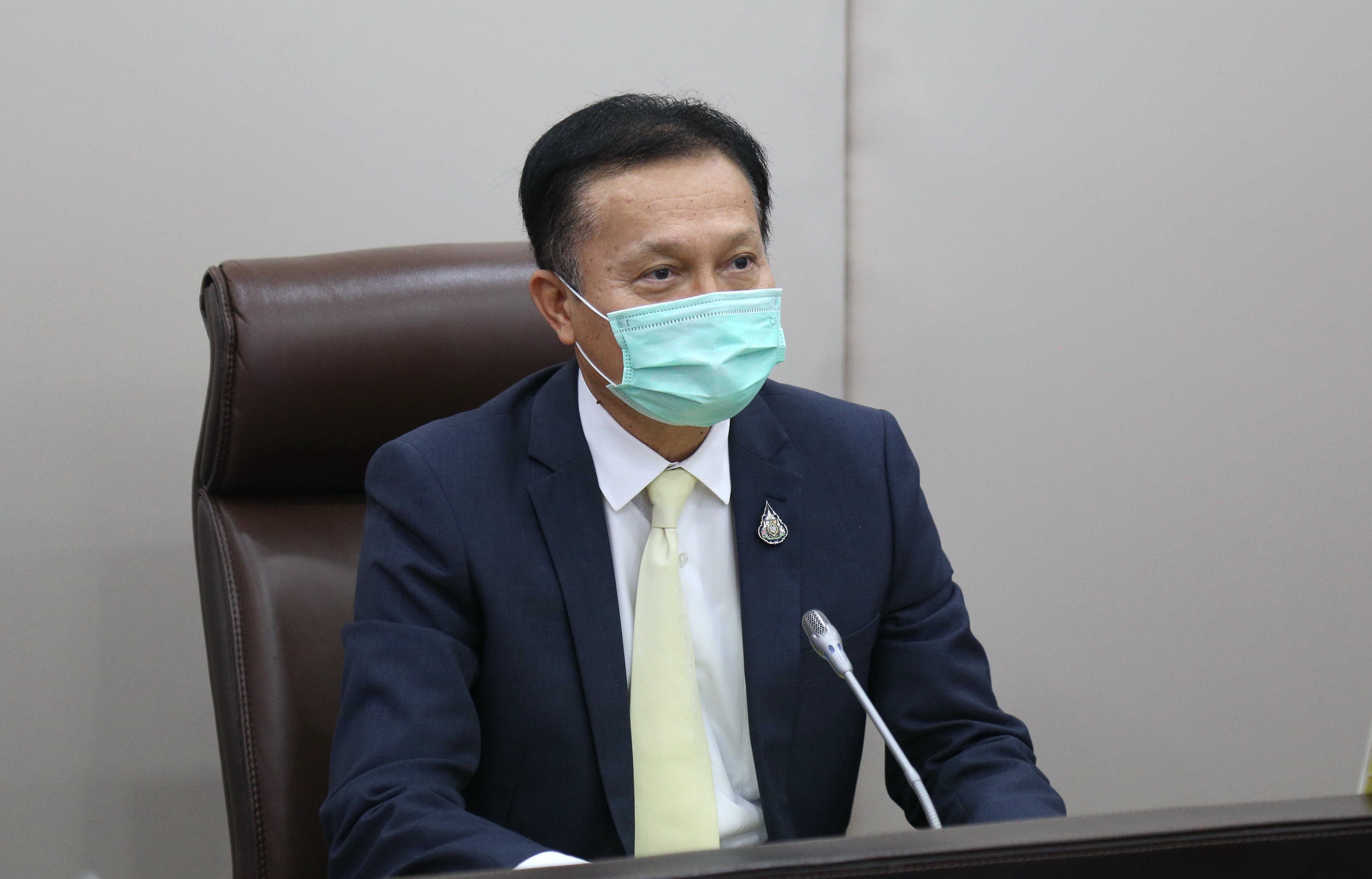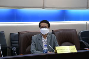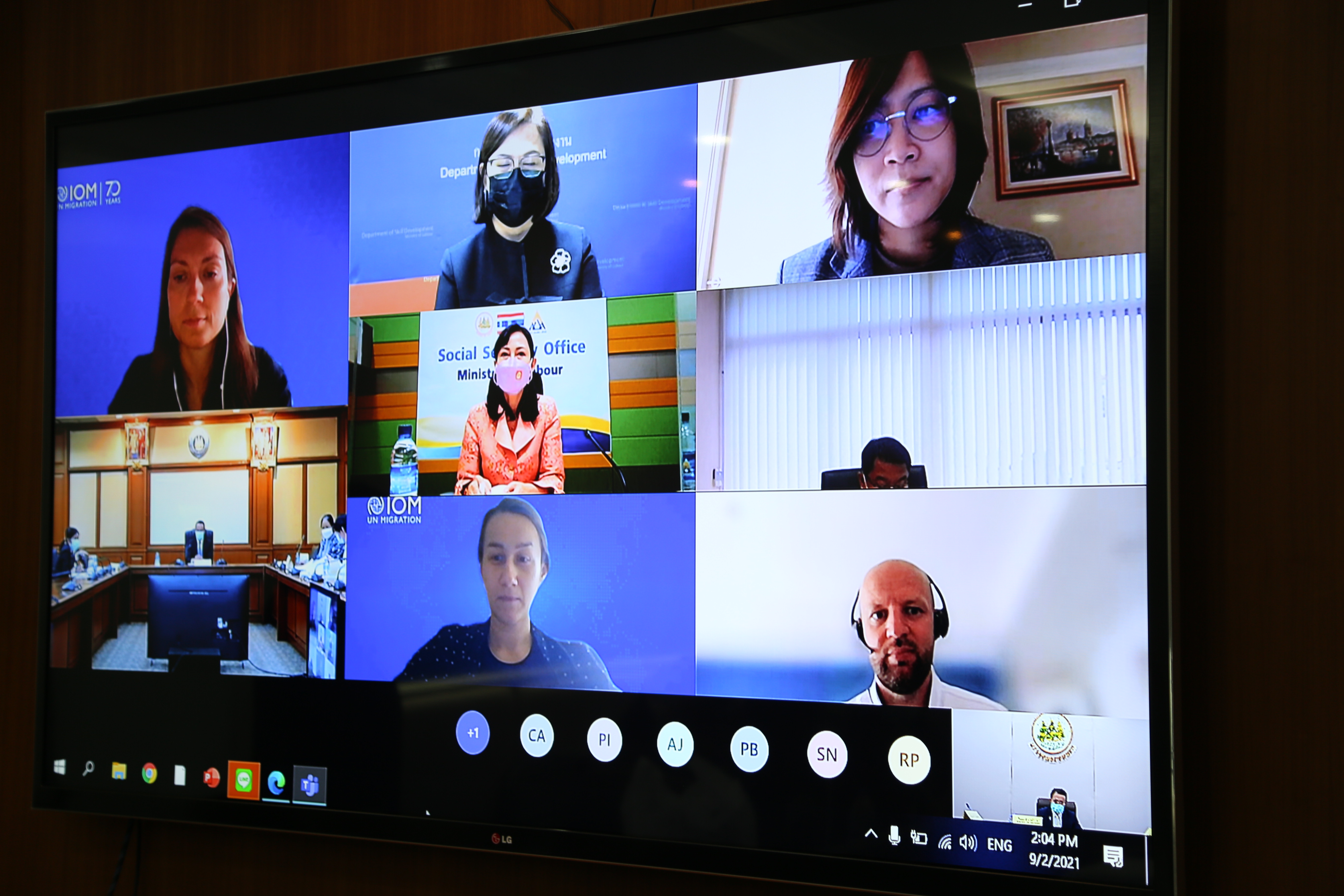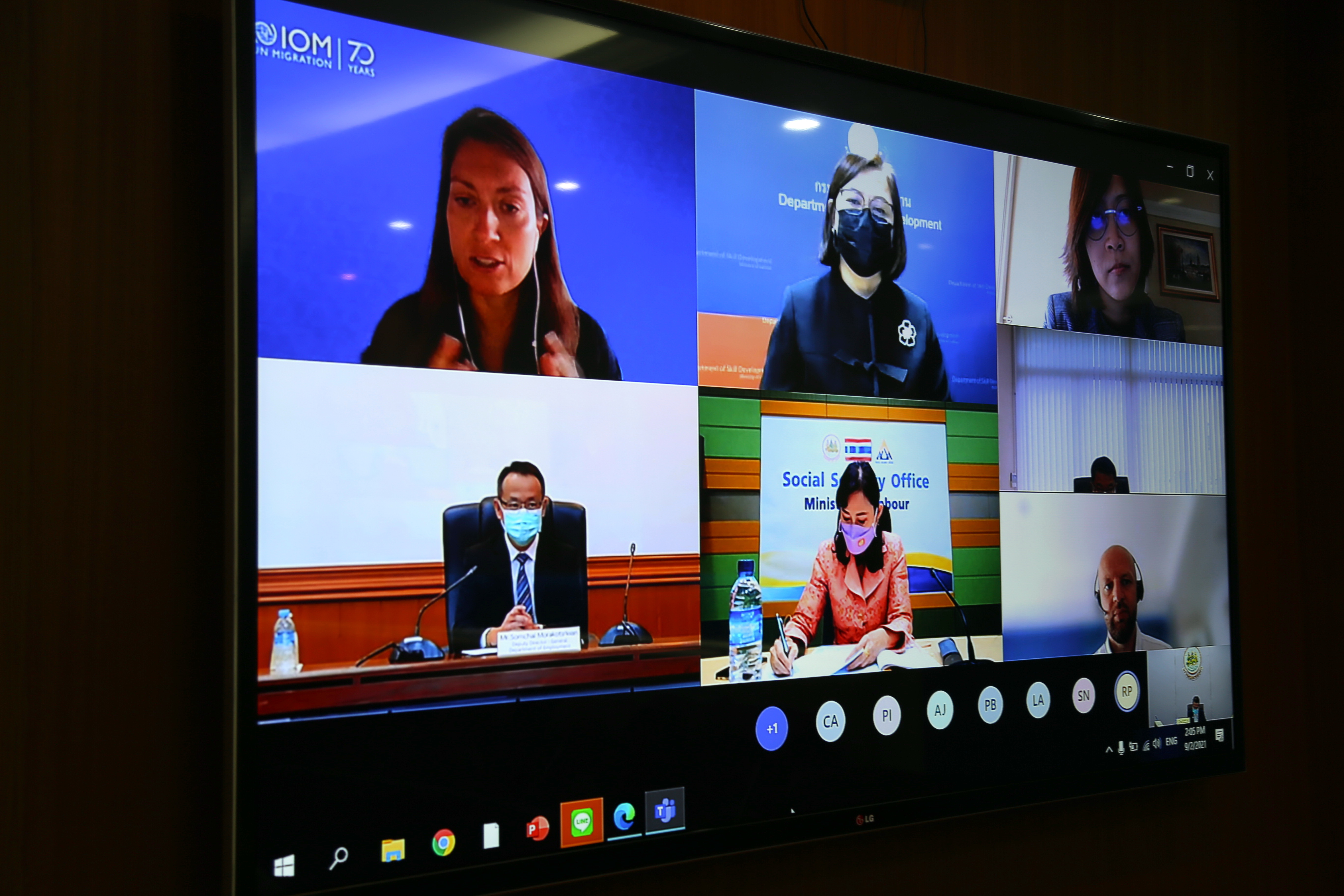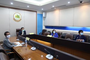 On September 2, 2021, at 14.00 hours, Permanent Secretary of Labour Mr. Suthi Sukosol and the Ministry of Labour’s management team, comprising the Department of Employment’s Director-General Phairoj Chotikasathian, Assistant to the Permanent Secretary of Labour Ms. Pattraporn Samantarat, the Department of Skill Development’s Inspector-General Mrs. Weeraya Rattananit, the Department of Labour Protection and Welfare’s Inspector-General Mr. Somphot Kwangkaew, the Social Security Office’s Inspector-Generals Mr. Sakdinat Sonthisakyothin and Ms. Ladda Saelee and the Director of the Office of International Cooperation Ms. Chuleerat Thongthip welcomed Ms. Géraldine Ansart and staff from the International Organization for Migration (IOM) on a courtesy call via teleconference. The occasion occurred at the Permanent Secretary of Labour’s meeting room, 7th floor, Ministry of Labour.