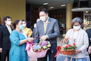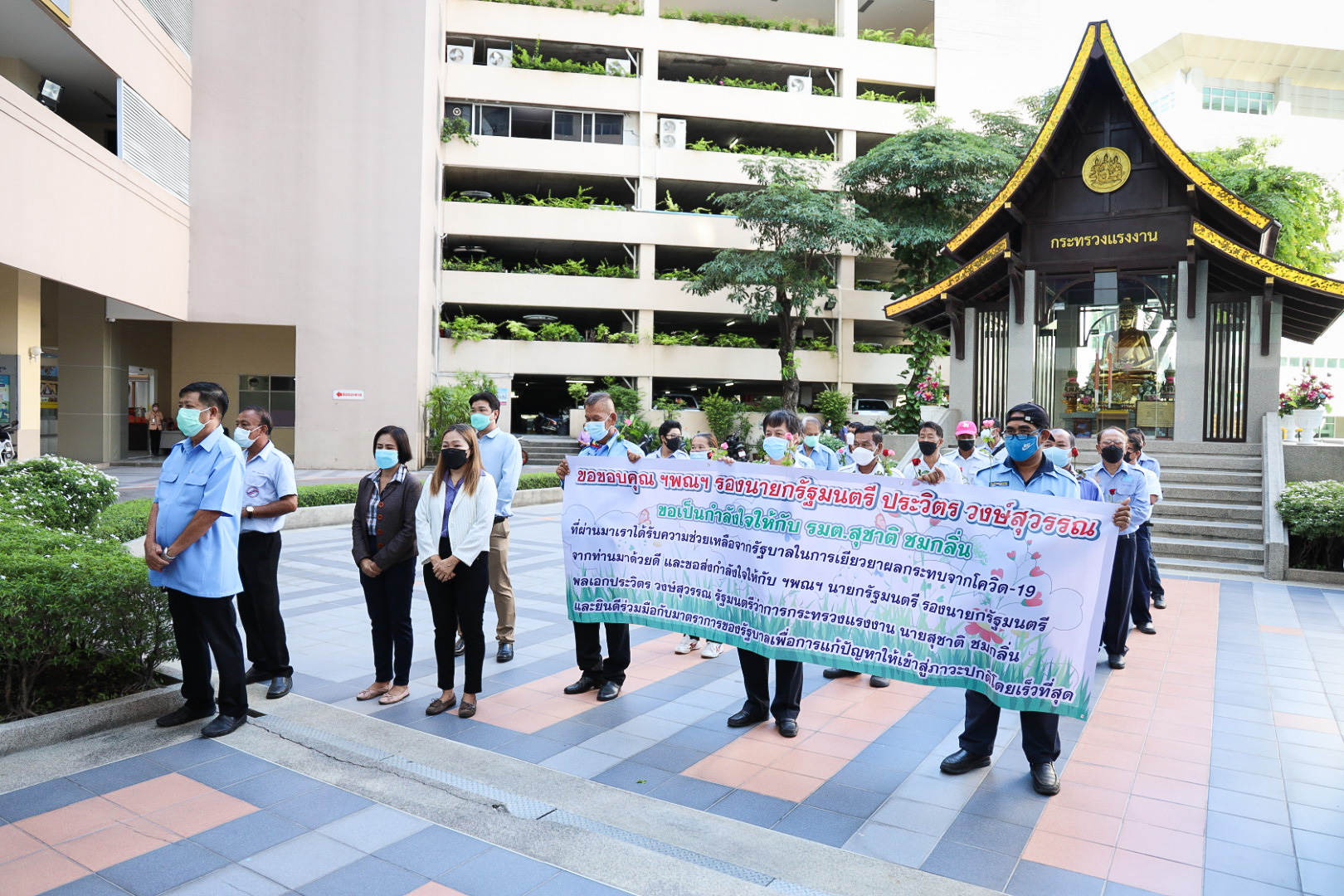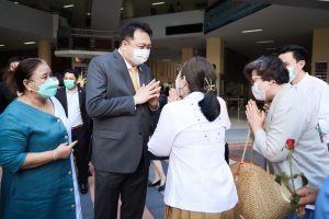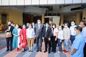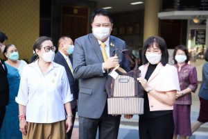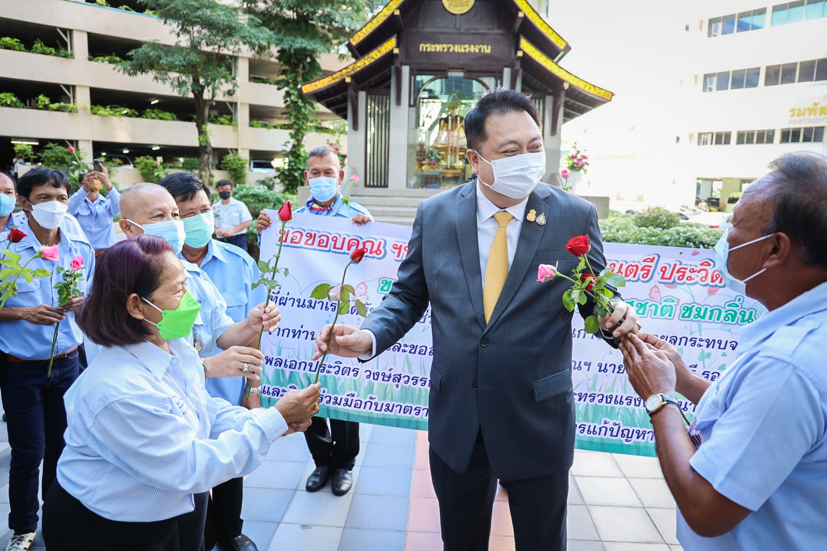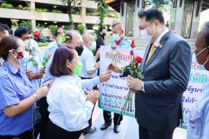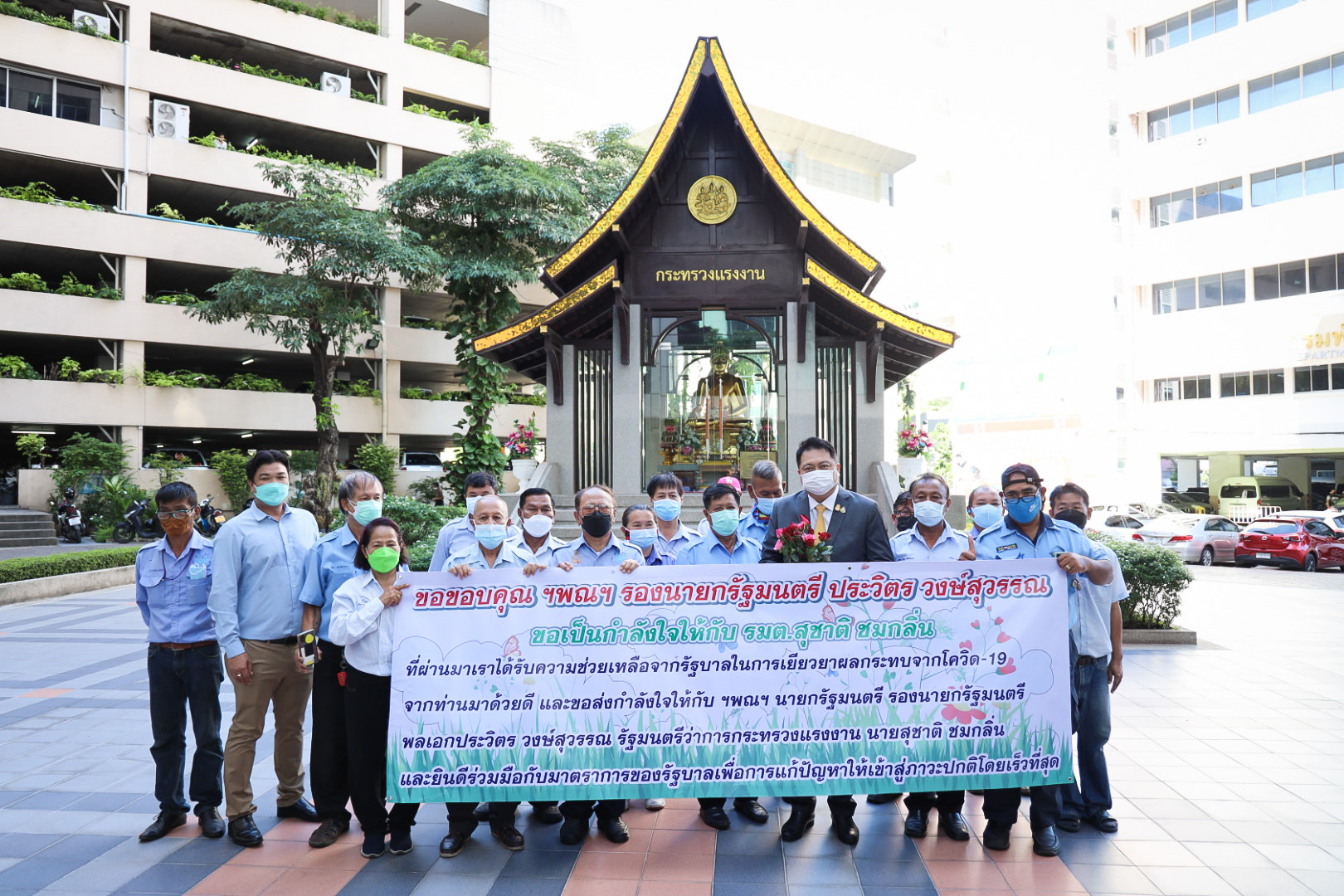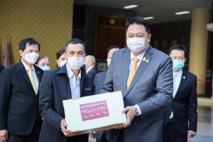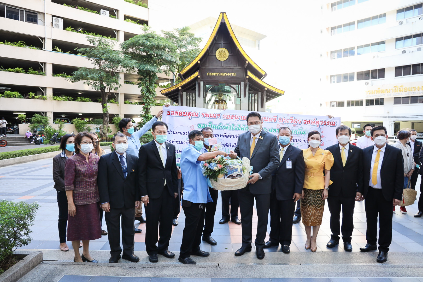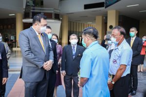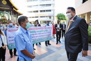 On August 18, 2021, labor leaders led by President of the Thai Taxi Association, Mr. Witoon Naewpanich, President of the Thai Restaurant Association, Mrs. Thaniwan Kulmongkol, and Chairman of the Bangkok Street Hawker Club, Ms. Yada Phornpetchrampha, met Labour Minister Mr. Suchart Chomklin to give souvenirs to thank Prime Minister General Prayuth Chan-ocha, Deputy Prime Minister General Prawit Wongsuwan and Labour Minister Mr. Suchart Chomklin, on the occasion of supporting the three labour groups, who were affected by COVID-19. The occasion took place at the foyer on the ground floor, Ministry of Labour. The Ministry of Labour’s Advisor, Mrs. Thiwalrat Angkinan, the Labour Minister’s Secretariat Mr. Suthep Chitayawong, the Ministry of Labour’s Spokesperson (on politics) Mrs. Theanrat Nawamawat, Permanent Secretary of Labour Mr. Suthi Sukosol, and the Ministry of Labour’s executives also joined the occasion.