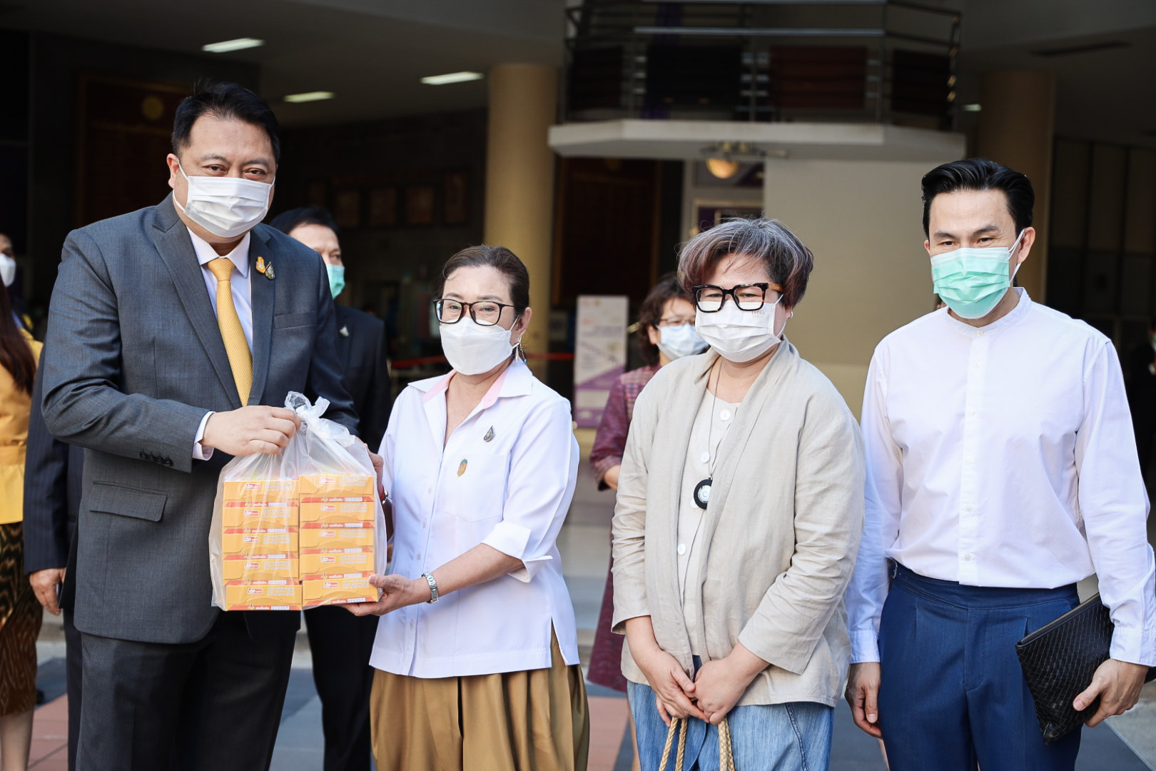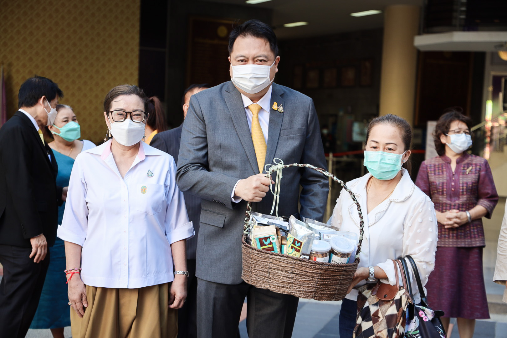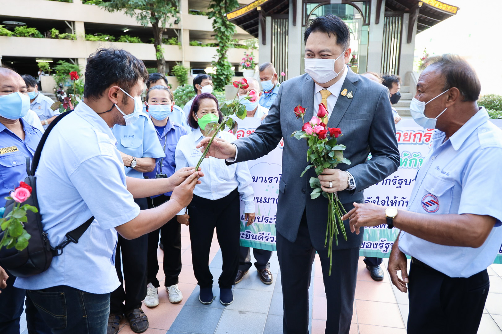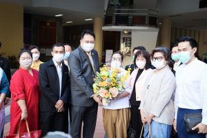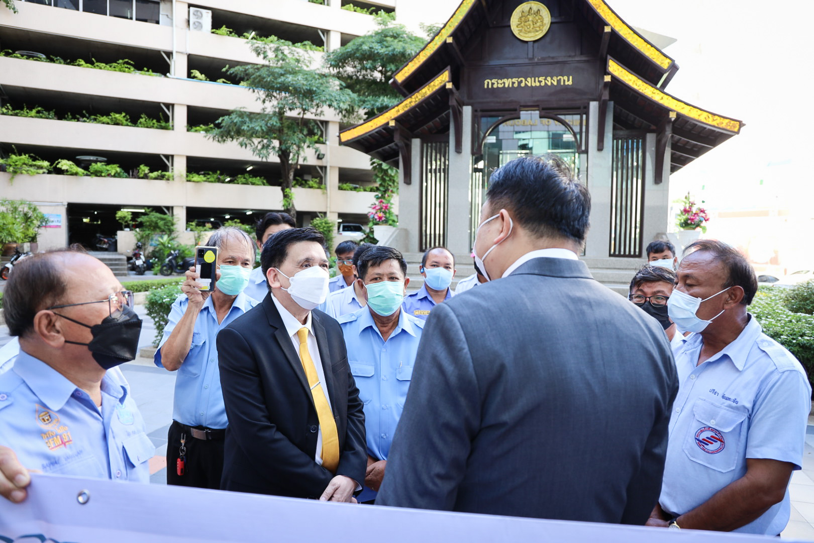 On August 18, 2021, labor leaders led by President of the Thai Taxi Association, Mr. Witoon Naewpanich, President of the Thai Restaurant Association, Mrs. Thaniwan Kulmongkol, and Chairman of the Bangkok Street Hawker Club, Ms. Yada Phornpetchrampha, met Labour Minister Mr. Suchart Chomklin to give souvenirs to thank Prime Minister General Prayuth Chan-ocha, Deputy Prime Minister General Prawit Wongsuwan and Labour Minister Mr. Suchart Chomklin, on the occasion of supporting the three labour groups, who were affected by COVID-19. The occasion took place at the foyer on the ground floor, Ministry of Labour. The Ministry of Labour’s Advisor, Mrs. Thiwalrat Angkinan, the Labour Minister’s Secretariat Mr. Suthep Chitayawong, the Ministry of Labour’s Spokesperson (on politics) Mrs. Theanrat Nawamawat, Permanent Secretary of Labour Mr. Suthi Sukosol, and the Ministry of Labour’s executives also joined the occasion.