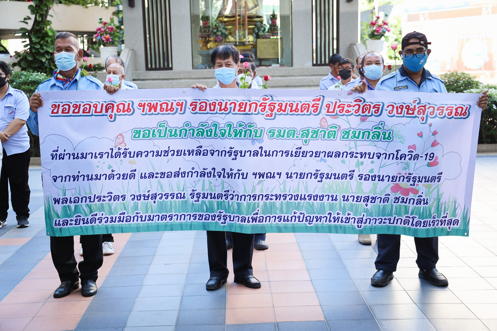 Chairman of the Bangkok Street Hawker Club, Ms. Yada Phornpetchrampha, said that today, the Bangkok Hawker Club came to thank the Prime Minister and Deputy Prime Minister General Prawit Wongsuwan and came to support Labour Minister Mr. Suchart Chomklin. She said that her group is at the grassroots and vulnerable, and they had the opportunity to participate in the “Shops to Workers Sharing Project” to prepare lunch boxes for worker camps. She said that the group could see efforts that support them and therefore want to show the public that they are encouraging and protecting good people working for the nation.