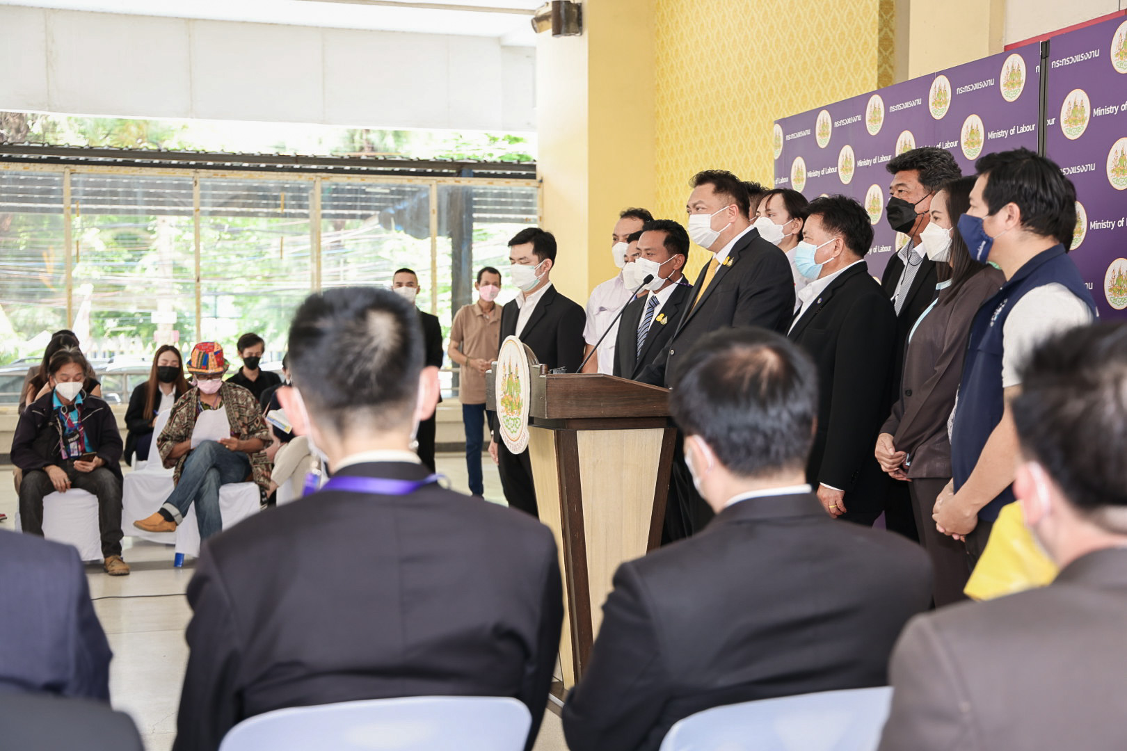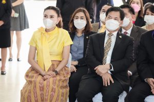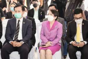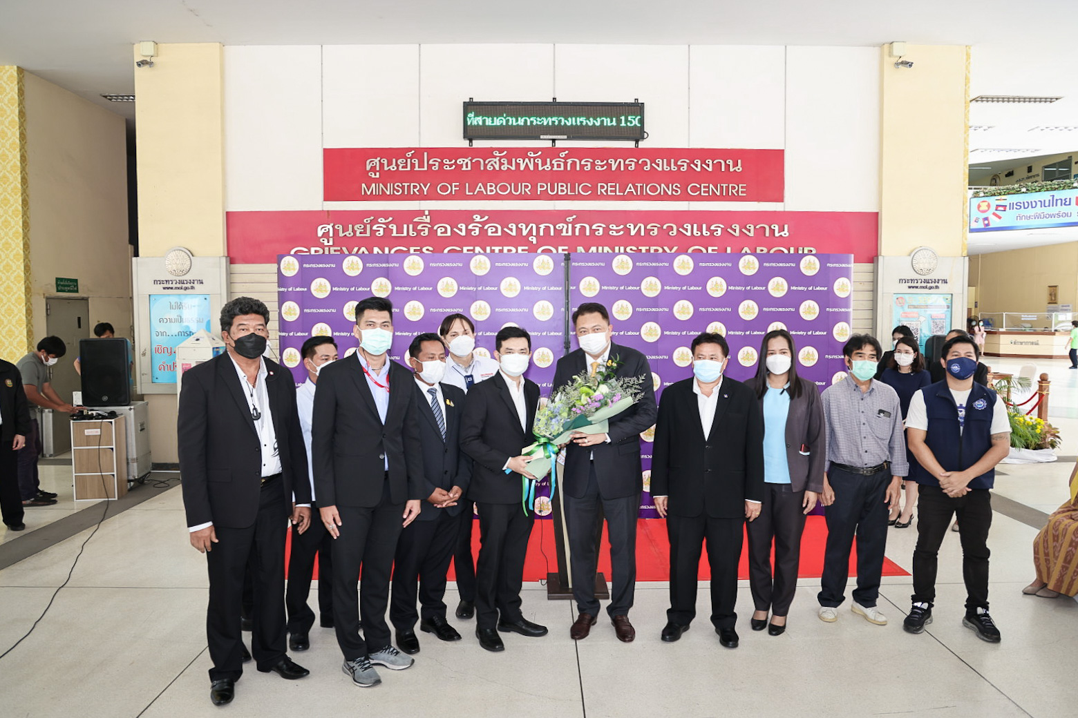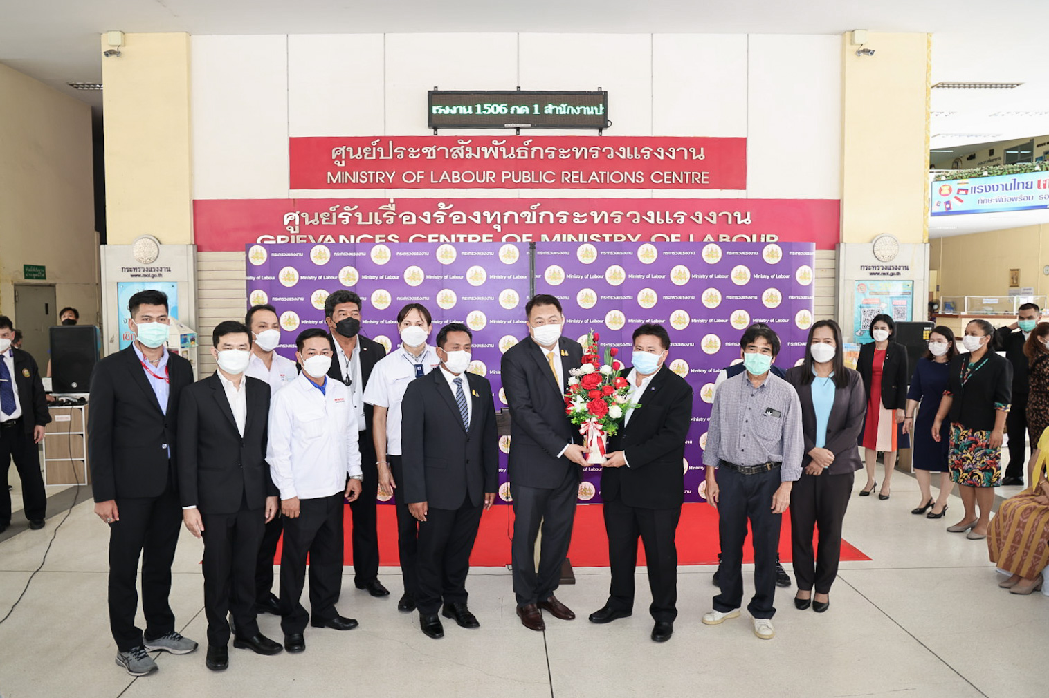On May 11, 2022, Labour Minister Mr. Suchart Chomklin welcomed a group of labour leaders led by Mr. Manit Promkarikul, Chairman of the Federation of Thailand Automobile Workers, Mr. Charlie Loysung, Advisor to the Thai Labour Solidarity Committee, Mr. Chansin Subnonwai, Chairman of the Social Workers Group, and committees, on the occasion of meeting the Labour Minister to present a bouquet. The occasion was to express gratitude to the government, led by Prime Minister and Minister of Defence General Prayuth Chan-ocha through the Labour Minister, who has helped push for the Social Security Act (No…) B.E. …. It was approved by the Cabinet yesterday (May 10, 2022). Labour leaders had previously called for amendments to the old-age benefits to alleviate troubles. The Labour Minister’s Advisor, Mrs. Thiwalrat Angkinan, Secretariat to the Labour Minister, Mr. Suthep Chitvong, Assistant Ministers from the Prime Minister’s Office performing duties for the Ministry of Labour, Mr. Suthi Sukosol, the Ministry of Labour’s Spokesperson (on politics), Mrs. Thienrat Navamawat, Permanent Secretary of Labour, Mr. Boonchob Suttamanaswong, and the Ministry of Labour’s senior executives participated in this event at the foyer on the 1st floor, Ministry of Labour.