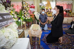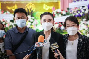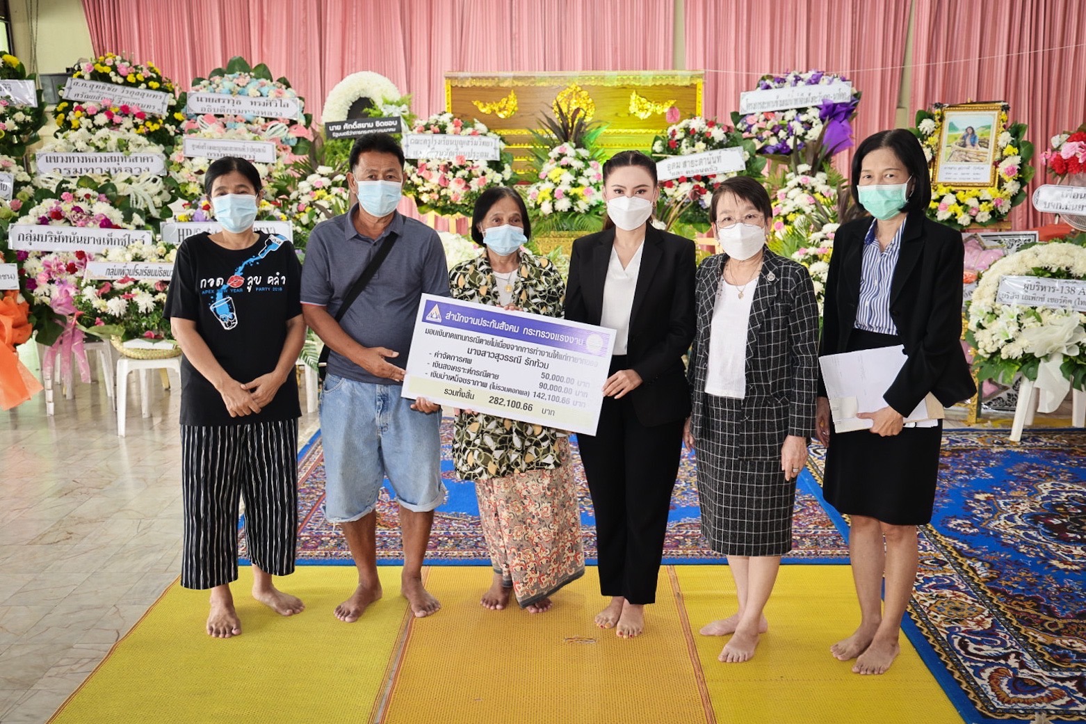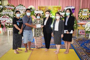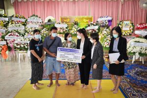 On August 5, 2022, Labour Minister Mr. Suchart Chomklin assigned Mrs. Thiwalrat Angkinan, the Ministry of Labour’s Spokesperson (on politics), Mrs. Thienrat Navamawat, to visit the area to give compensation to the dependents of the insured person who died from an accident on the U-turn bridge, where a cement sheet fell on the construction worker of the Department of Highways in Rama 2 Road. The occasion took place at the Sai Temple, Soi Ekachai 23, Chom Thong District, Bangkok.
