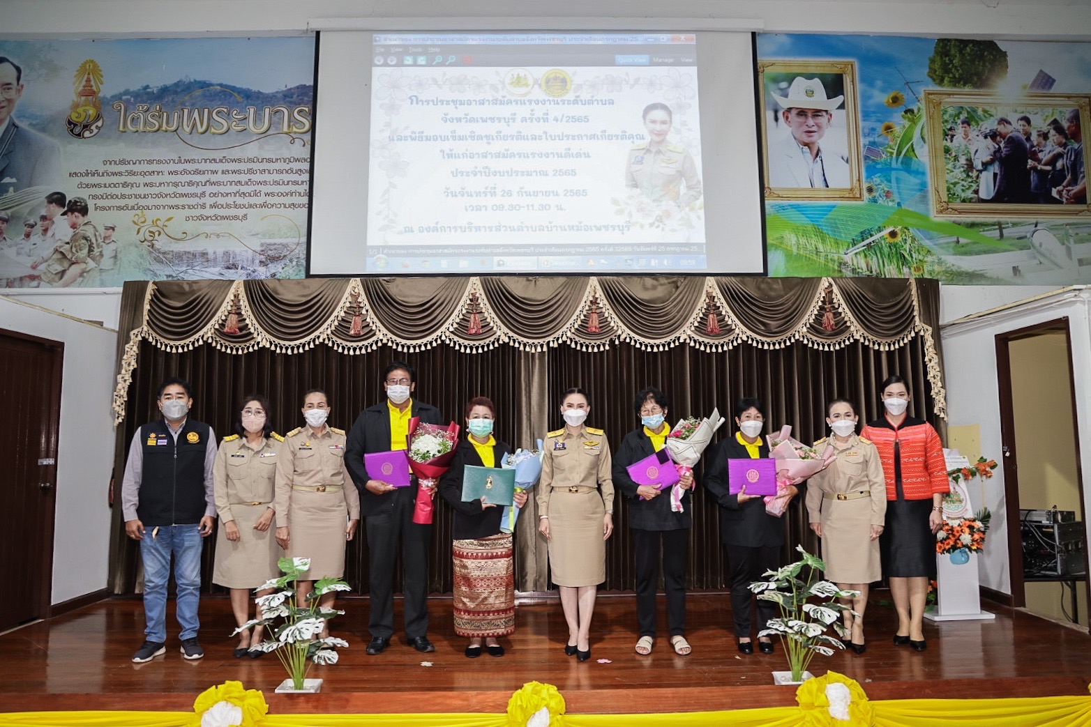 Two labour volunteers received an award for outstanding labour volunteer for 2022 at the provincial level, receiving a pin and certificate. The awardees were Mrs. Chanya Thao Noi, a leading labour volunteer at Khao Yoi Subdistrict, Khao Yoi District, Phetchaburi Province, and Mrs. Supattra Rattanabanchong, a leading labour volunteer at Bang Khon Tee Subdistrict, Bang Khon Tee District, Samut Songkhram Province. Two people were awarded outstanding labour volunteers at the district level in Phetchaburi Province, consisting of Mrs. Pranee Buppharam, a leading labour volunteer at Nong Ya Plong Subdistrict, Nong Ya Plong District, Phetchaburi Province, and Mr. Chokchai Chamchoi, a leading labour volunteer at Tha Raeng Subdistrict, Ban Laem District, Phetchaburi Province. This award was presented to recognize and build morale for outstanding labour volunteers who contribute to society and the Ministry of Labour in helping to coordinate various labour services to people in the area/community to continually achieve concrete results.