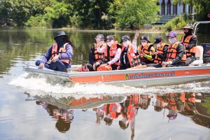 From there, Mrs. Thiwalrat and the committee traveled to the area to visit, support, and donate 230 relief bags to flood victims of Ang Thong Province, along with 6,000 bottles of drinking water at the Pa Mok District Office in Ang Thong Province. Deputy Governor of Ang Thong Province, Mr. Sakda Bandasak, received the donations. The committee got onto a barge to visit, give encouragement and items to Ang Thong Province’s flood victims, ten workers from affected workplaces, informal workers under Section 40, 13 labour volunteers, and ten community leaders representing the victims. The heads of government agencies under the Ministry of Labour in Ang Thong Province also joined the occasion.