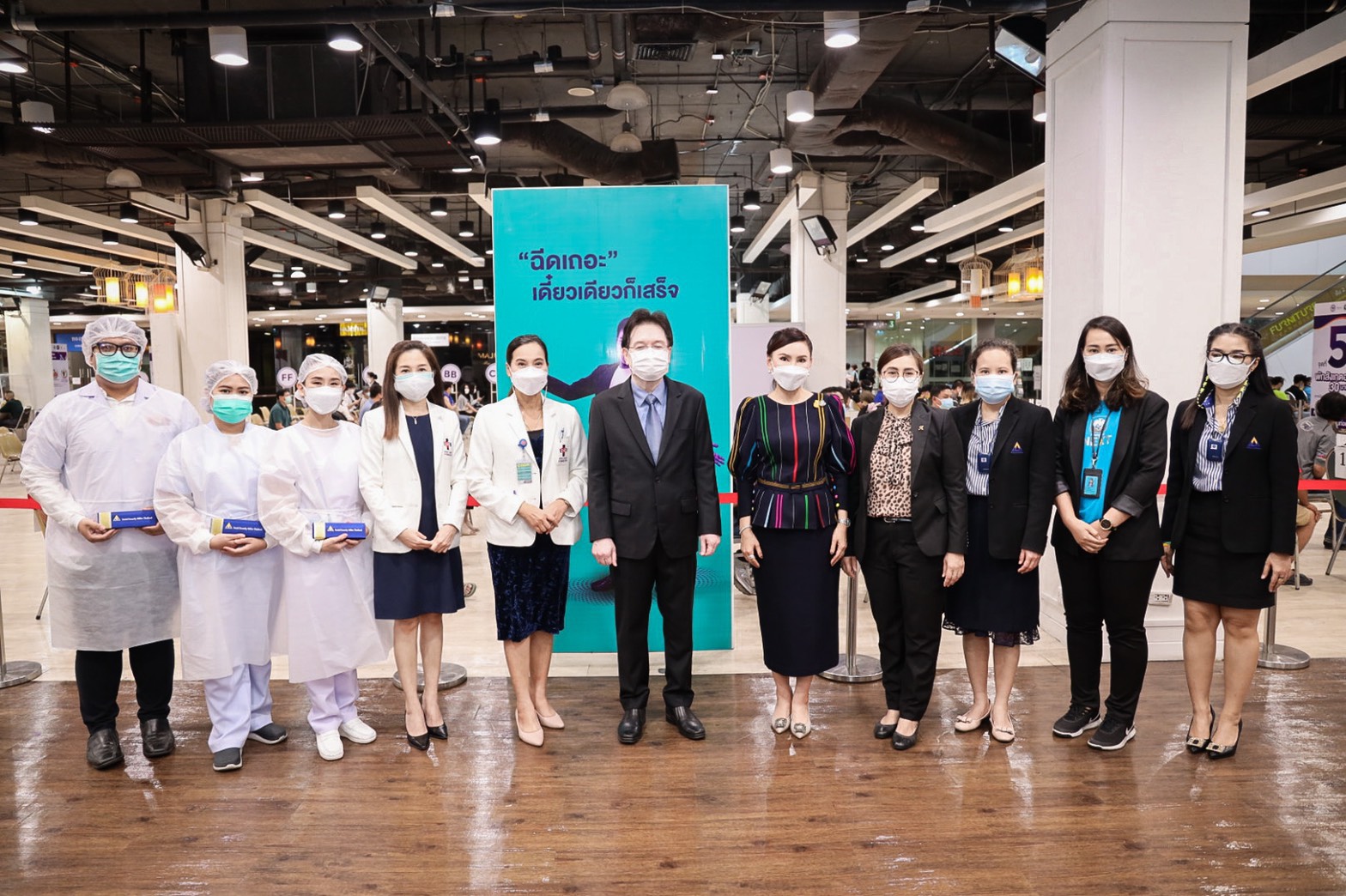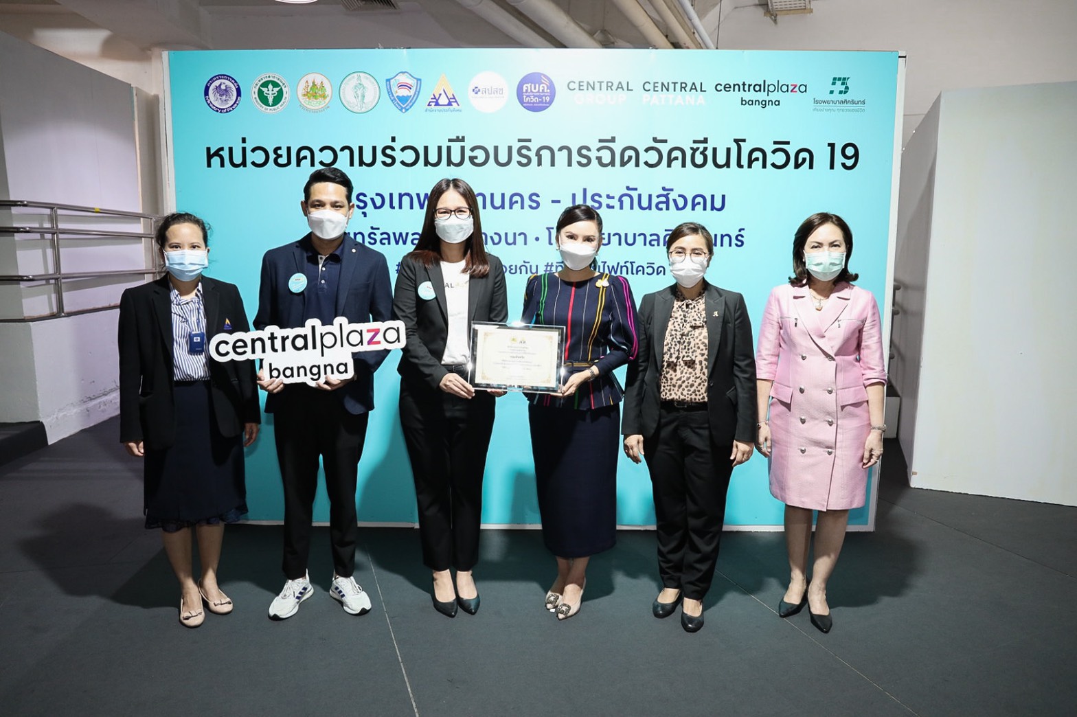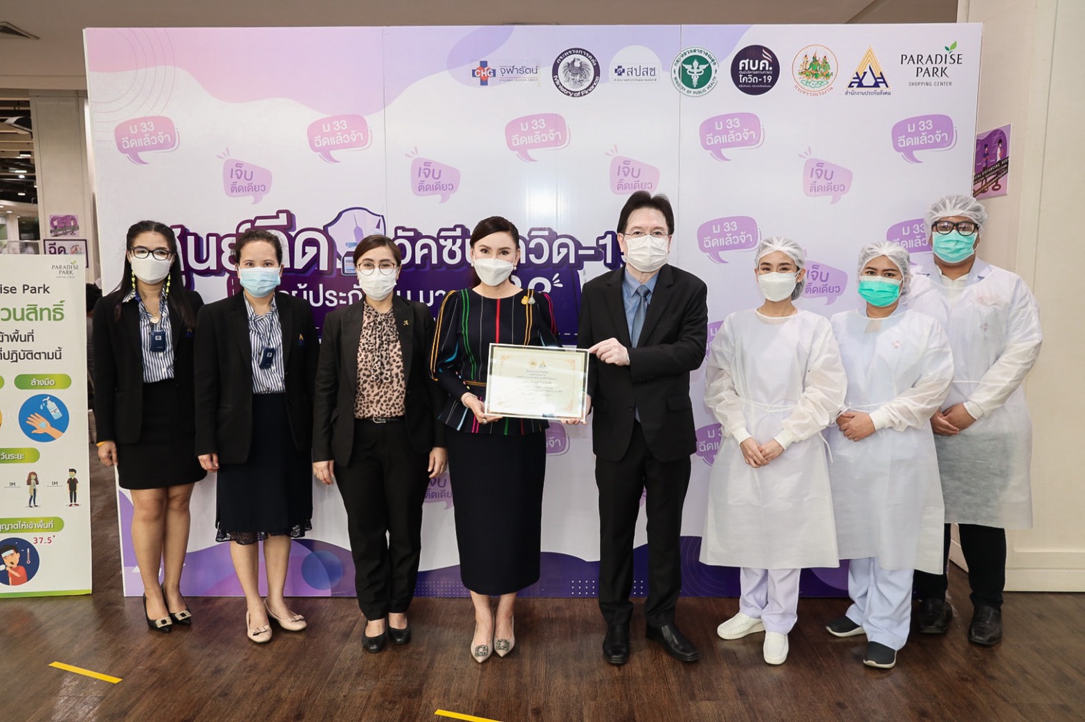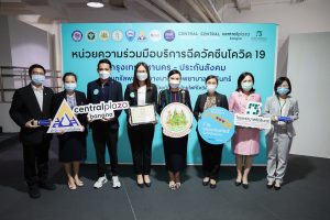 On August 25, 2021, Labour Minister Mr. Suchart Chomklin assigned the Ministry of Labour’s Advisor, Mrs. Thiwalrat Angkinan, and the Ministry of Labour’s Inspector-General, Ms. Bubpha Rueangsud, to present a certificate of appreciation to the private sector for their contribution in providing facilities and hospitals in the social security network for supporting medical personnel in the COVID-19 vaccinations to Section 33 insured persons. The occasion took place at Bangkok Bank Club, Paradise Park Shopping Center, and Central Bangna Shopping Center. Mrs. Thiwalrat said that the government under the leadership of Prime Minister and Minister of Defense General Prayuth Chan-ocha, and Deputy Prime Minister General Prawit Wongsuwan, who oversees the Ministry of Labour, is concerned about the workforce and the general public amid the COVID-19 situation, promoting vaccinations as a national agenda. The Labour Minister assigned the Social Security Office to work with the Ministry of Interior, the Bangkok Metropolitan Administration, the Ministry of Public Health by the National Health Security Office (NHSO), the Ministry of Finance by Krung Thai Bank, and public and private social security networked hospitals to provide COVID-19 vaccinations to insured persons. The initiative aims to control the outbreak’s spread from spreading to a wide area in factories and establishments.