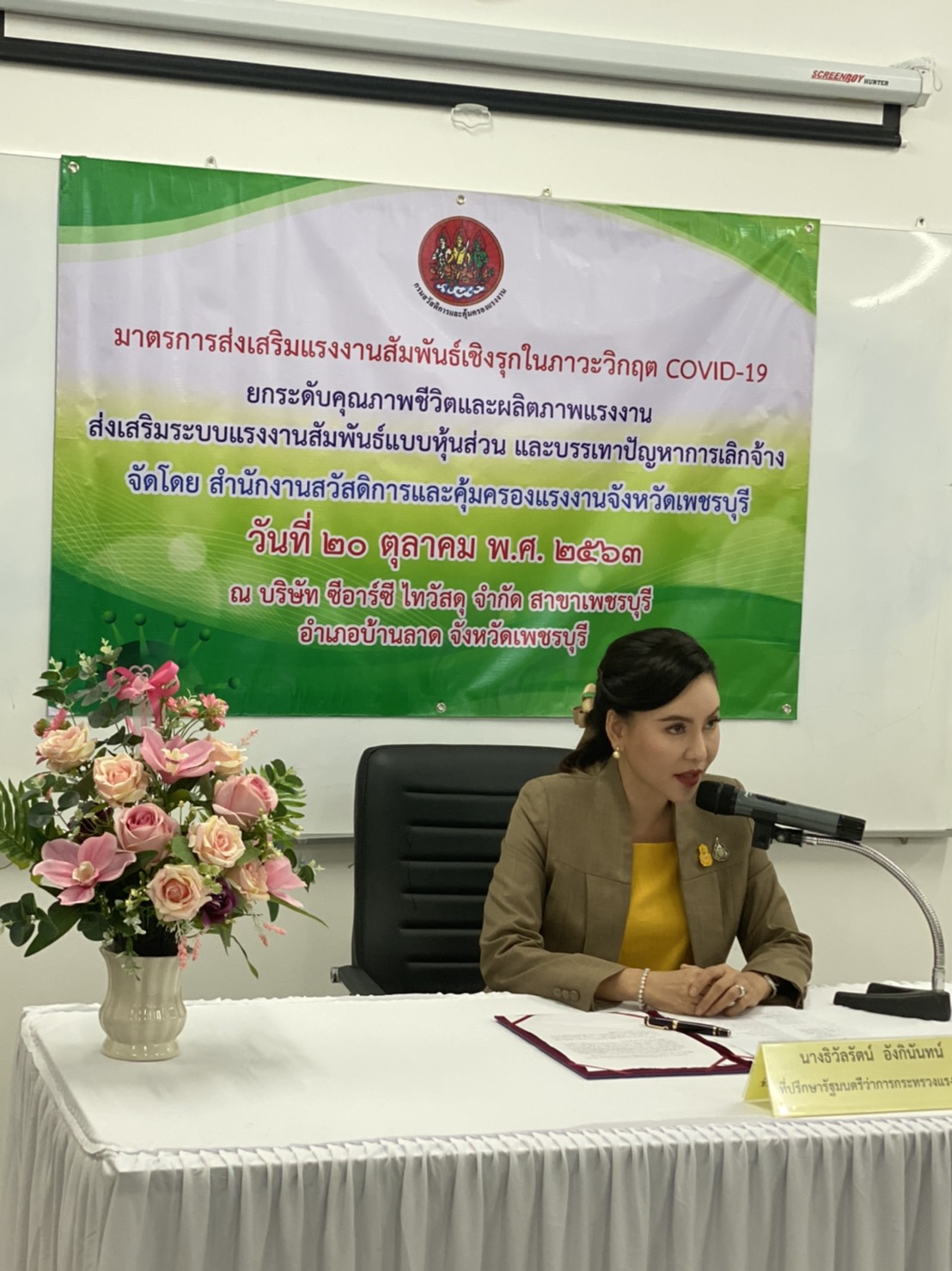 On October 20, 2020, Labour Minister Mr. Suchart Chomklin assigned Advisor to the Labour Minister Mrs. Thiwalrat Angkinan to preside over the meeting on measures to promote proactive labour relations during the Covid-19 crisis, to raise the quality of life and labour productivity, promote partner labour relations systems and alleviate the issue of workforce reductions at CRC Thai Watsadu Co., Ltd., Phetchaburi Branch, Samo Phlue, Ban Lat, Phetchaburi. Deputy Governor of Phetchaburi, Sheriff of Ban Lat District, President of Samo Plu Subdistrict Administrative Organization, executives of CRC Thai Watsadu, and heads of government agencies under the Ministry of Labour from Phetchaburi province gave a welcoming. Advisor to the Labour Minister said that the government, under Prime Minister General Prayuth Chan-ocha, gives importance to promoting employment to drive the country’s economy. She said that today, the Labour Minister Mr. Suchart Chomklin had assigned her to chair the conference on measures to promote proactive labour relations in the Covid-19 crisis, improve the quality of life and labour productivity, and promote partner labour relations systems and alleviate issues of workforce reductions. The labour relations system is important to the employment structure. It should adhere to the Sufficiency Economic Philosophy, and His Majesty King Bhumibol Adulyadej’s sciences applied to build good labour relations under the concept of “employers and employees working together as partners.” The initiatives will also help develop an organizational labour relations system to resolve labour disputes and conflicts by applying good faith as a negotiation principle. It will also promote and encourage cooperation between employers and employees, supporting good relationships and lasting friendships, and achieve peace in the workforce, especially during the Covid-19 pandemic situation.