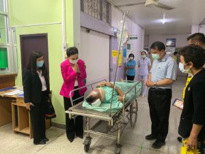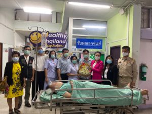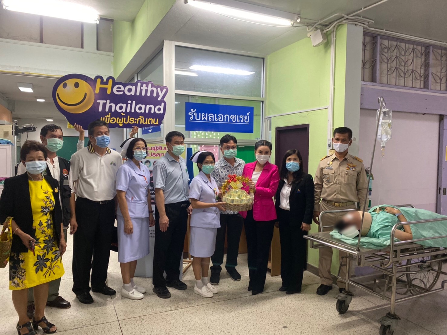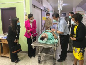 On October 16, 2020, the Labour Minister assigned Advisor to the Labour Minister Mrs. Thiwalrat Angkinan to visit and give words of encouragement to insured persons involved in the train collision with a car at Phrachomklao Hospital in Phetchaburi, Mueang Phetchaburi, Phetchaburi. Director of King Mongkut’s Hospital in Phetchaburi Dr. Chumpol Dechaampai, Phetchaburi Social Security Officer Mrs. Rasamee Sujto, and heads of government agencies under the Ministry of Labour gave a welcoming.