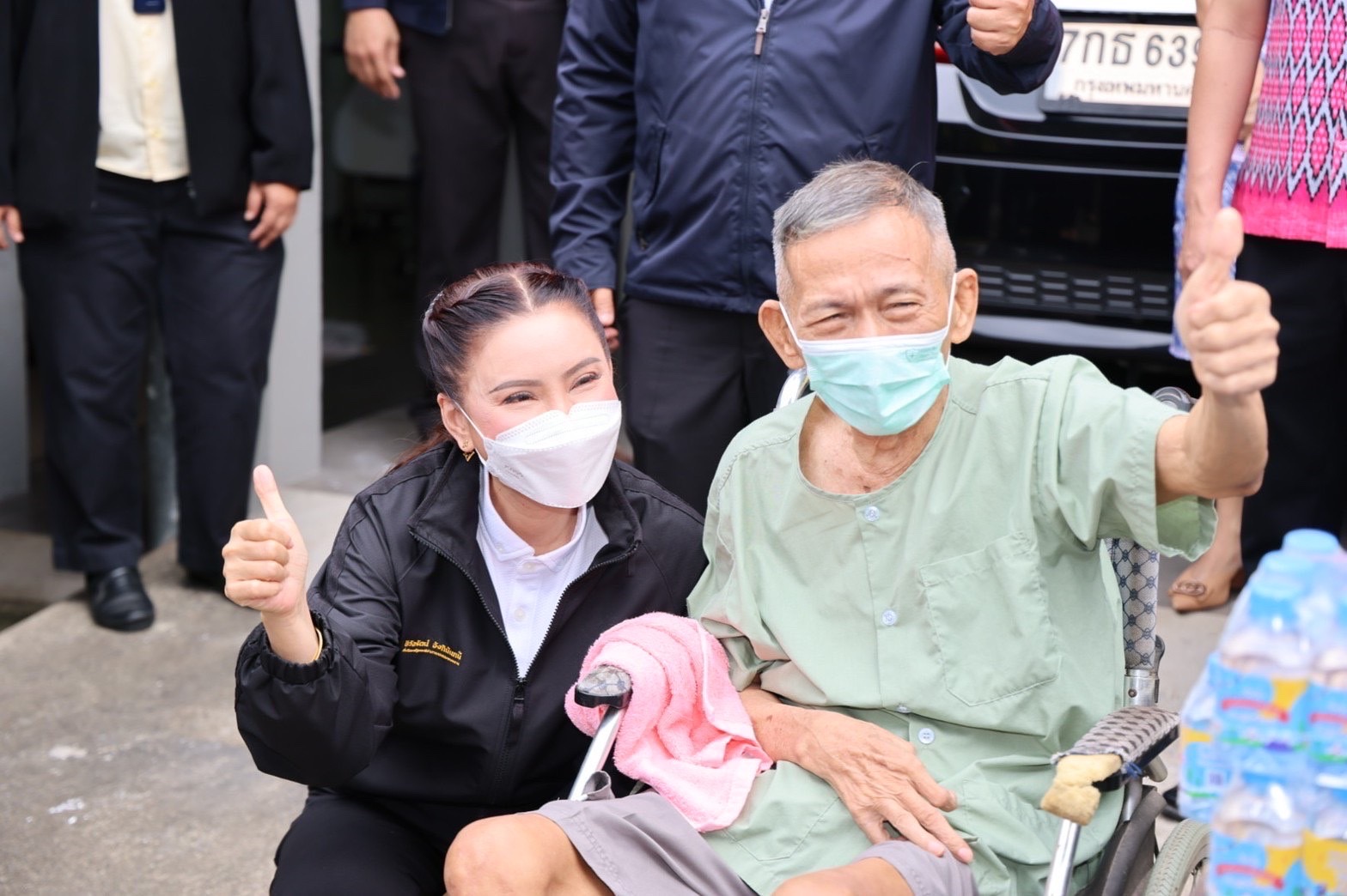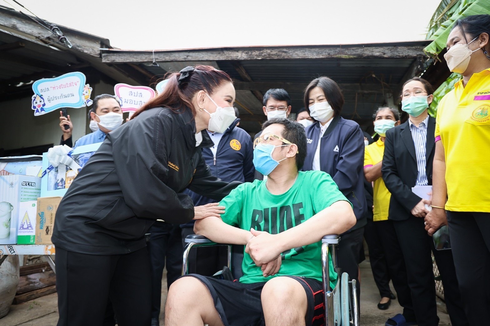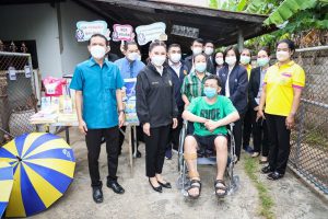 The Labour Minister’s Advisor, Mrs. Thiwalrat Angkinan, said that the Labour Minister, Mr. Suchart Chomklin, cares about the insured persons with disabilities, and is ready to support, monitor, and help recover their body and mind, giving insured persons a better quality of life. Thus, she and her team were assigned to visit Pak Tho District, Ratchaburi Province, to meet with insured persons with disabilities, talk and give consumer items, including various appliances, and create morale and encouragement for the insured persons. Today, she visited two insurers under the care of the Ratchaburi Provincial Social Security Office. The first was Mr. Pongsak Suksamran, 40, insured under Section 33. He has a disability due to a stroke, which weakened his right arm and leg. He is unable to walk and requires a wheelchair. He has been a person with disabilities since September 2, 2016. He receives compensation for lack of income of 5,065.50 Baht per month and 500 Baht per month for transportation. The second person was Mr. Sanguan Junjerm, 74, insured under Section 39. He has a disability due to a stroke. He is bedridden and unable to support himself. He can communicate with words, but not clearly. He has been a person with disabilities since June 29, 2004. He receives compensation for lack of income of 2,400 Baht per month and 500 Baht per month for transportation.