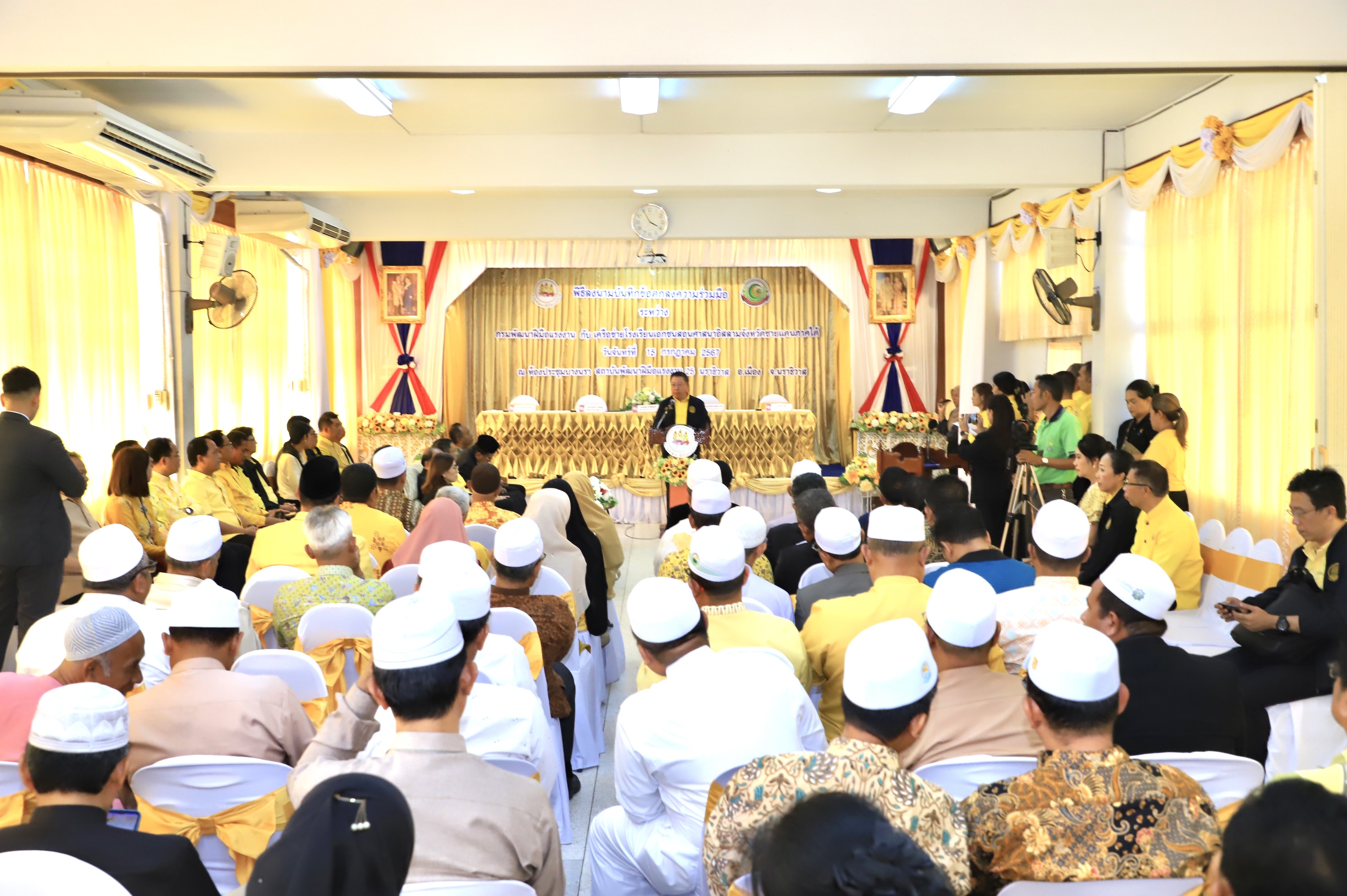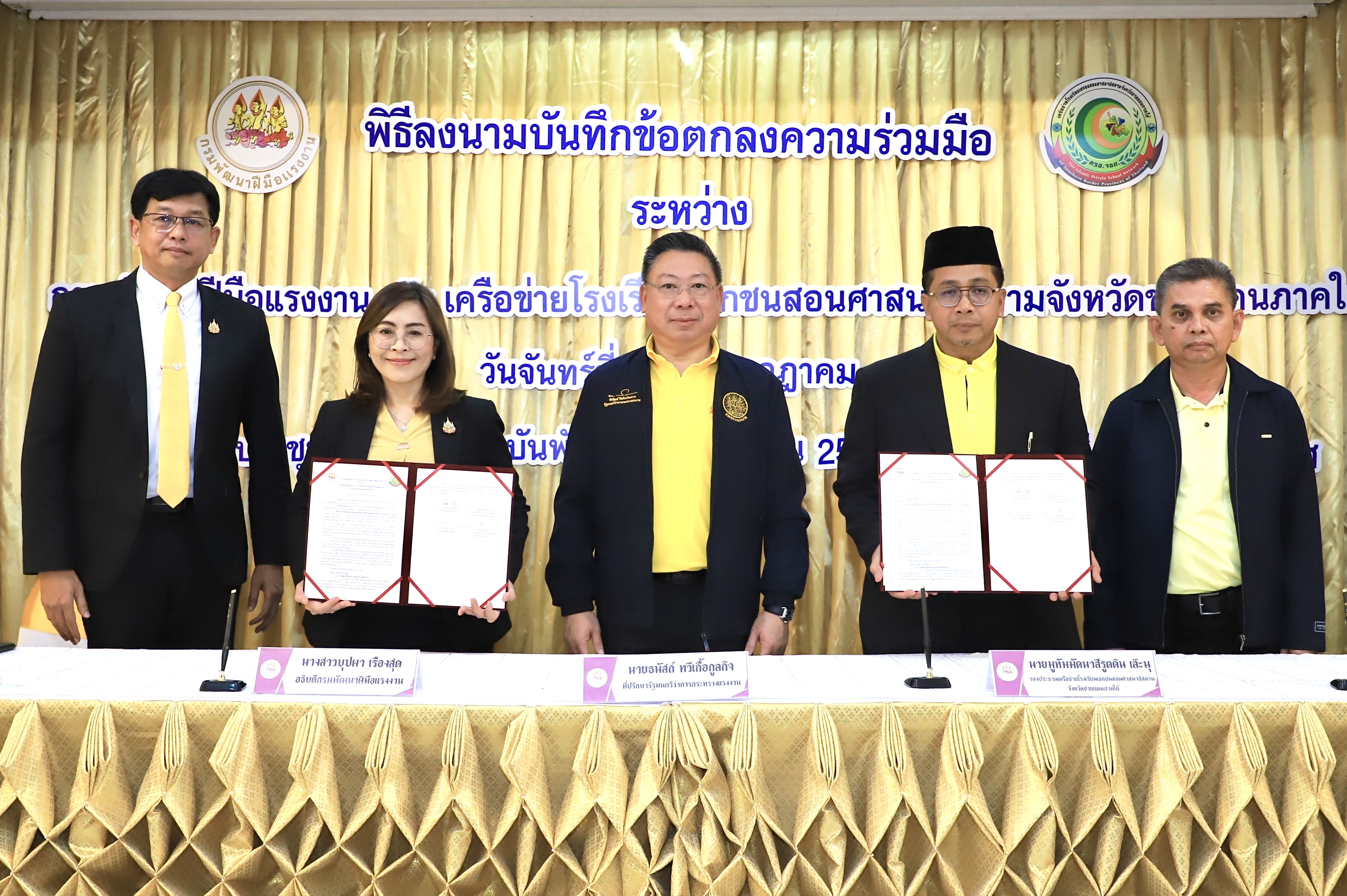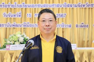 The Advisor to the Labour Minister, Mr. Thanat Thaweekueakulkit, shared that he was pleased and honoured that the Labour Minister, Mr. Phiphat Ratchakitprakarn, assigned him to preside over the signing ceremony of the Memorandum of Understanding between the Ministry of Labour’s Department of Skill Development and a network of private Islamic schools in the southern border provinces. This is in line with the policy of the government and the Ministry of Labour that promotes cooperation in producing manpower in the educational and labour sectors, as well as developing the country to move forward with the new generation of workers. The goal is to develop skills for the workforce and youths in the five southern border provinces, namely Narathiwat, Yala, Pattani, Songkhla, and Satun, which will be an important force for the country in the future. They will have the knowledge, ability, and higher skills to meet labour standards, and to pursue a career to generate income for themself and their family to improve their quality of life and play an important part in the development of society and communities in the area.