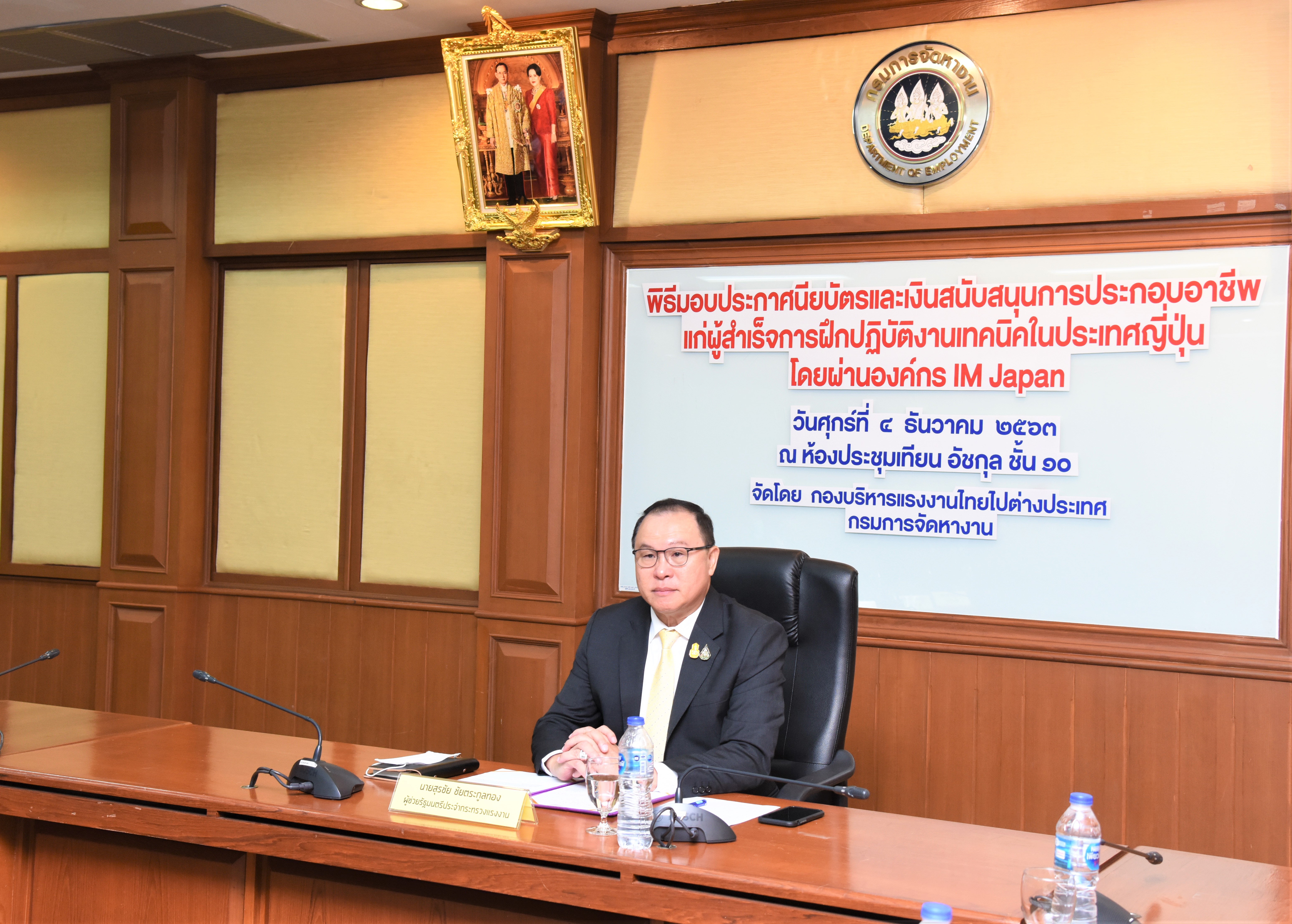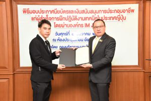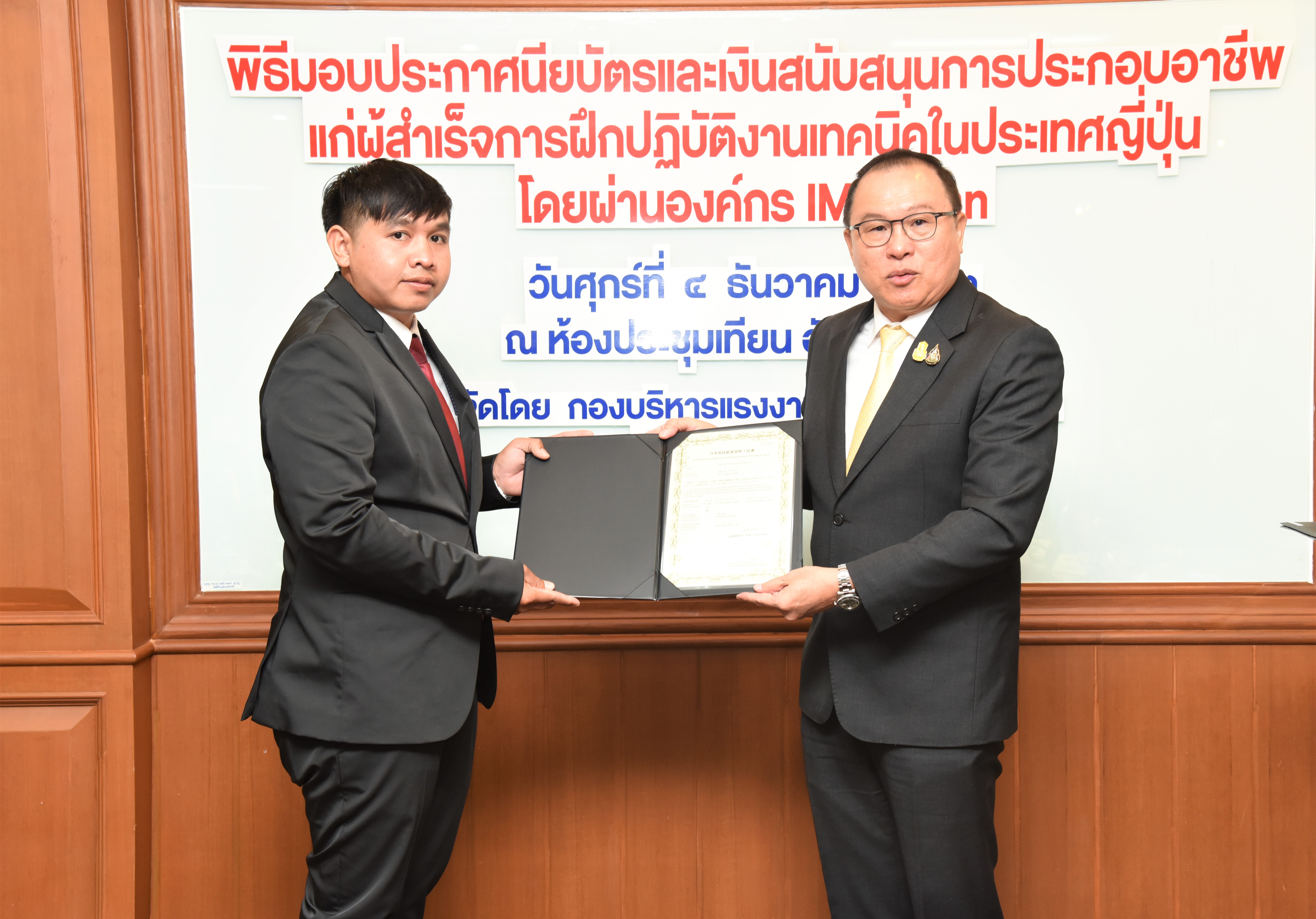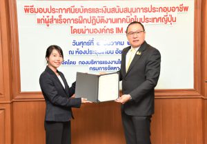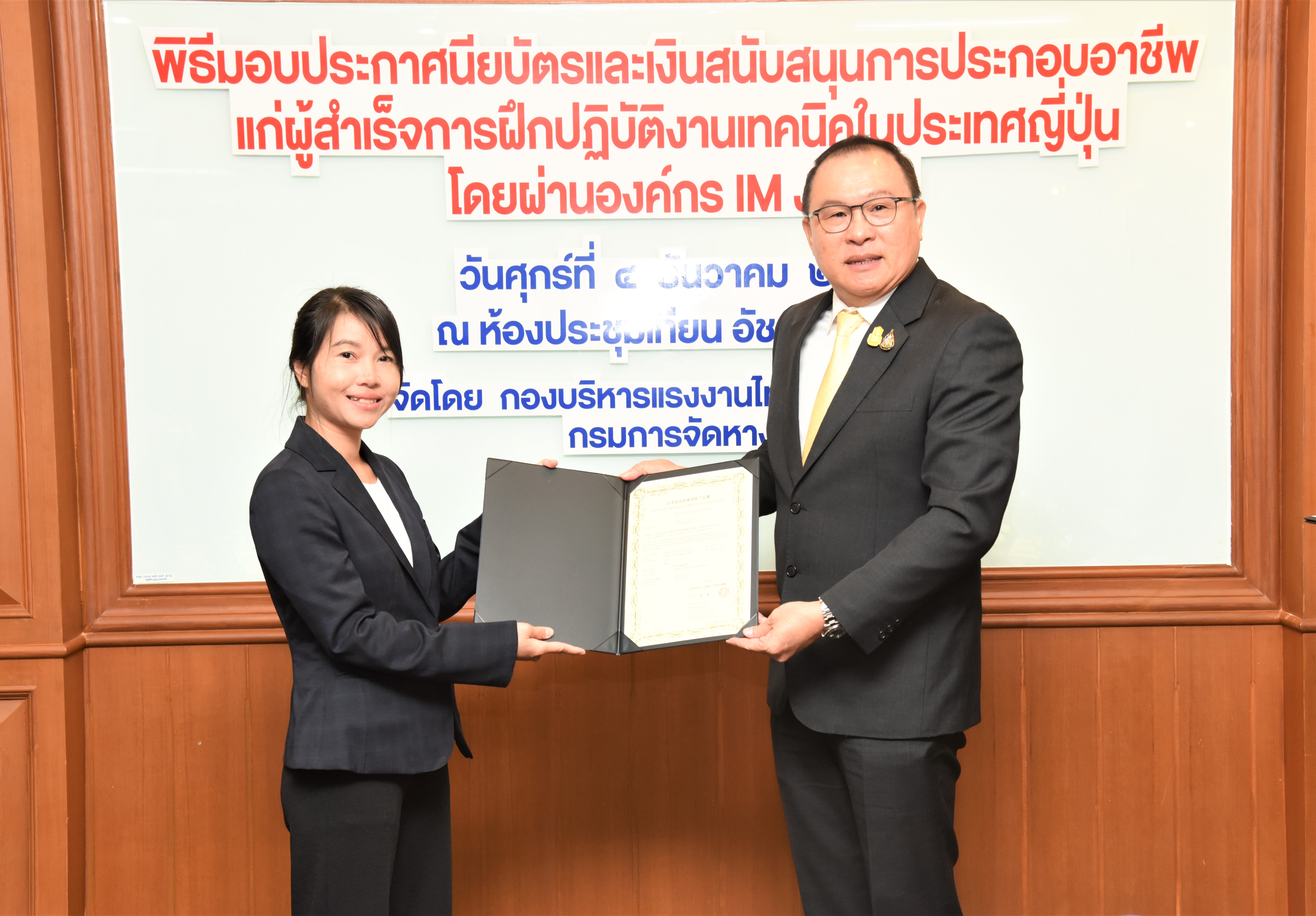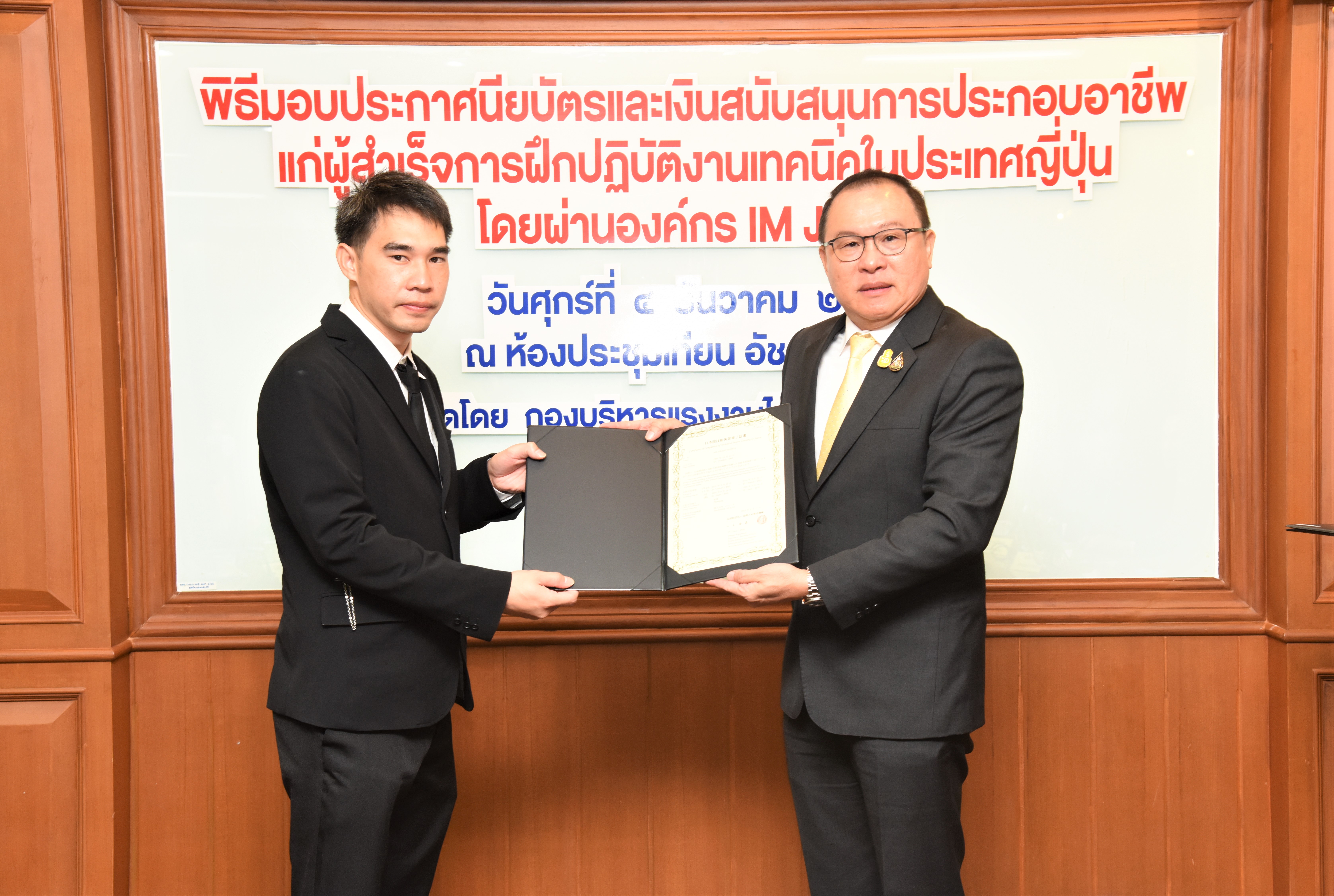 The Labour Minister assigned Assistant to the Labour Minister Mr. Surachai Chaitrakulthong to award certificates and employment support for 19 graduates from the Technical Training Program in Japan (IM JAPAN) totaling 3,195,760 Baht.