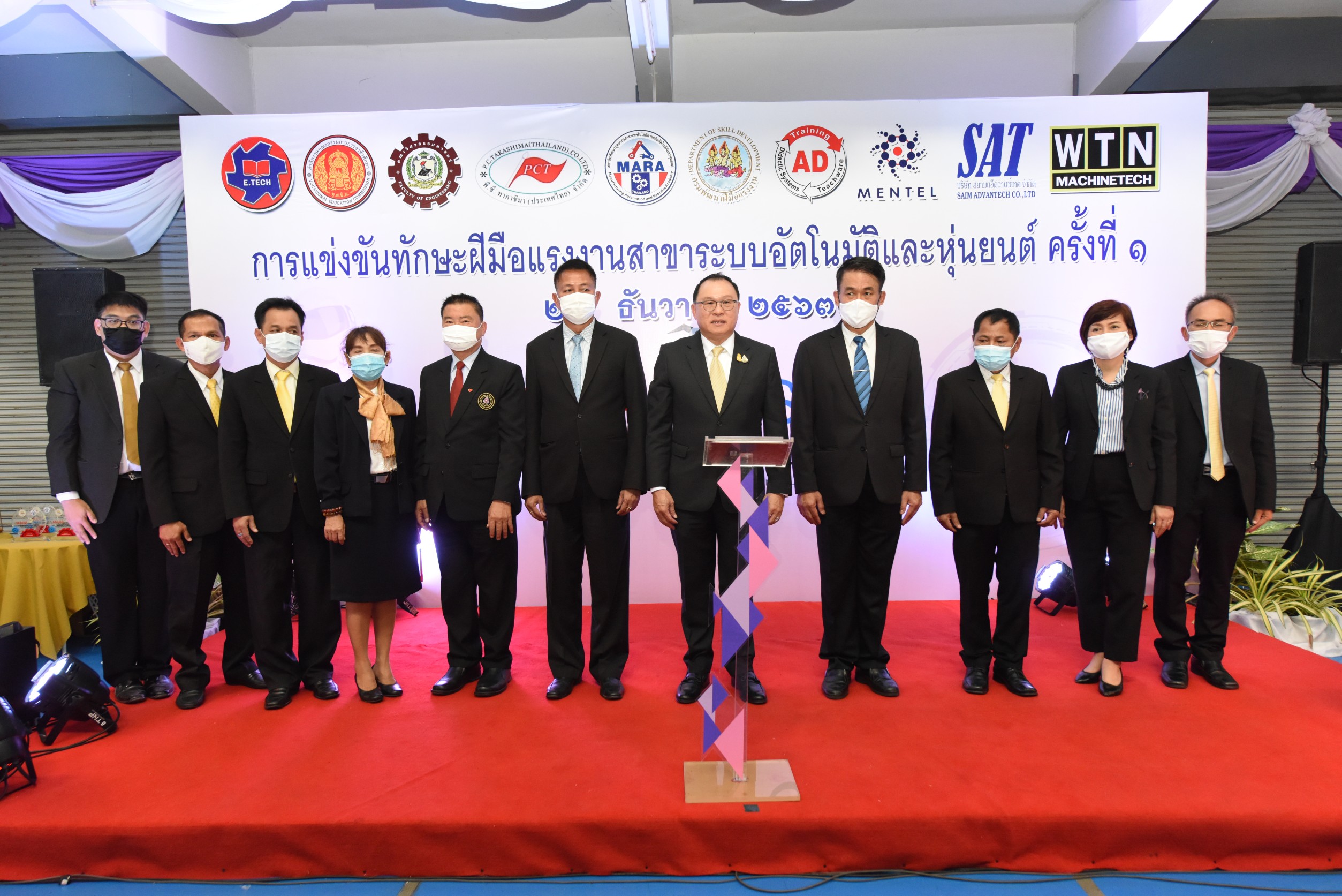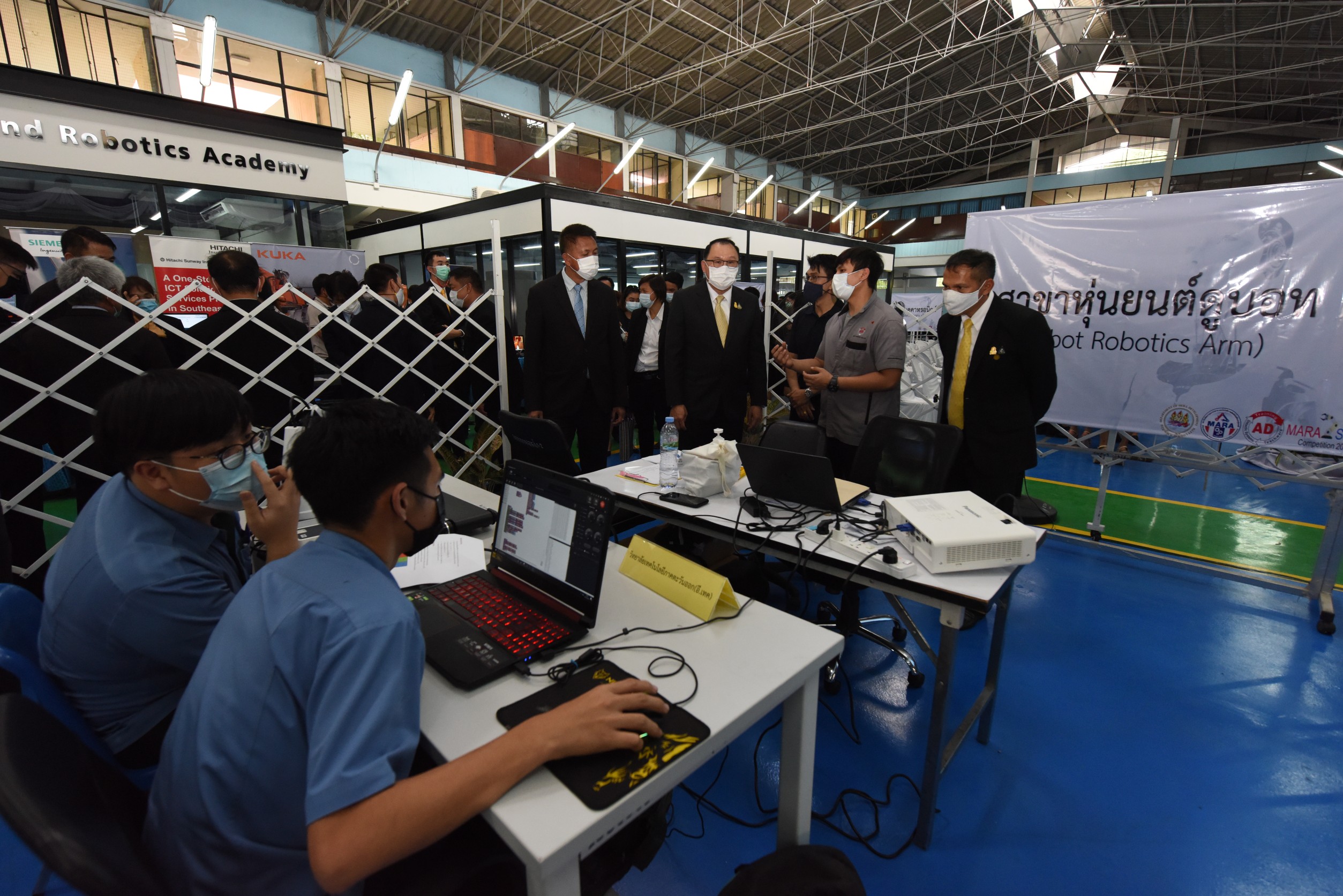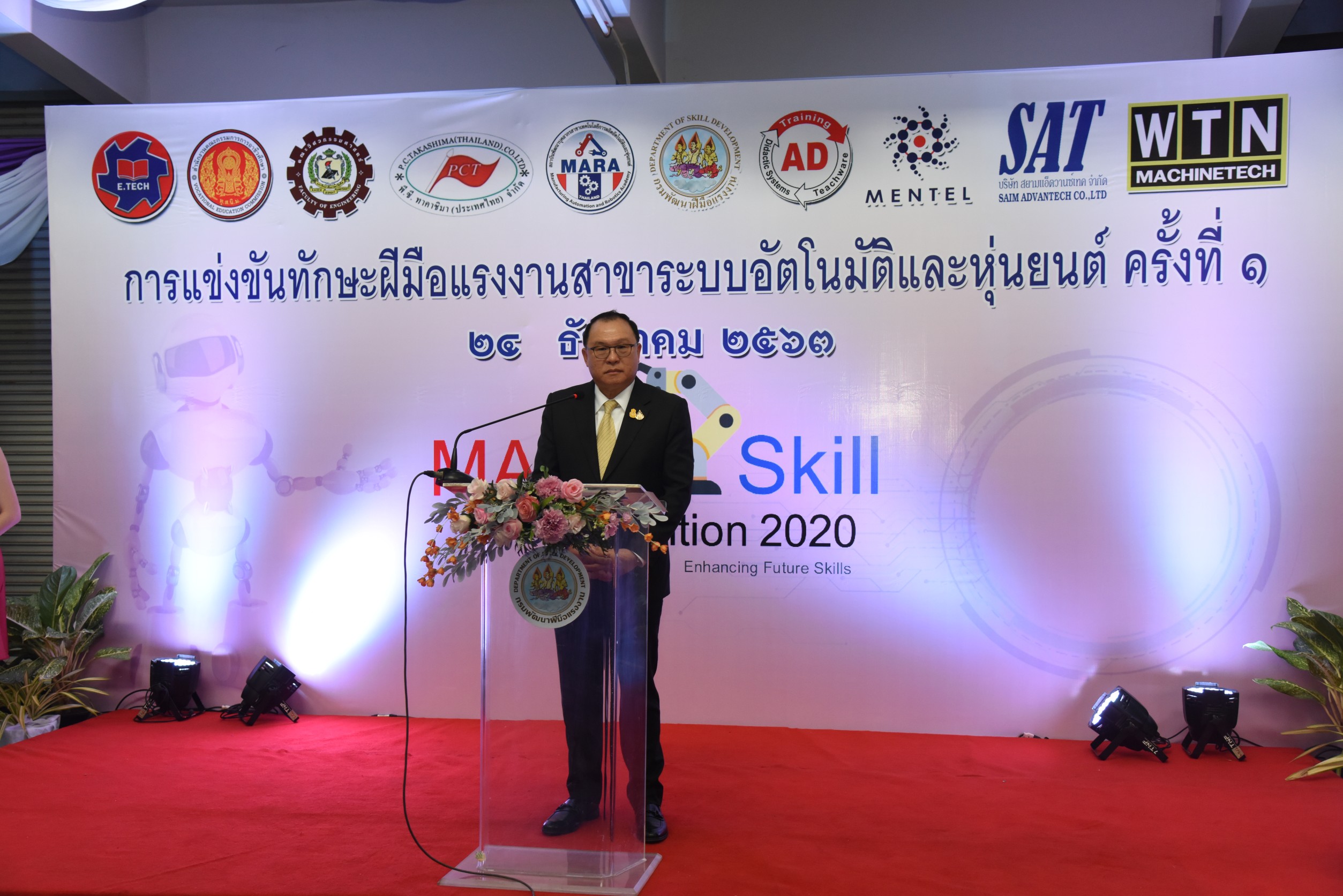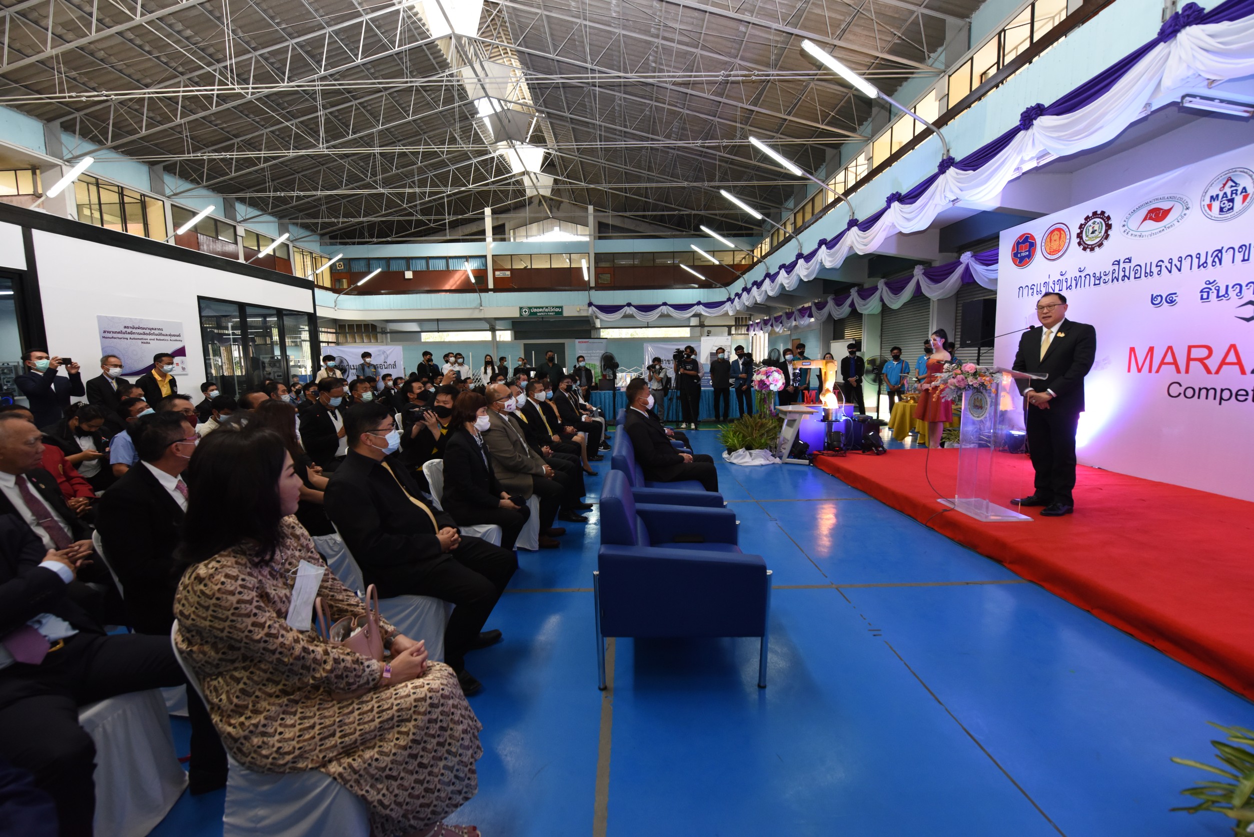 On December 24, 2020, at 14.00 hours, Labour Minister Mr. Surchart Chomklin assigned Assistant to the Labour Minister Mr. Surachai Chaitrakulthong to preside over the commencement of the first Skill Competition in Automation and Robotics to promote the development of skills at the youth level in the EEC area. The competition aims to promote cooperation between government agencies and private sectors and publicize the missions of the Manufacturing Automation and Robotics Academy (MARA). The skills competition is for youths under the age of 22 years, divided into 35 teams from 13 vocational colleges and one higher education institute. There are four competing fields consisting of mechatronics, PLC, mechanical drawing with a three-dimensional computer, and DOBOT robot. He also observed the skills competition in the four branches, observed training activities and skills assessments at the Chonburi Institute for Skill Development 3 and the Manufacturing Automation and Robotics Academy. The Department of Skill Development’s Director-General Mr. Tawat Benchatikul, also joined the occasion at the Manufacturing Automation and Robotics Academy, Muaeng, Chonburi.