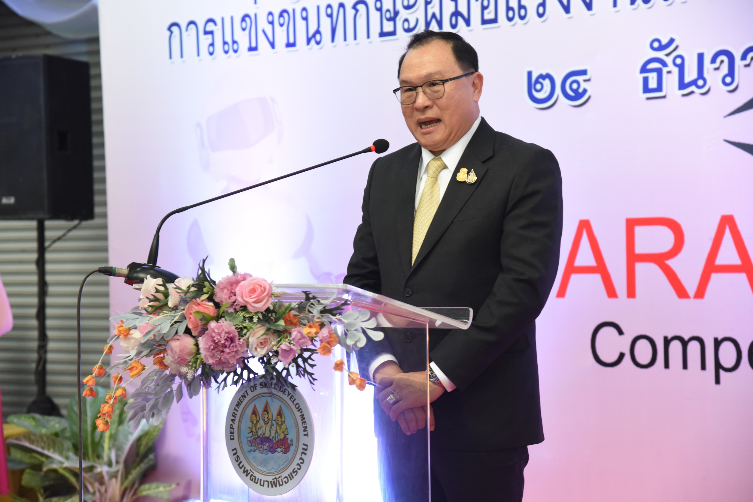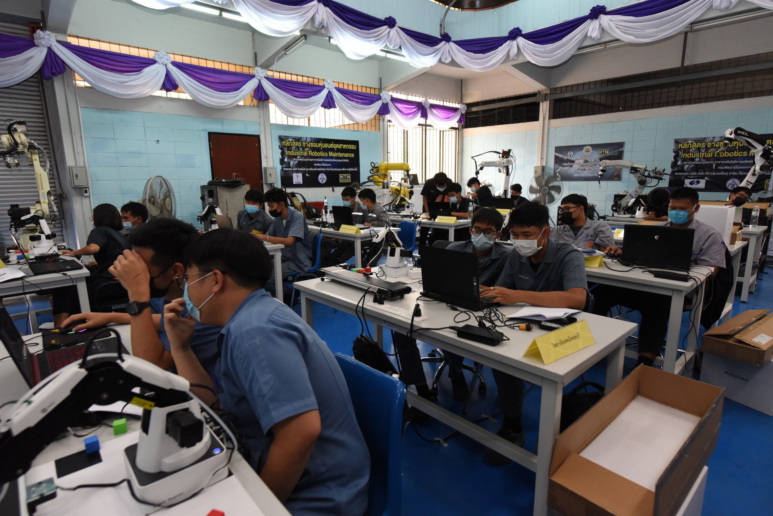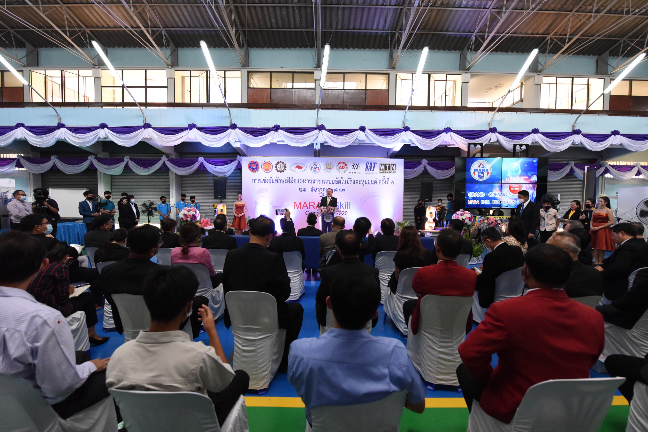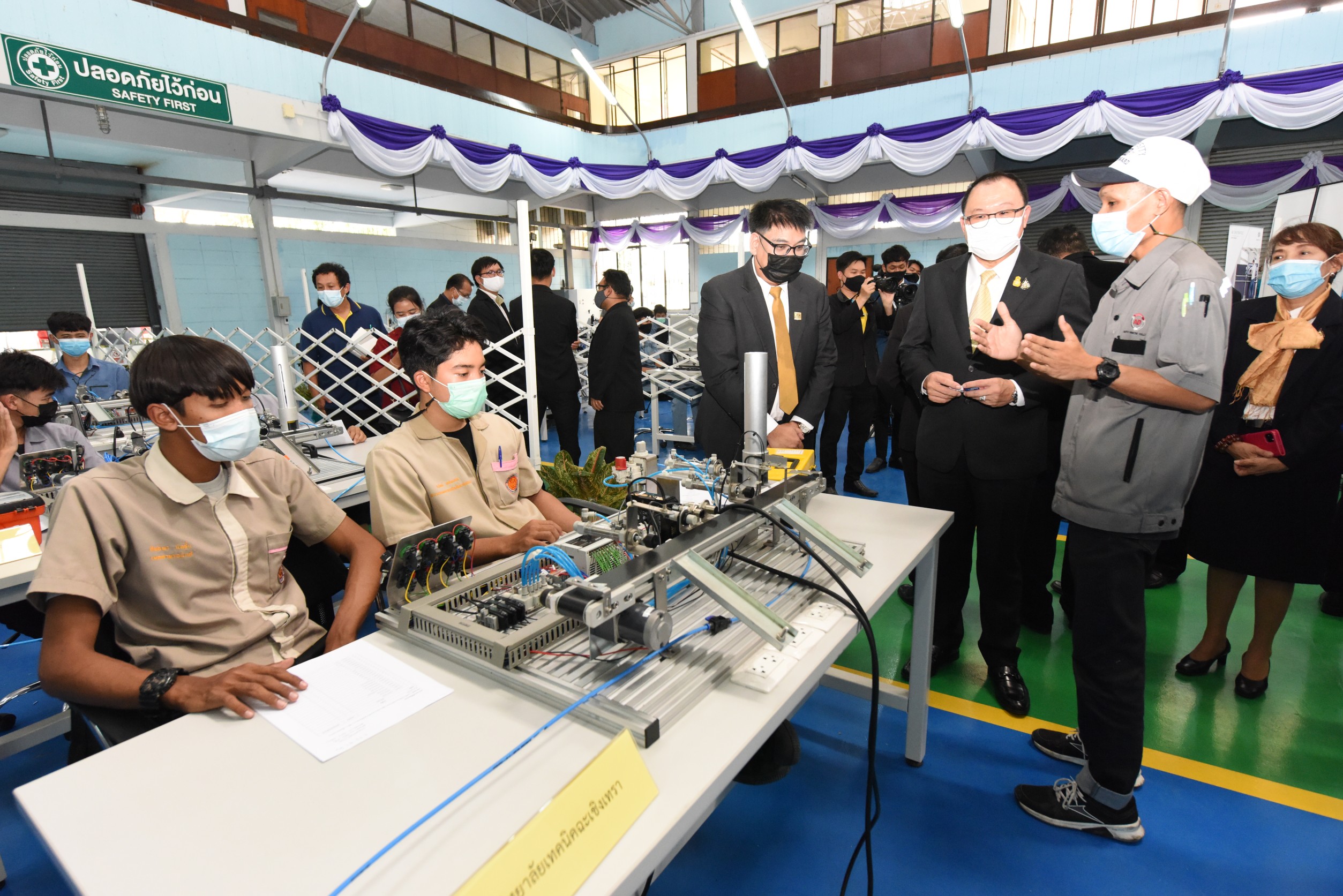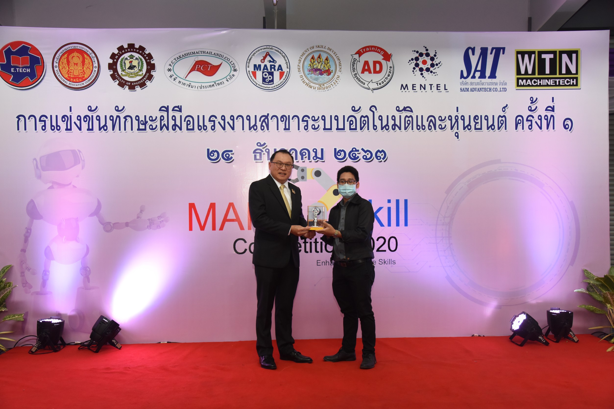 On December 24, 2020, at 14.00 hours, Labour Minister Mr. Surchart Chomklin assigned Assistant to the Labour Minister Mr. Surachai Chaitrakulthong to preside over the commencement of the first Skill Competition in Automation and Robotics to promote the development of skills at the youth level in the EEC area. The competition aims to promote cooperation between government agencies and private sectors and publicize the missions of the Manufacturing Automation and Robotics Academy (MARA). The skills competition is for youths under the age of 22 years, divided into 35 teams from 13 vocational colleges and one higher education institute. There are four competing fields consisting of mechatronics, PLC, mechanical drawing with a three-dimensional computer, and DOBOT robot. He also observed the skills competition in the four branches, observed training activities and skills assessments at the Chonburi Institute for Skill Development 3 and the Manufacturing Automation and Robotics Academy. The Department of Skill Development’s Director-General Mr. Tawat Benchatikul, also joined the occasion at the Manufacturing Automation and Robotics Academy, Muaeng, Chonburi.