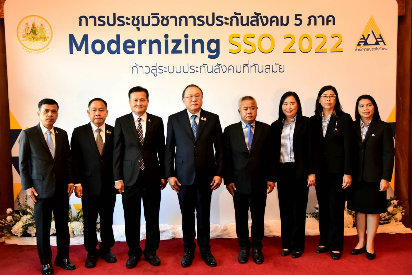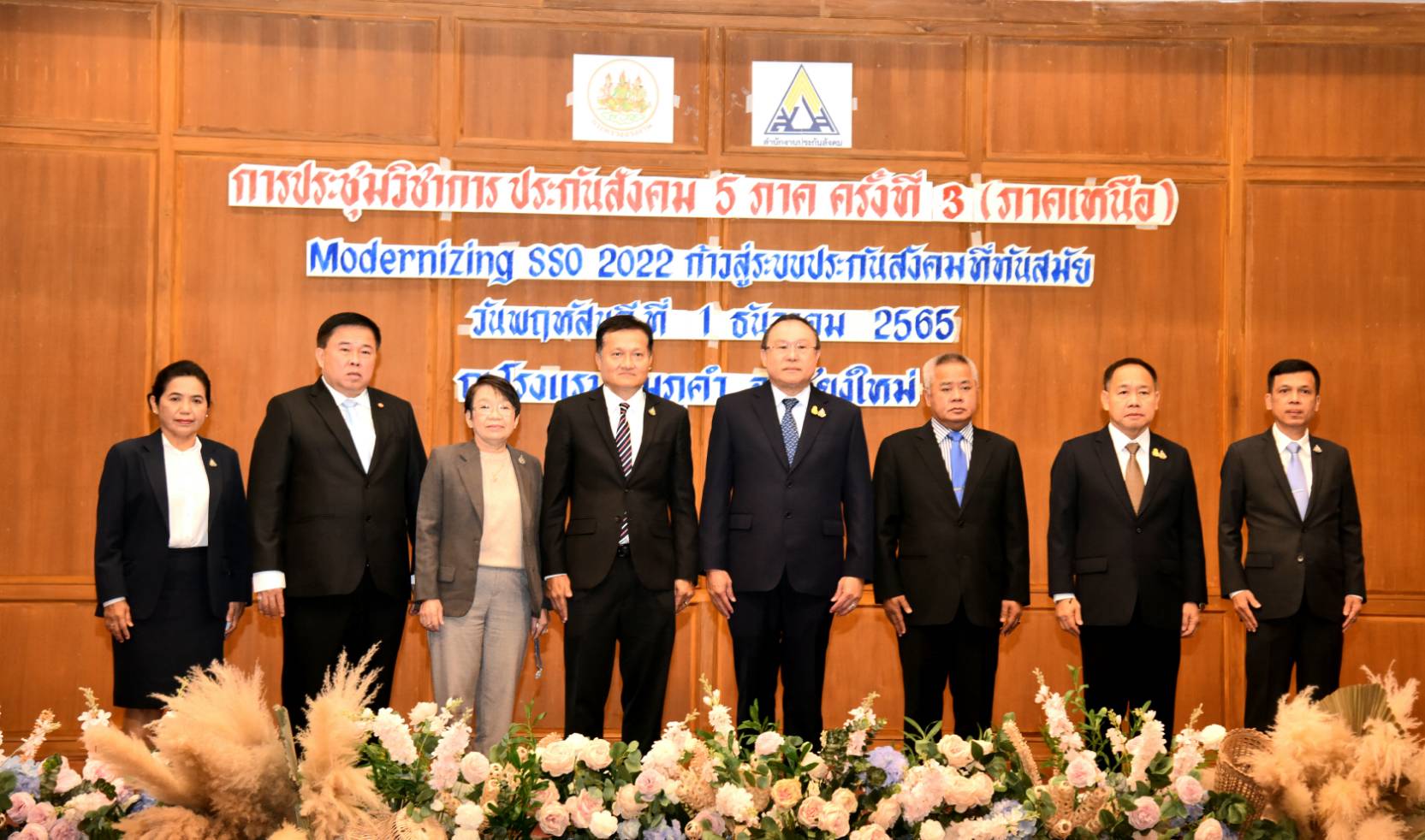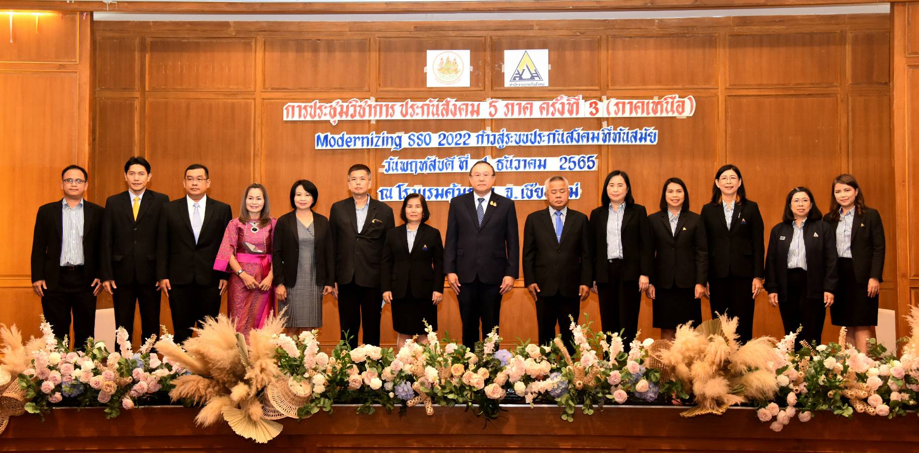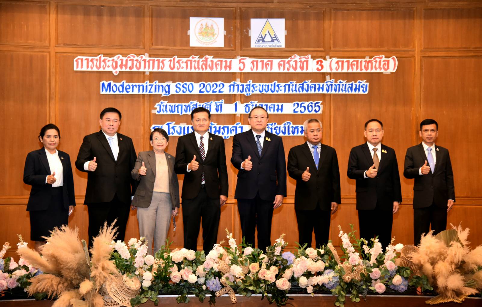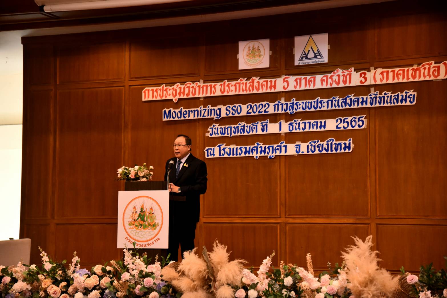 On December 1, 2022, at 09.00 hours, the Labour Minister, Mr. Suchart Chomklin, assigned Assistant to the Labour Minister, Mr. Surachai Chaitrakulthong, to chair the Social Security Academic Conference for 5 Regions 2022 (Northern Region) entitled Modernizing SSO 2022: Driving Towards A Modern Social Security System. He gave a special lecture, “Policy for development and upgrading the workforce’s lives.” The Social Security Office’s Secretary-General, Mr. Boonsong Thapchaiyut, the Ministry of Labour’s executives, and heads of government agencies under the Ministry of Labour in Chiang Mai Province gave a welcome at the Khum Phucome Hotel, Chiang Mai.