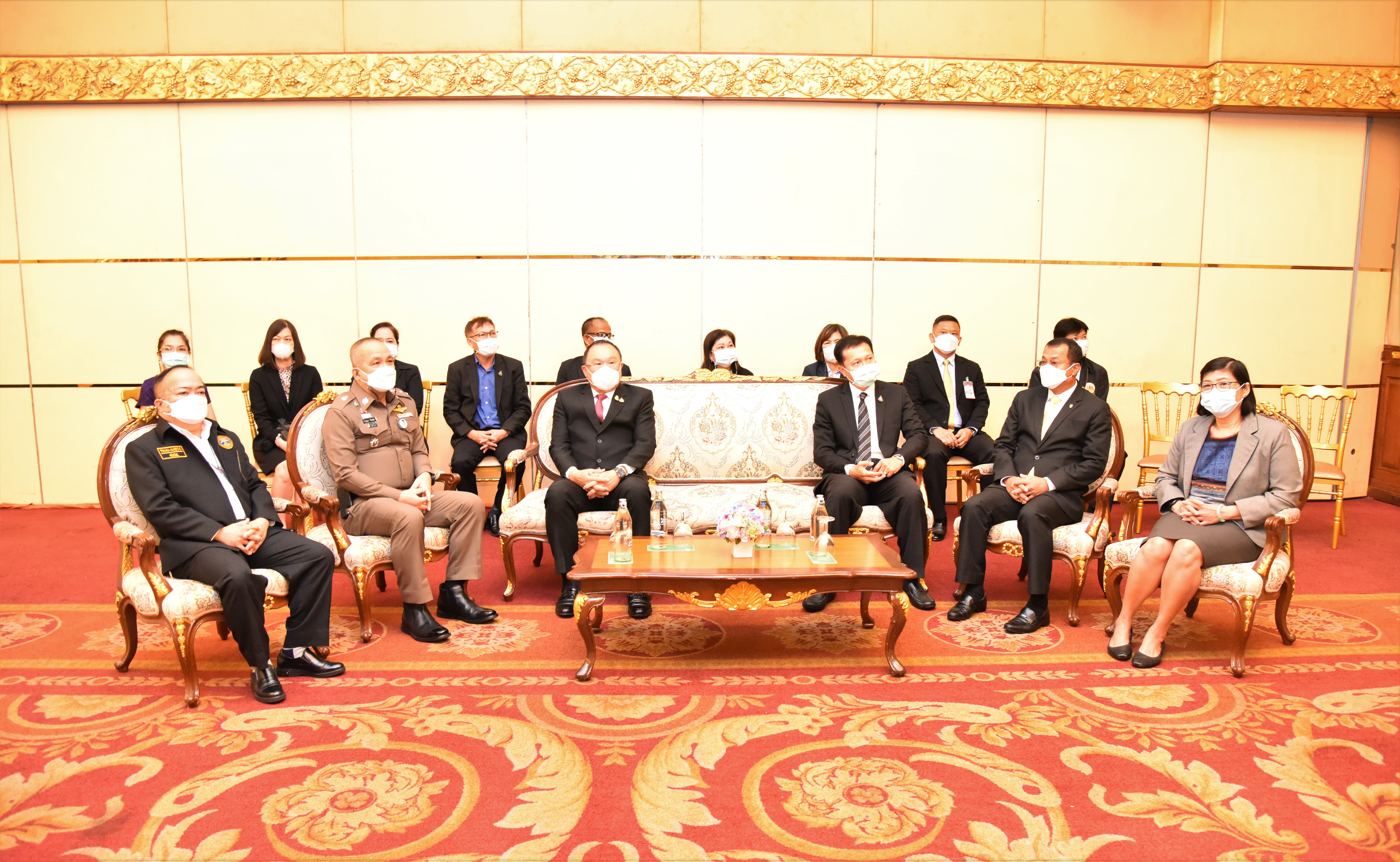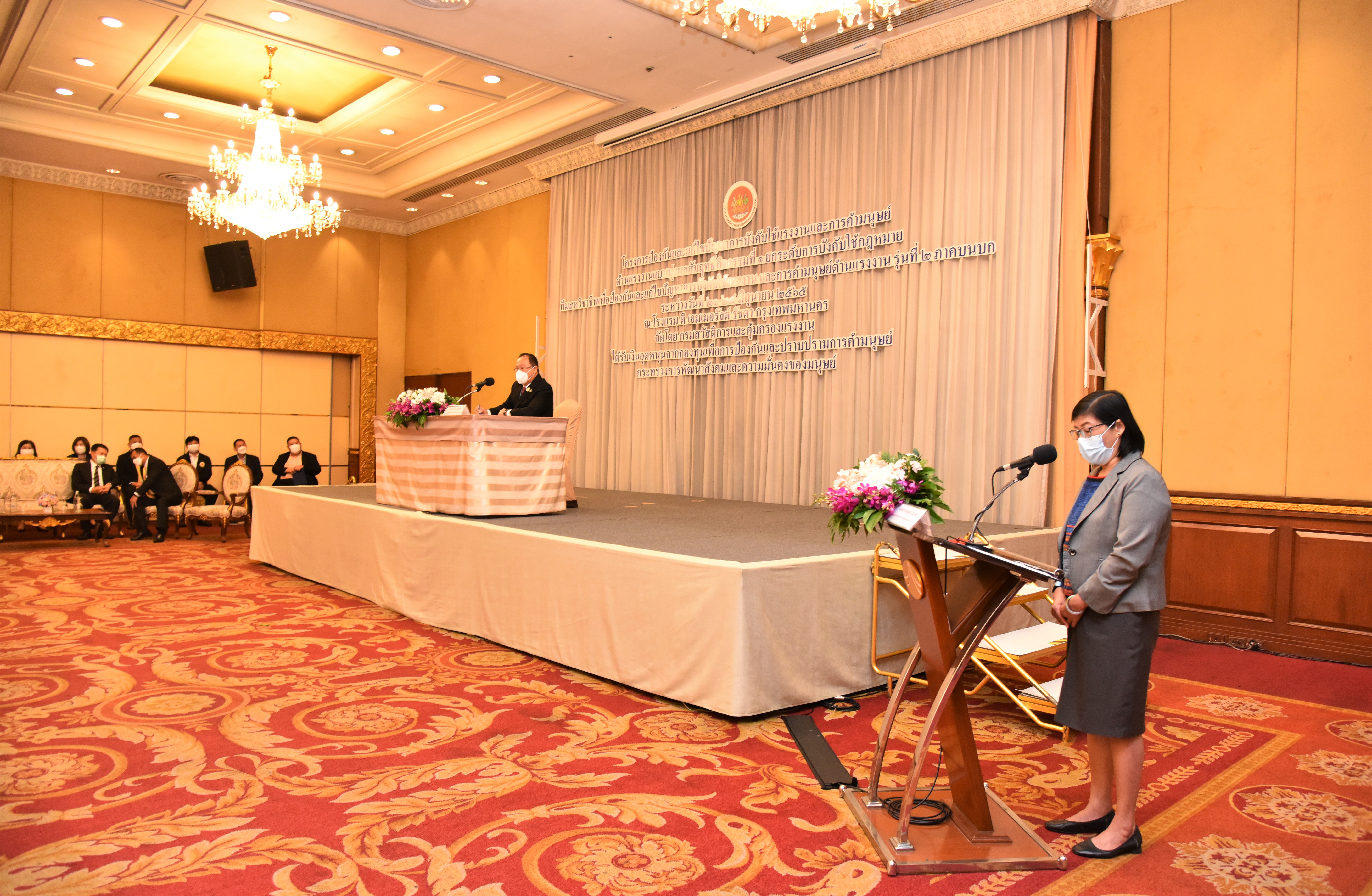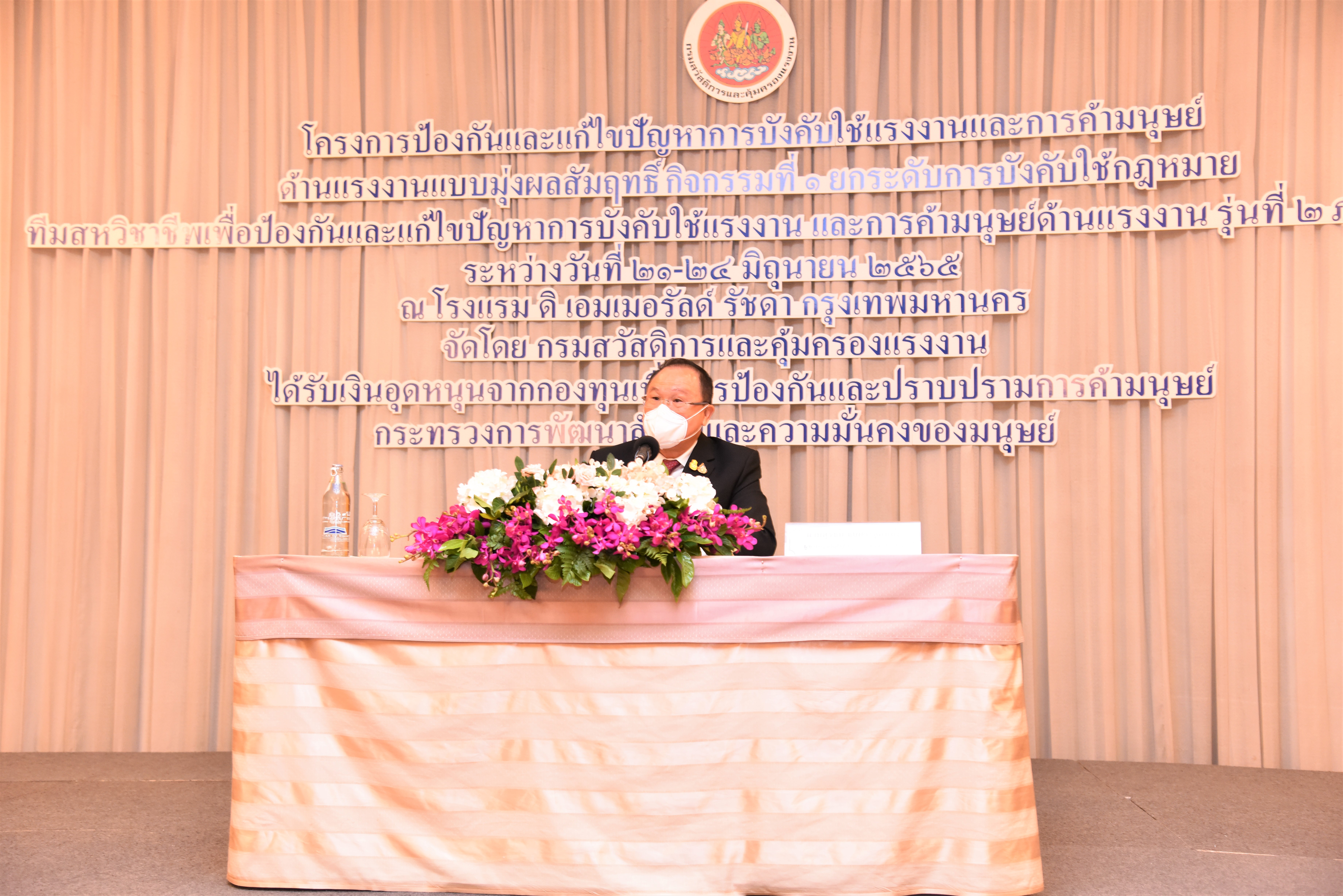 On June 23, 2022, at 09.30 hours, Labour Minister Mr. Suchart Chomklin assigned Assistant to the Labour Minister Mr. Surachai Chaitrakulthong to preside over the opening ceremony of the training project to prevent and solve the problem of forced labour and human trafficking in labour, for Class 2, onshore region. Assistant Minister from the Prime Minister’s Office performing duties for the Ministry of Labour, Mr. Suthi Sukosol, and Deputy Permanent Secretary of Labour, Mr. Wannarat Srisuksai, also joined the occasion at The Emerald Hotel, Ratchadaphisek Road, Bangkok.