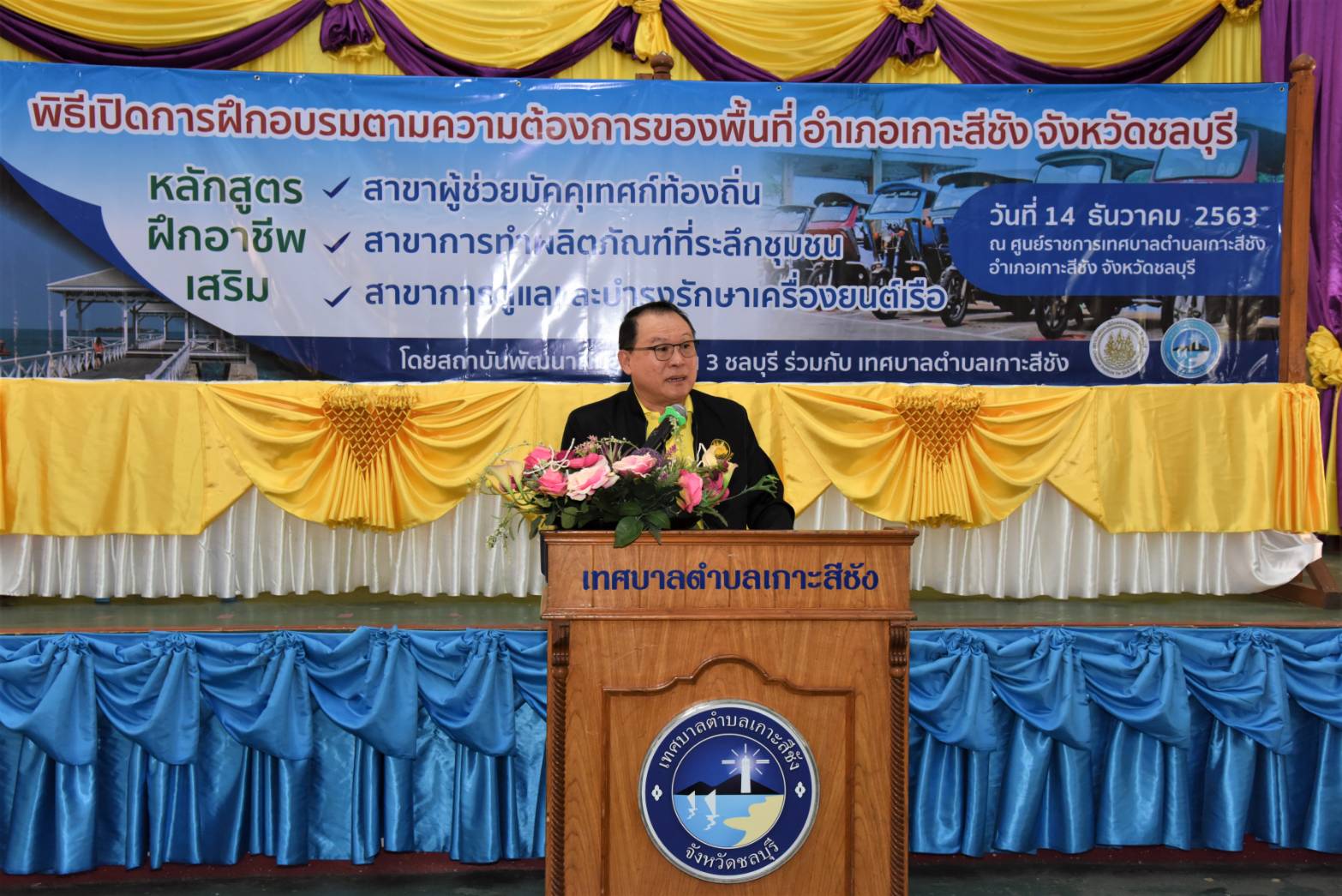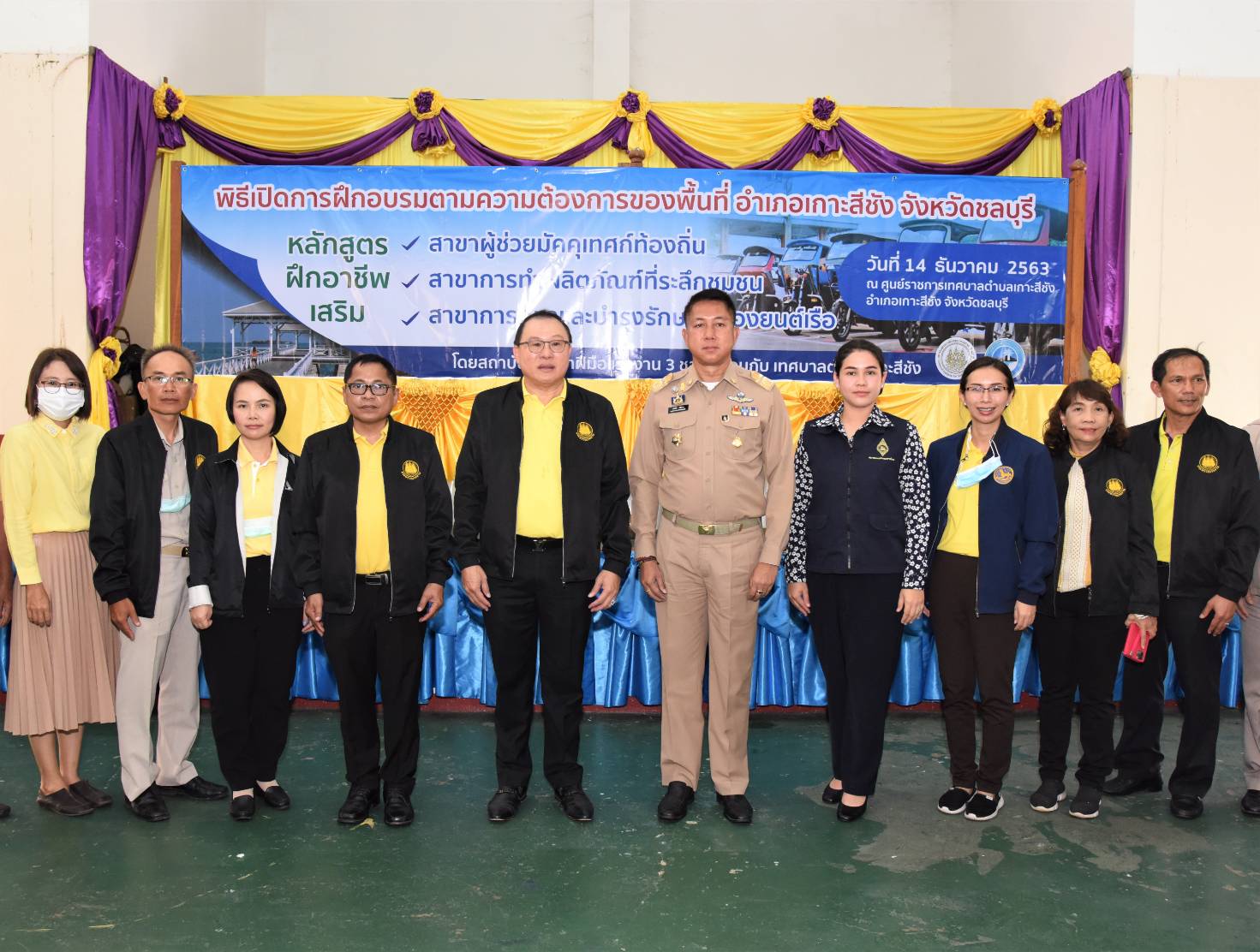 On December 14, 2020, at 10.00 hours, Labour Minister Mr. Suchart Chomklin assigned Assistant to the Labour Minister Mr. Surachai Chaitrakulthong to preside over the opening ceremony for training according to the needs of the area in Koh Sichang, Chonburi. The Chonburi Skill Development Institute 3 organized the training in collaboration with the Koh Si Chang Subdistrict Municipality to promote informal workers’ occupational development in Koh Si Chang district. The training is conducted in three branches and six batches, including three batches in local assistant guides, two batches in community souvenir product making, and one batch in boat engine maintenance. There are 20 trainees in each batch for a total of 120 trainees. Deputy Governor of Chonburi Mr. Thawatchai Srithong gave a welcoming at the multipurpose building in Koh Sichang Municipality Government Center, Koh Sichang, Chonburi.