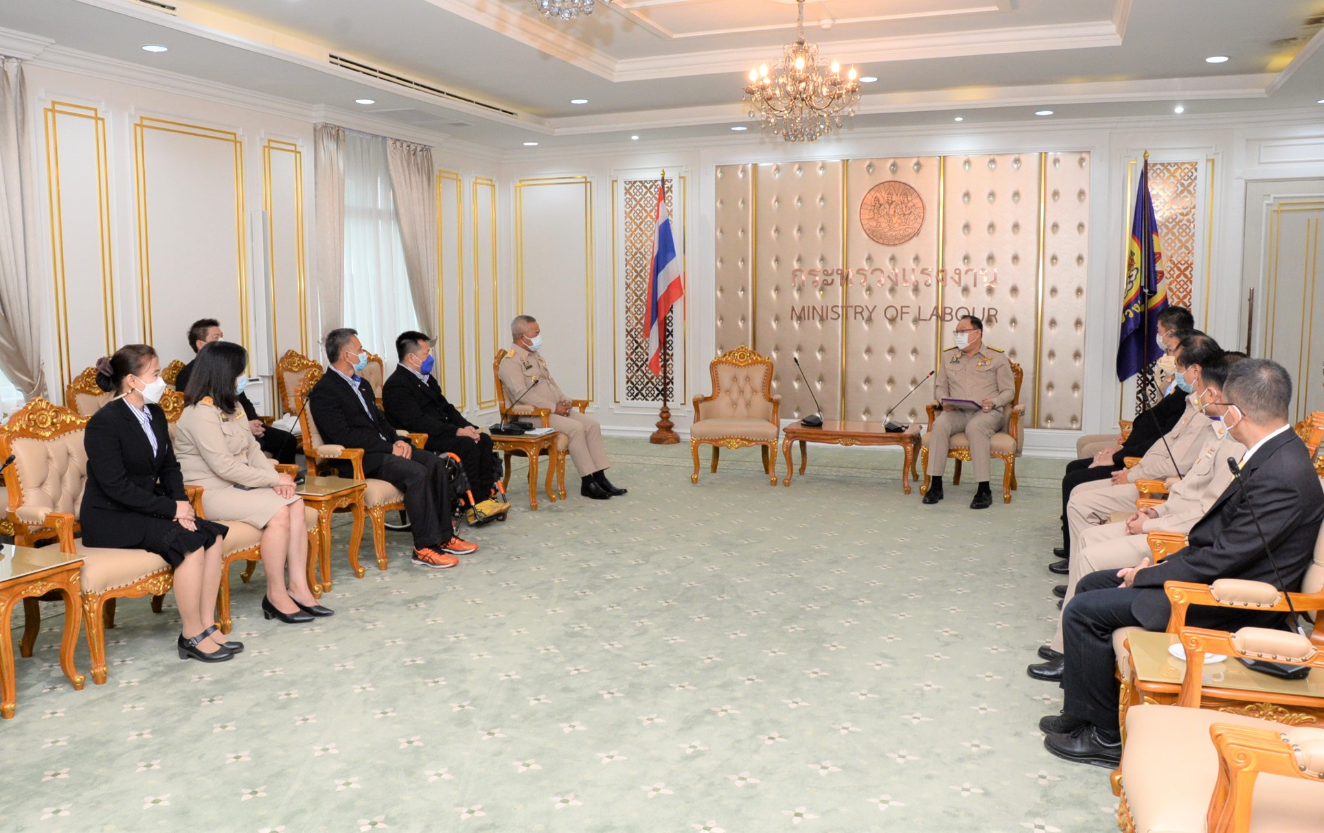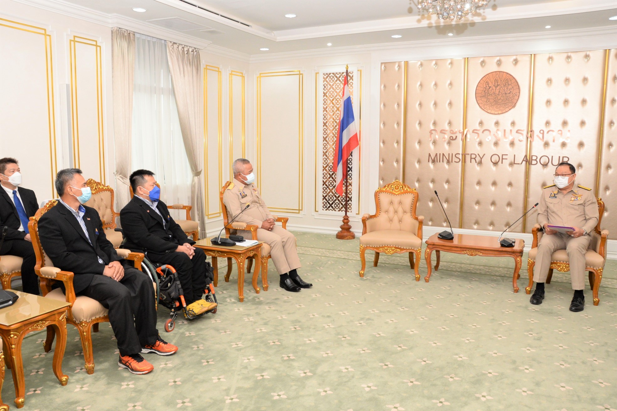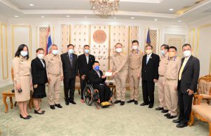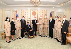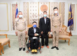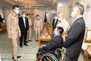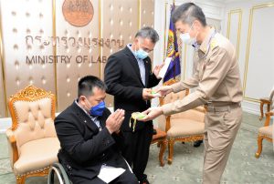 On November 1, 2021, at 09.00 hours, Labour Minister Mr. Suchart Chomklin assigned Assistant to the Labour Minister Mr. Surachai Chaitrakulthong to give a speech to the handicapped bowling athletes representing the Thai national team, who are personnel under the Ministry of Labour’s Social Security Office. The Social Security Office’s Secretary-General, Mr. Boonsong Thapchaiyut, led a group of handicapped athletes to meet them before they departed to participate in the IBF Para Bowling World Championship 2021 between November 9 to 18, 2021, in Dubai, United Arab Emirates. Permanent Secretary of Labour Mr. Boonchob Suttamanaswong and the Ministry of Labour’s executives welcomed them at the Chatumongkol Room, 6th Floor, Ministry of Labour. The two athletes with disabilities from the Thai national team first consisted of Mr. Thien Thongloy, who experienced a motorcycle accident while traveling to meet customers. The accident resulted in fractures of the spine from T3 to T8, broken collarbones, three fractures of the shoulder blades, and fractures of 3 ribs, which pierced the lungs, requiring treatment for seven months. The injuries prevented him from walking for the rest of his life, and he must use a wheelchair for mobility. Later, he was rehabilitated at the Pathum Thani Provincial Workers Rehabilitation Center, Region 1, and was selected to work as a Social Security Academician at the Pathum Thani Provincial Workers Rehabilitation Center, Region 1. He serves as Business Computer Course Professional Trainer. Mr. Thien has worked there since 2003, totaling 18 years. While working, he was allowed to compete as a disabled athlete and participate in many international competitions, such as the 7th Asian Para Games in 2014, in Naypyidaw, Myanmar. He won 1 silver medal from the men’s COMPOUND archery competition. He also participated in the Thailand Word Para Wowling Championship 2019, which Thailand hosted that year. He received a bronze medal from the doubles category. The second member was Mr. Somsak Ruamsap, who had an accident from working on a forklift, and was backed up against the wall. The accident resulted in his left leg aorta being torn and his spine broken. He was admitted for two years and decided to undergo amputation above the knee. He received rehabilitation in 1999 and was considered to work as an employee of the third place at the Worker Rehabilitation Center, Region 1. He has been working there since 2005, totaling 16 years. Later, he was given opportunities to become an athlete with disabilities, participating in many international competitions.