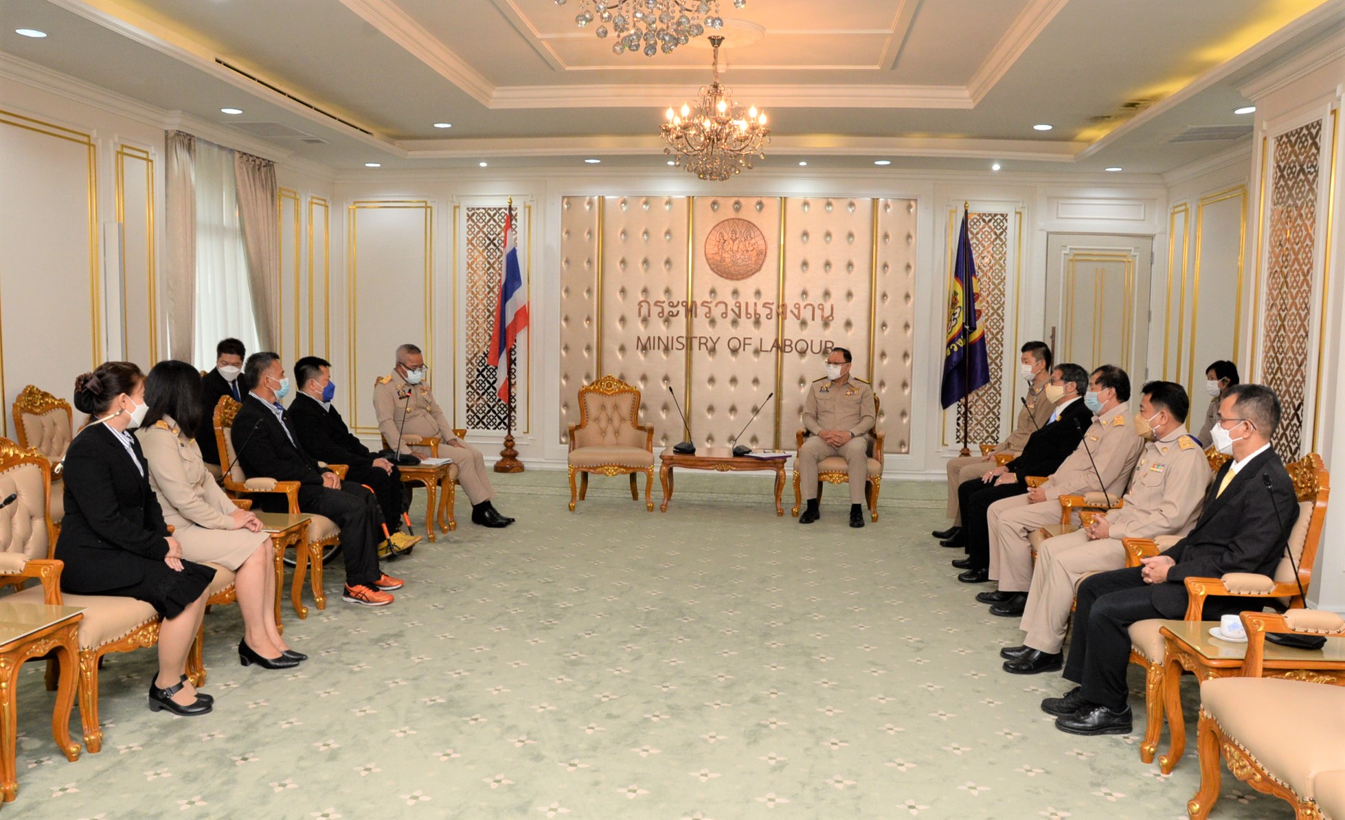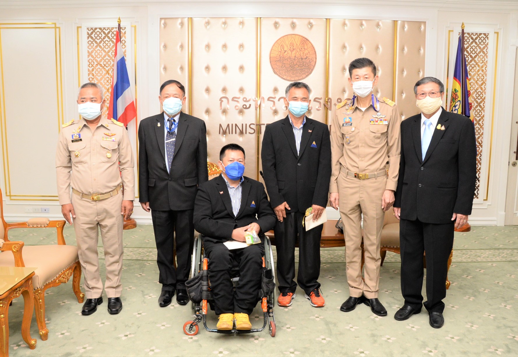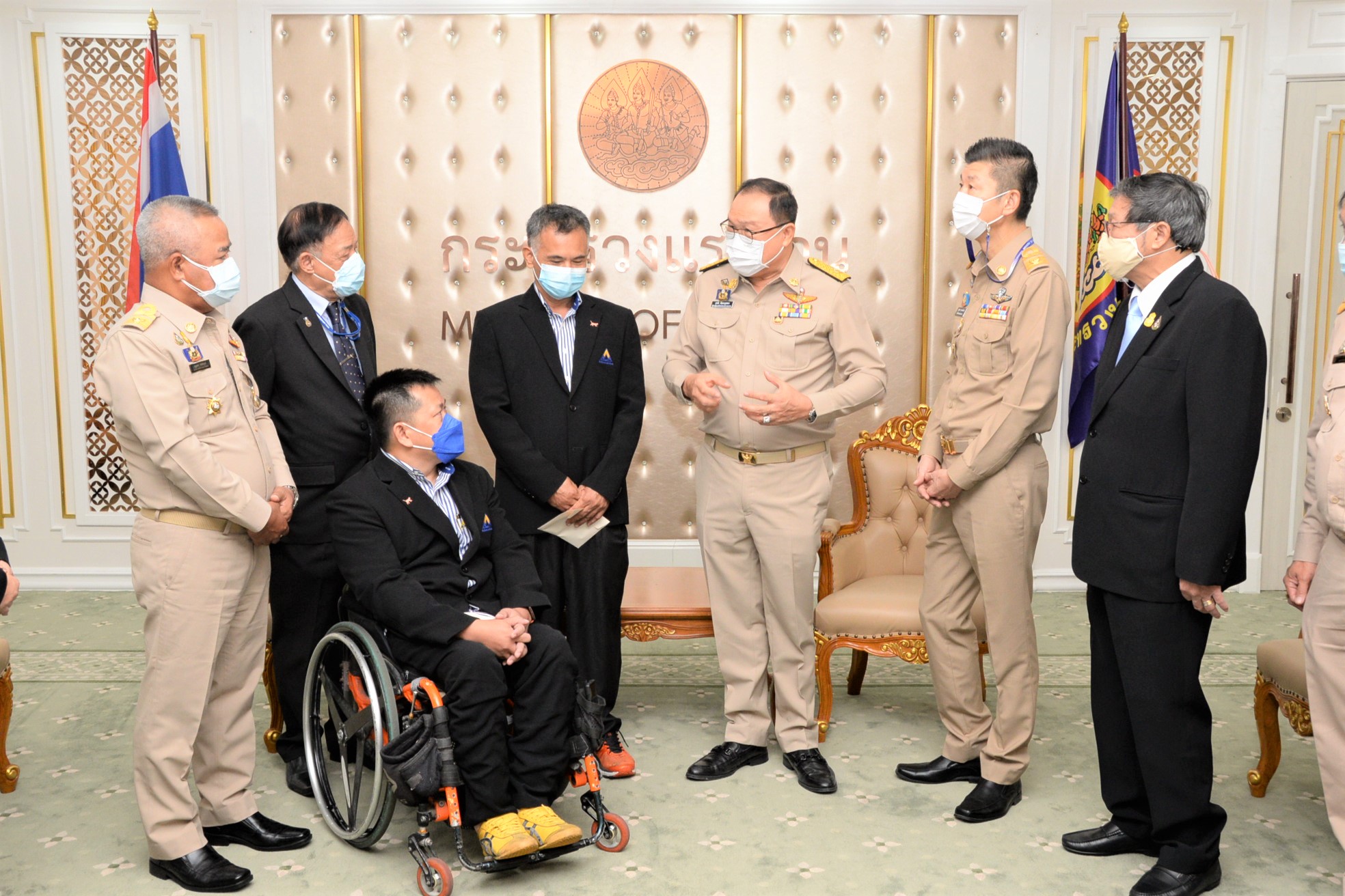 On November 1, 2021, at 09.00 hours, Labour Minister Mr. Suchart Chomklin assigned Assistant to the Labour Minister Mr. Surachai Chaitrakulthong to give a speech to the handicapped bowling athletes representing the Thai national team, who are personnel under the Ministry of Labour’s Social Security Office. The Social Security Office’s Secretary-General, Mr. Boonsong Thapchaiyut, led a group of handicapped athletes to meet them before they departed to participate in the IBF Para Bowling World Championship 2021 between November 9 to 18, 2021, in Dubai, United Arab Emirates. Permanent Secretary of Labour Mr. Boonchob Suttamanaswong and the Ministry of Labour’s executives welcomed them at the Chatumongkol Room, 6th Floor, Ministry of Labour. The two athletes with disabilities from the Thai national team first consisted of Mr. Thien Thongloy, who experienced a motorcycle accident while traveling to meet customers. The accident resulted in fractures of the spine from T3 to T8, broken collarbones, three fractures of the shoulder blades, and fractures of 3 ribs, which pierced the lungs, requiring treatment for seven months. The injuries prevented him from walking for the rest of his life, and he must use a wheelchair for mobility. Later, he was rehabilitated at the Pathum Thani Provincial Workers Rehabilitation Center, Region 1, and was selected to work as a Social Security Academician at the Pathum Thani Provincial Workers Rehabilitation Center, Region 1. He serves as Business Computer Course Professional Trainer. Mr. Thien has worked there since 2003, totaling 18 years. While working, he was allowed to compete as a disabled athlete and participate in many international competitions, such as the 7th Asian Para Games in 2014, in Naypyidaw, Myanmar. He won 1 silver medal from the men’s COMPOUND archery competition. He also participated in the Thailand Word Para Wowling Championship 2019, which Thailand hosted that year. He received a bronze medal from the doubles category. The second member was Mr. Somsak Ruamsap, who had an accident from working on a forklift, and was backed up against the wall. The accident resulted in his left leg aorta being torn and his spine broken. He was admitted for two years and decided to undergo amputation above the knee. He received rehabilitation in 1999 and was considered to work as an employee of the third place at the Worker Rehabilitation Center, Region 1. He has been working there since 2005, totaling 16 years. Later, he was given opportunities to become an athlete with disabilities, participating in many international competitions.