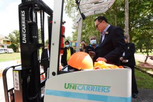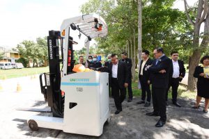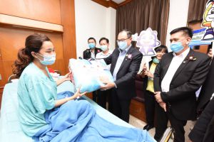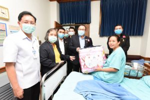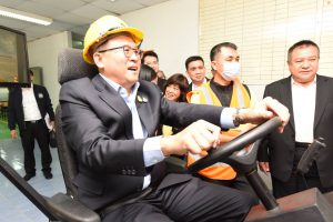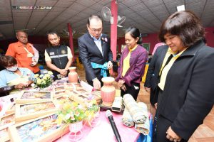 Mr. Surachai also observed a demonstration of driving a forklift with a simulator training device at a national labour skill standard assessment facility, in-home and small commercial air conditioning mechanics at the level 1 and 2 capacity. They also observed a training to prepare for the national skill standard assessment, in the manual arc welding branch, Tig welding, and max welding branch, at the National Skill Development Office. The visiting committee further observed activities carried out by occupational groups and elderly workers at the Quality of Life Development Center and the Elderly Career Promotion Center in Watthana Nakhon Sub-district Administrative Organization, Watthana Nakhon, Sa Kaeo. The activities including making garlands and products from loincloths and other products to connect with the OTOP market of Sa Kaeo. At present, the school for the elderly in the Watthana Nakhon Sub-district Administrative Organization has had an intake of two batches. The first batch comprised 70 people, and the second batch had 30. The Assistant to the Labour Minister also paid a visit and gave gifts to 10 insured person patients at the Sa Kaeo Crown Prince Hospital.