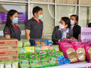 On October 27, 2022, at 10.00 hours, the Labour Minister, Mr. Suchart Chomklin, assigned the Ministry of Labour’s Spokesperson (on Politics), Mrs. Thienrat Navamawat, to represent the Ministry of Labour to receive consumer goods from Sun Siam Co., Ltd., comprising drinking water, rice, instant noodles, milk, and snacks. The occasion took place at the Ministry of Labour’s foyer. The donation was made for the Ministry of Labour to pack into relief packages to distribute to flood victims in various areas to offer initial alleviation of the suffering of workers and community members who have been affected by the flood.