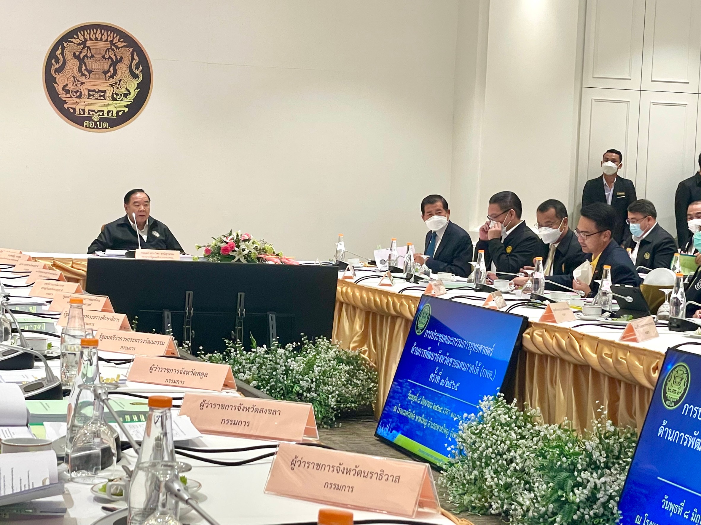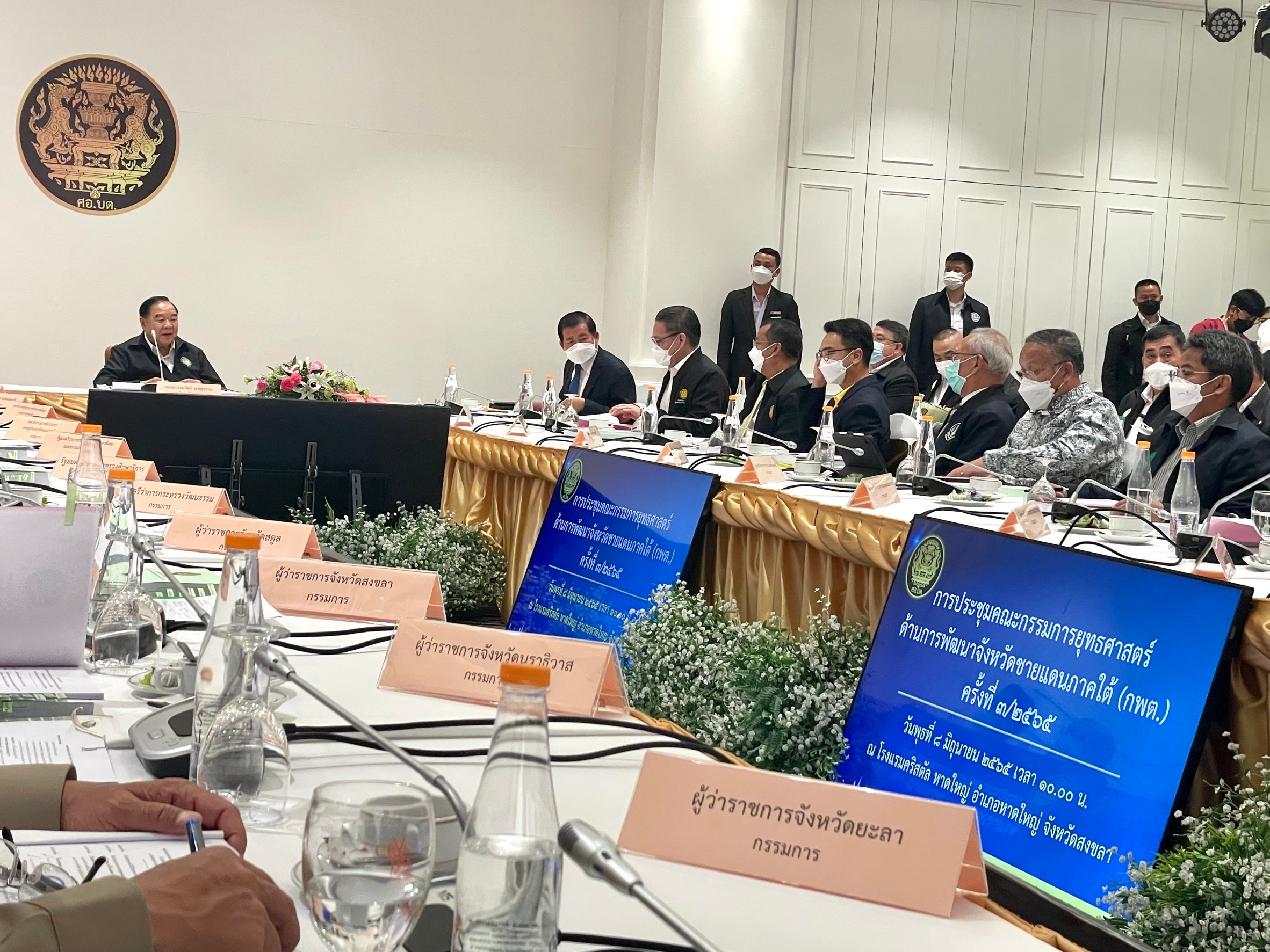 Before the meeting, Mr. Wannarat joined General Prawit’s delegation in observing the exhibition on promoting the economy in the area, an exhibition on resolving poverty, inequality, and people development of all ages, and an exhibition promoting good people following religious principles to preserve and maintain a good multicultural society in the southern border provinces. The meeting acknowledged the results of the drive for the Betong Airport, which has been in operation since April 29, 2022, the Southern Border Provinces Security Index report, the report on the results of the project to enhance the development of the model town of Betong, Yala Province, and the report on the progress of the Sustainable, Prosperous and Sustainable Subdistrict project to eliminate poverty and develop people of all ages sustainably in the southern border provinces, following the sufficiency economy philosophy, under the one civil servant, one low-income household system. It also considered the report on the progress of fishing boats out of the system for sustainable marine fisheries resource management in the southern border provinces as an urgent agenda and the results of the activities of the National Reading Expo. The meeting approved the 6-year framework for economic recovery and tourism in Hat Yai – Songkhla (2022-2027), the southern border cattleman activities, and the project to upgrade the development of southern border provinces into a Smart City.