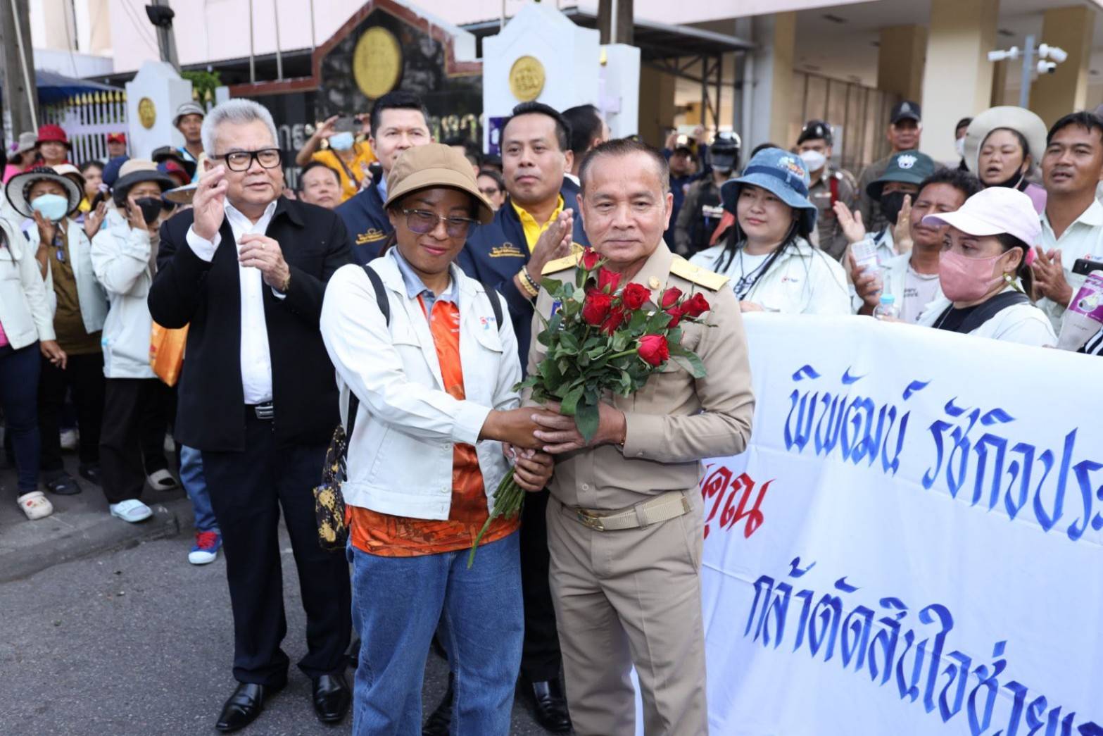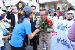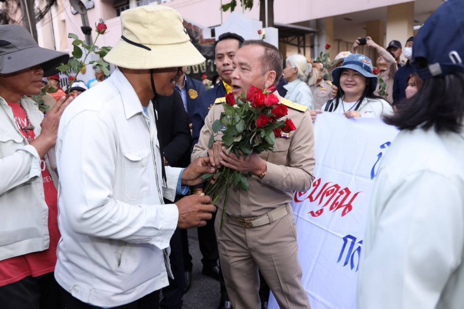 On February 17, 2025, at 16.30 hours, Mr. Phiphat Ratchakitprakarn, Minister of Labour, assigned Mr. Aree Krainara, the Secretariat to the Labour Minister, Mr. Krirkkrai Nasomyont, the Department of Labour Protection and Welfare’s Inspector-General and Acting Legal Advisor, and the executives of the Ministry of Labour as representatives to receive flowers expressing gratitude from employees of Yarnapund Public Company Limited, and former employees of Body Fashion Co., Ltd., A.M.C. Spinning, and Alpha Spinning who came together to present flowers to the Minister of Labour. The employees expressed their gratitude for the Labour Minister’s support to employees who were laid off without receiving compensation. They also encouraged the Labour Minister to support the workforce while also following up on the outcomes of the support. The occasion took place on the ground floor, Gate 3, Ministry of Labour.