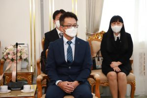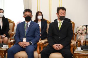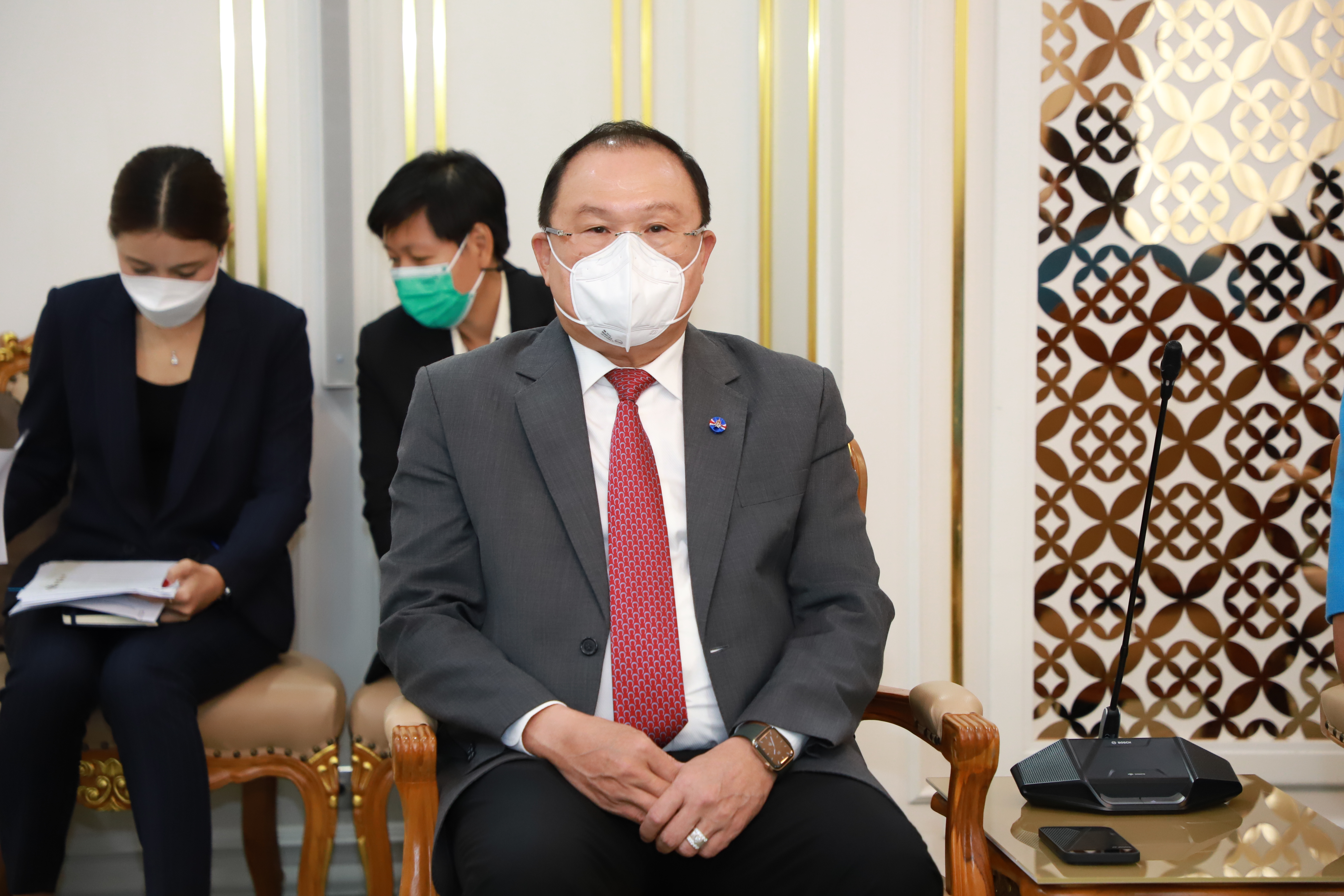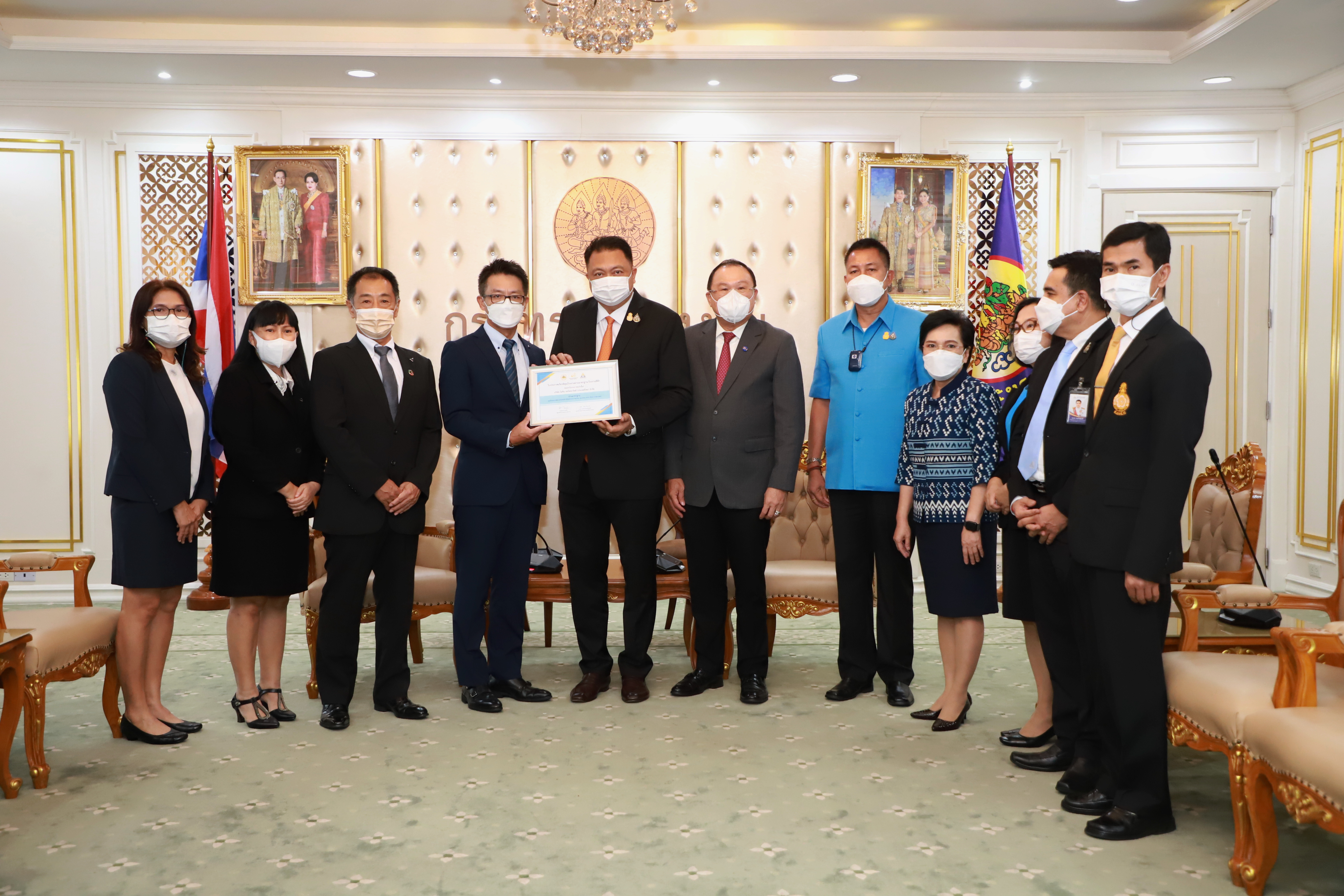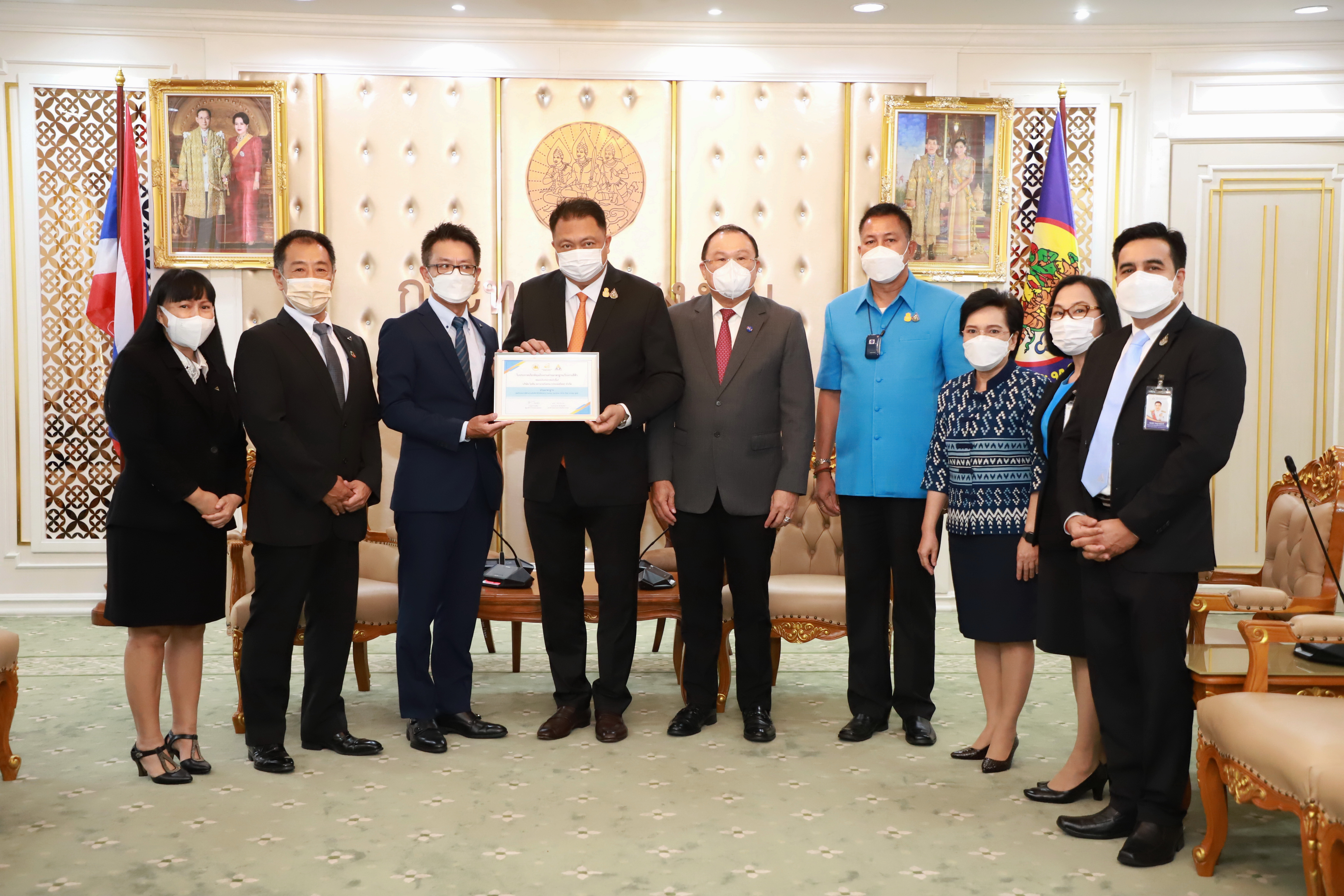 On May 20, 2022, the Labour Minister Mr. Suchart Chomklin welcomed Mr. Noriyuki Kitasato, President of Aishin Asia Pacific Co., Ltd., and his team, on meeting the Labour Minister to receive a certificate for the blue factory establishment through the the “Factory Sandbox Project.” The certificate was awarded to Aishin Corporation, a subsidiary of automobile manufacturers. At present, there are ten affiliated companies and 14 affiliated companies in Thailand, with 13,129 employees. On this occasion, the Labour Minister also received 2,000 bags of rice weighing 5kg each from the company’s representatives. The donation is to help those affected by the COVID-19 pandemic and alleviate suffering. This is beneficial to the workforce, an important part of driving Thailand’s business and economy. Assistant to the Labour Minister Mr. Surachai Chaitrakulthong, the Labour Minister’s Advisor, Mrs. Thiwalrat Angkinan, Secretariat to the Labour Minister, Mr. Suthep Chitvong, Assistant Ministers from the Prime Minister’s Office performing duties for the Ministry of Labour, Mr. Suthi Sukosol, the Ministry of Labour’s Spokesperson (on politics), and Mrs. Thienrat Navamawat, joined the meeting at the Chatumongkol meeting room, 6th floor, Ministry of Labour.