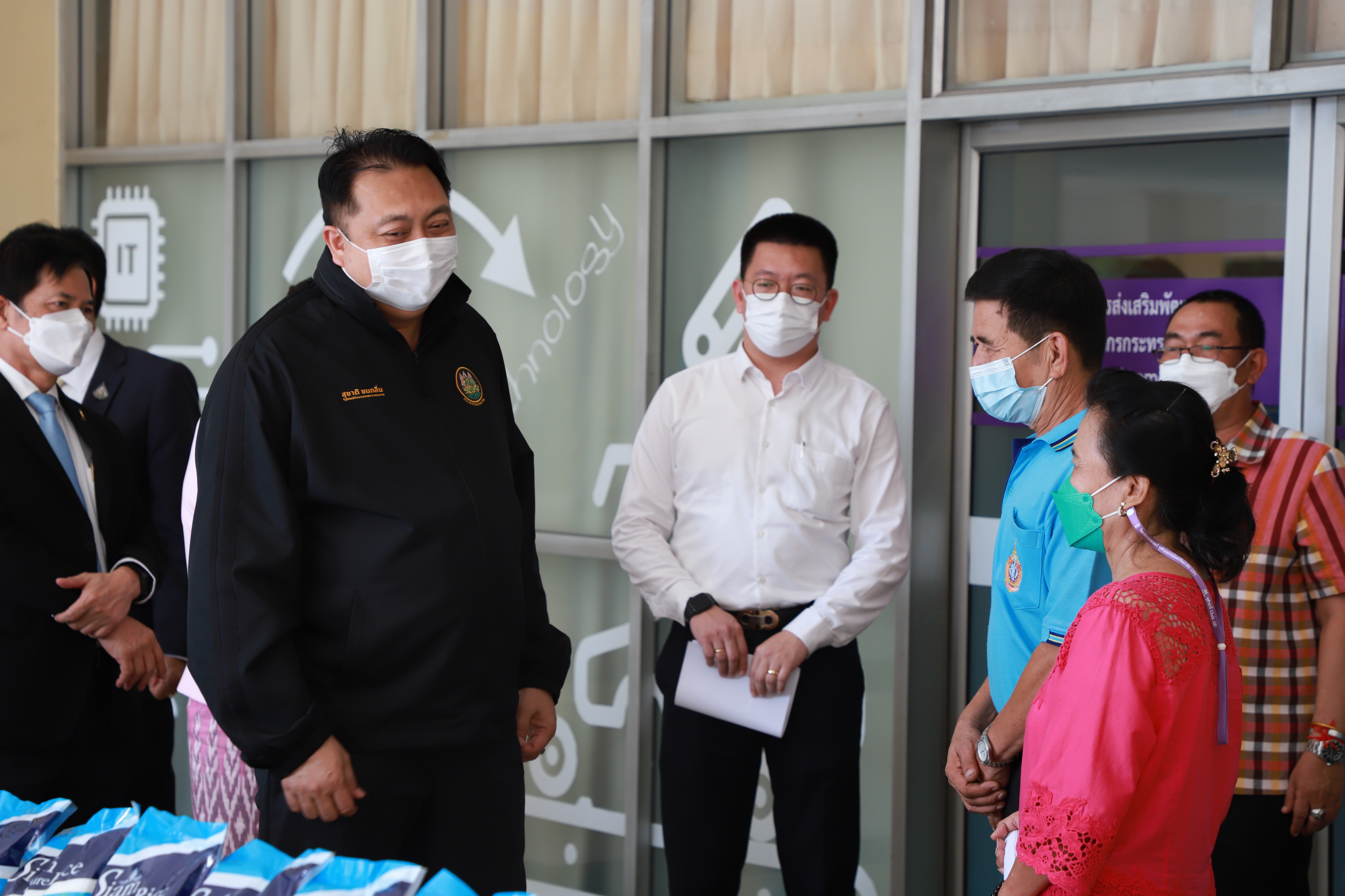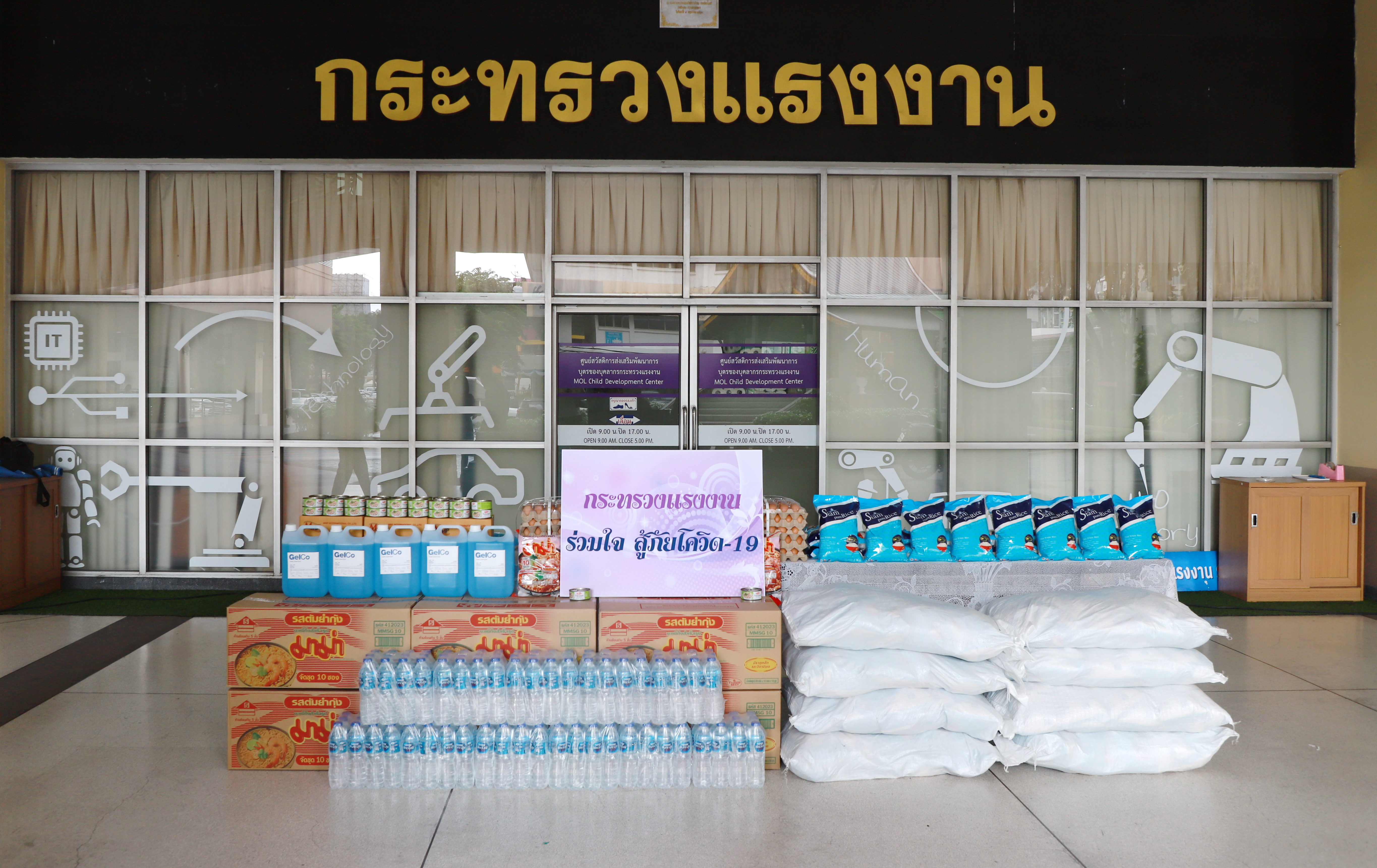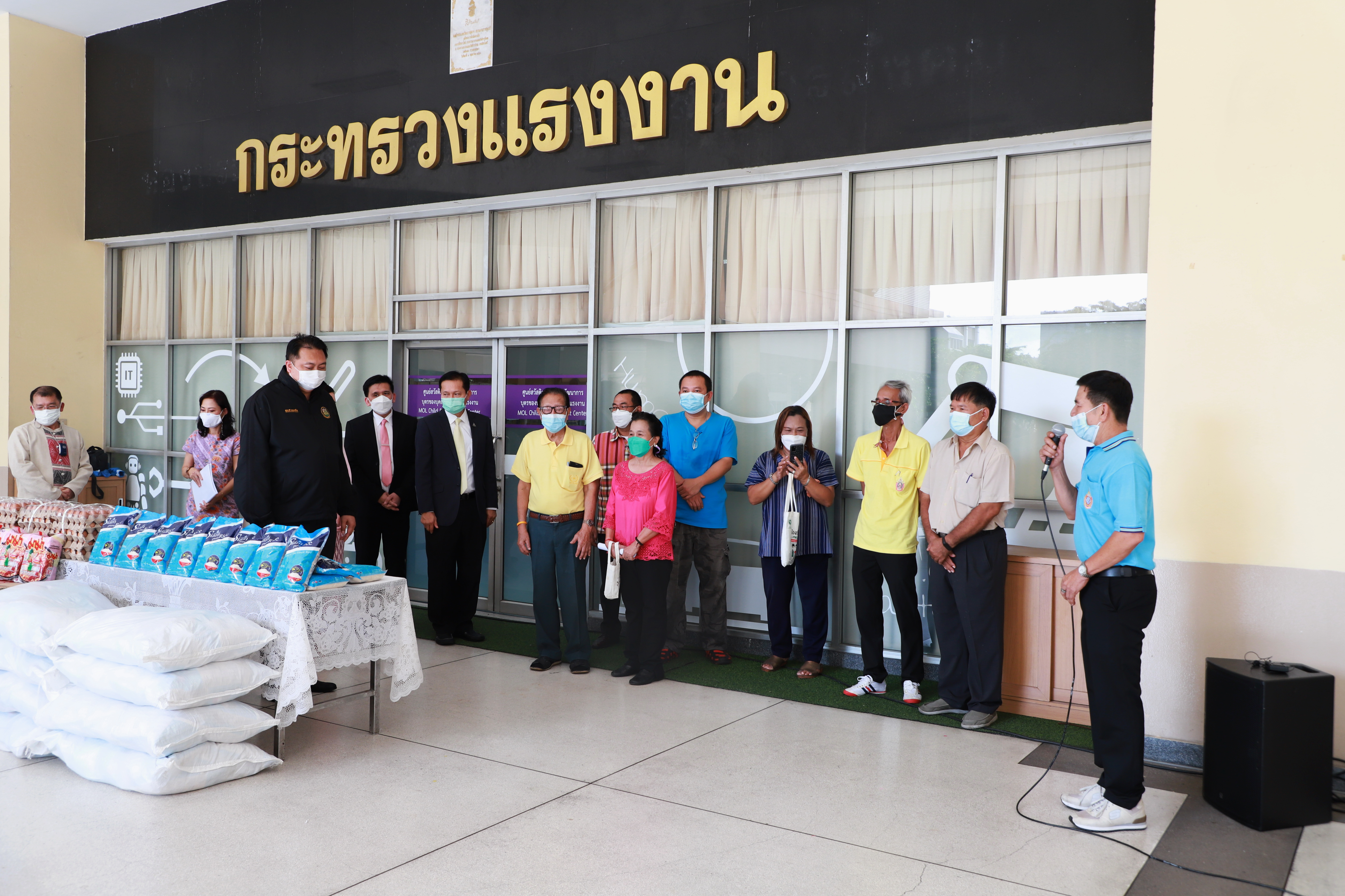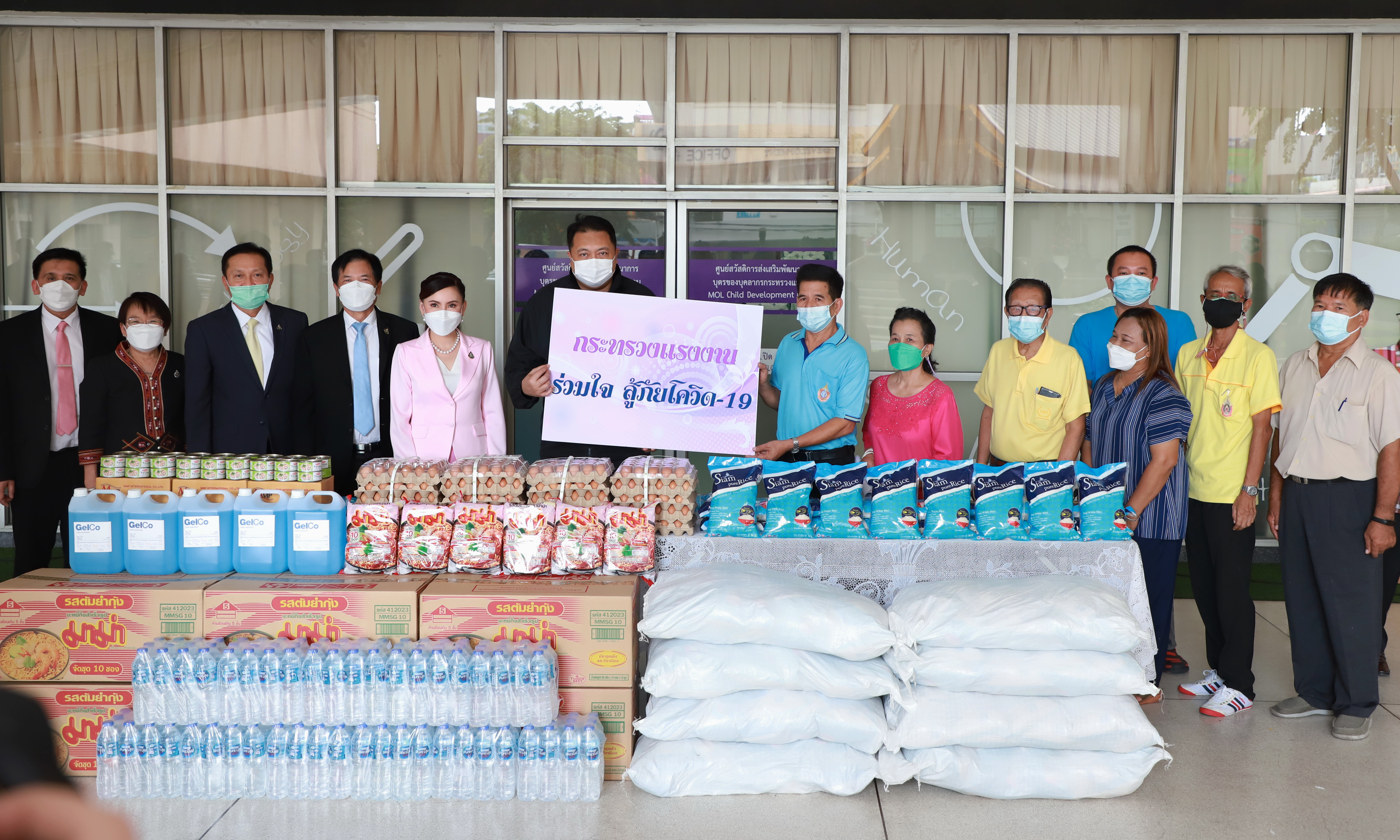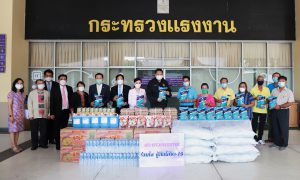 On August 17, 2021, Labour Minister Mr. Suchart Chomklin, the Ministry of Labour’s Advisor, Mrs. Thiwalrat Angkinan, the Labour Minister’s Secretariat Mr. Suthep Chitayawong, the Ministry of Labour’s Spokesperson (on politics) Mrs. Theanrat Nawamawat, Permanent Secretary of Labour Mr. Suthi Sukosol and the Ministry of Labour’s executives donated consumer goods that the private sector supported the Ministry of Labour with, to help people who have suffered from the impact of COVID-19 in the Din Daeng community. The donations included 1,000 bags of rice weighing 2 kilograms each, 10,000 bags of instant noodle, 5,000 cans of tuna, 10,000 chicken eggs, 2,400 bottles of drinking water, and 20 gallons of 5 liters alcohol gel bottles. Mr. Wichan Kheewkaew, Chairman of the Din Daeng Housing Community 2, and the flat committee represented the Din Daeng Housing Community 2 as recipients. The goods will be distributed to families who have suffered from the impact of COVID-19. The occasion took place at the foyer on the first floor, Ministry of Labour.