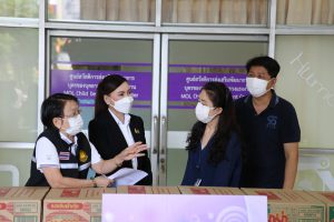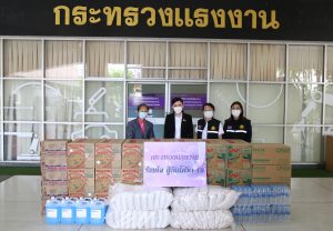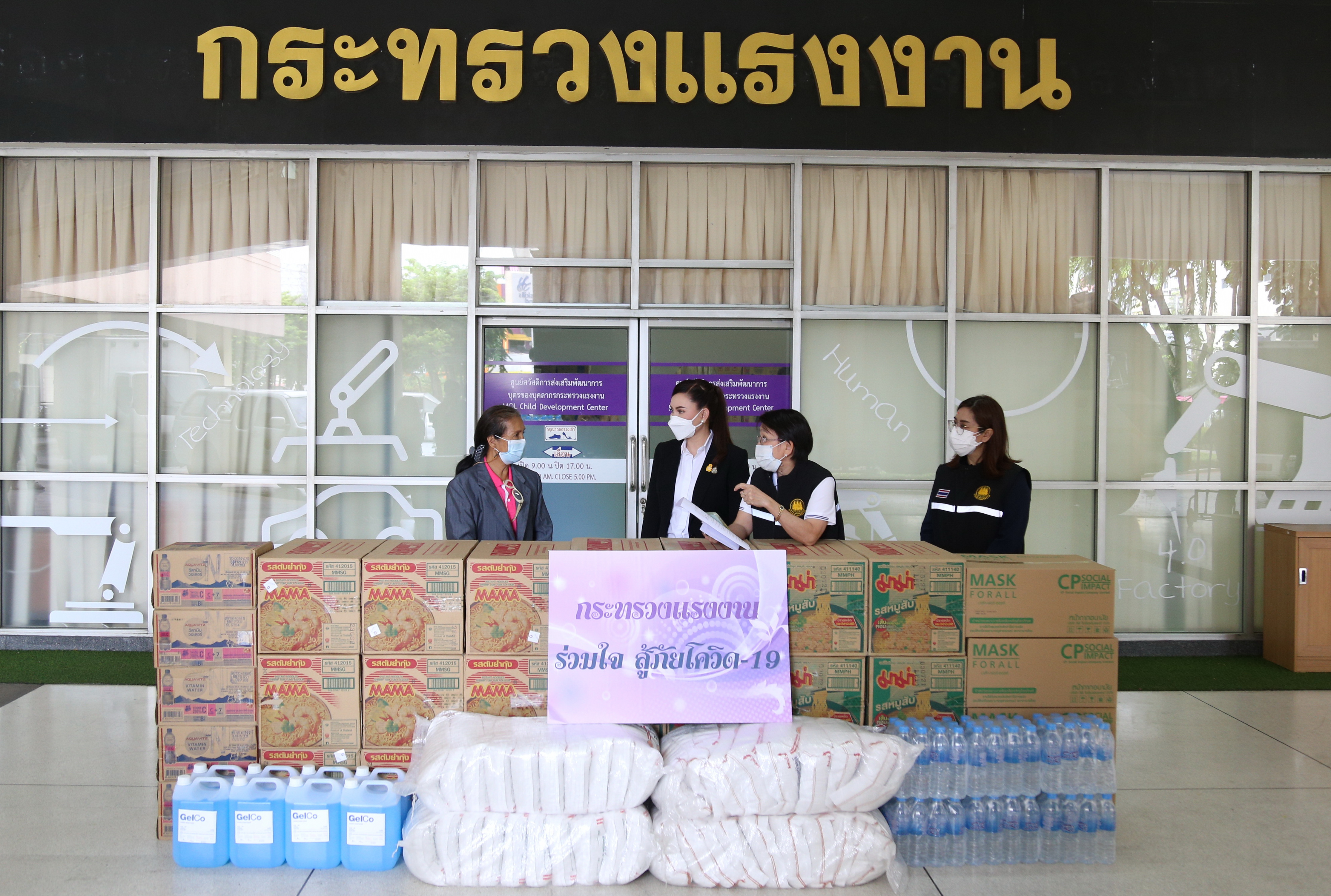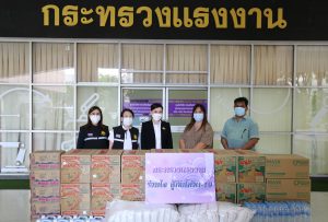 On July 27, 2021, Labour Minister Mr. Suchart Chomklin assigned the Ministry of Labour’s Advisor, Mrs. Thiwalrat Angkinan, the Ministry of Labour’s Spokesperson (on politics), Mrs. Theanrat Nawamawat, and the Ministry of Labour’s Inspector-General, Ms. Bubpha Rueangsud, to donate consumer goods which the Ministry of Labour received from the private sector, to support people suffering from the impact of COVID-19. The occasion took place at the foyer, 1st floor, Ministry of Labour. The goods were given to three charitable organizations. The first was the “Fueng Fah Center,” which received 5,000 packs of instant noodles, 1,000 bottles of drinking water, 5,000 hygiene masks, 100 bags of rice, 10 gallons of alcohol gel, and 1,000 bottles of vitamin water. The second organization was “Team Help,” and the third was Khun Saowaluk Bangkoknoi, from Krua Klang Trok Kao Mai, with 2,500 packs of instant noodles, 500 bottles of drinking water, 2,000 hygiene masks, 60 bags of rice, 5 gallons of alcohol gel, and 500 bottles of vitamin water. The Ministry of Labour has brought consumer goods donated from the private sector and kind people to give to the employees in the worker camps. It is a supplementary measure and the Ministry of Labour’s request for employers to provide workers with three meals, whereas the Ministry of Labour will support consumer goods. The measures are aimed to support workers who are affected by the CCSA’s instructions to close the construction worker’s camp to restrict traveling and movement of workers in the dark red provinces for one month to control the spread of COVID-19 in the worker camp clusters.