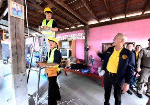 Mr. Phiphat said that the summer storm on May 3 in Nong Bua Lamphu Province affected five districts, namely Na Klang, Suwannakhuha, Mueang, Si Bunrueang, and Non-Sang, with the most severely damaged areas being Na Klang and Suwannakhuha Districts. A total of 1,913 houses were damaged. It was the most severe storm in 70 years. The Ministry of Labour has worked with all sectors in the Nong Bua Lamphu area to provide initial assistance. The first house is the house of Mr. Panlop Srimantha. The Ministry of Labour’s Department of Skill Development has integrated with all sectors to help repair houses affected by the storm. They have used metallic sheets donated by Sang Thai Company to repair the homes, with technicians from the Disaster Relief Center. The second house was the house of Mrs. Yard Kulsri. The Department of Skill Development has sent an electrician to repair the damages, including damaged wires, switches, and plugs, so that they can be used. This house has a bedridden patient living there. The third house is the house of Mrs. Pranee Chumphon. Three people were injured in the storm because the house wall fell on them. The injuries to the body were not severe overall. For this house, the Department of Skill Development has sent a team of technicians to install electrical wiring and light bulbs so they can be used normally.