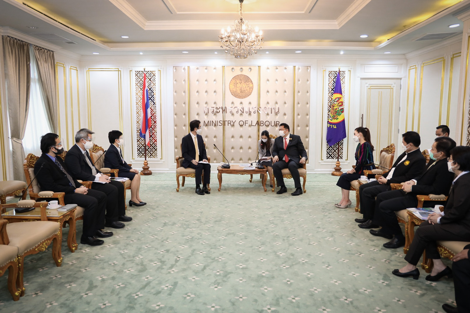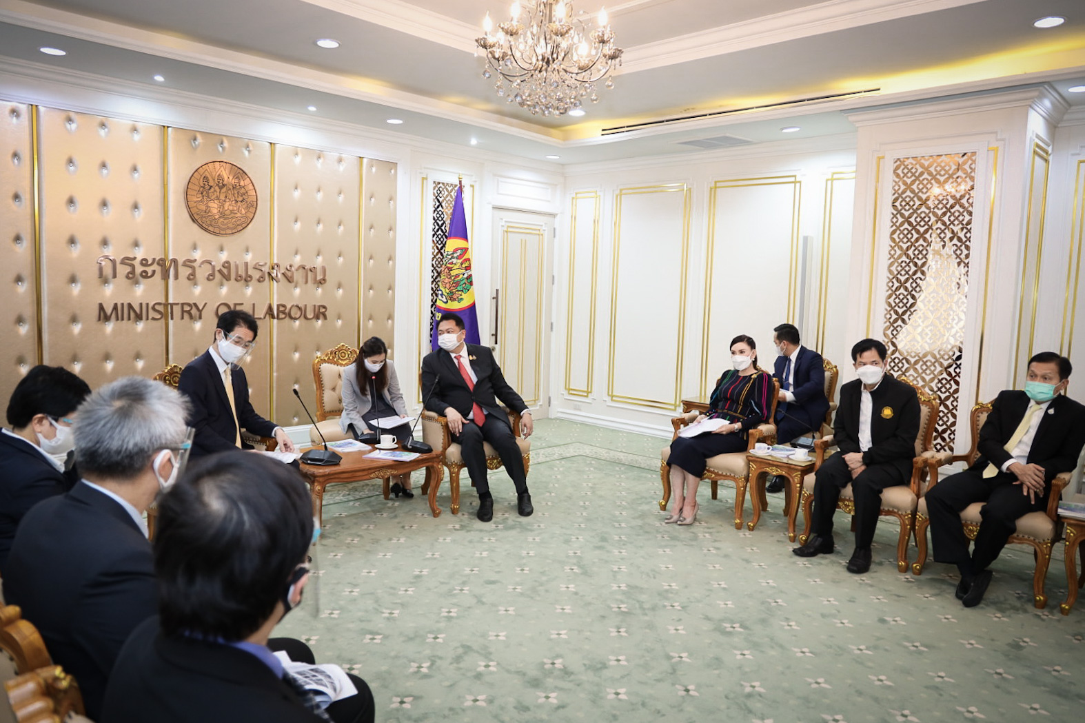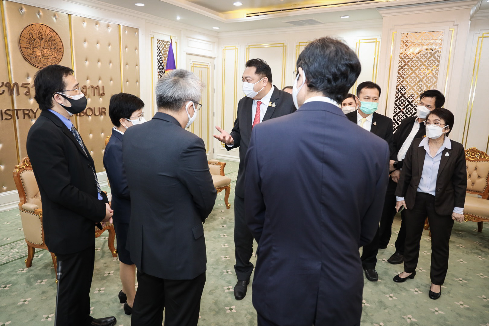 On August 25, 2021, at 14.00 hours, Labour Minister Mr. Suchart Chomklin welcomed Mr. Tetsu Shiozaki, President of Southeast Asia for NMB-Minebea Thai Co., Ltd., and delegation, who requested to meet and discuss the allocation of vaccines for employees. Advisor to the Labour Minister Mrs. Thiwalrat Angkinan, the Labour Minister’s Secretariat Mr. Suthep Chitvong, the Ministry of Labour’s Spokesperson (on politics) Mrs. Theanrat Nawamawat, Permanent Secretary of Labour Mr. Suthi Sukosol, and the Ministry of Labour’s senior executives also participated in this event at the Chatumongkol Room, 6th floor, Ministry of Labour.